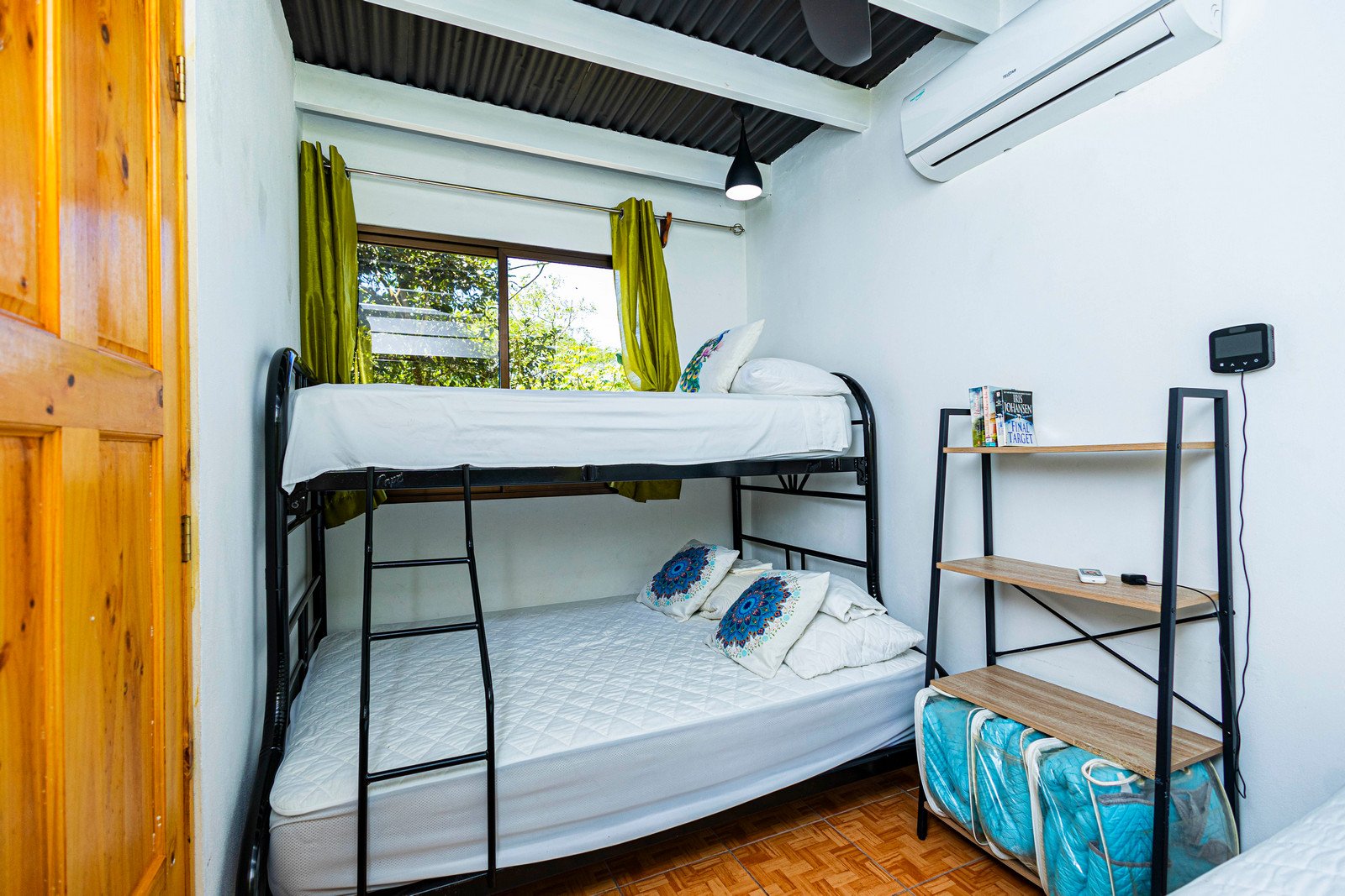 Queen bed plus bunk room with full bottom bunk, twin top bunk, and an additional twin bed (sleeps up to 6)