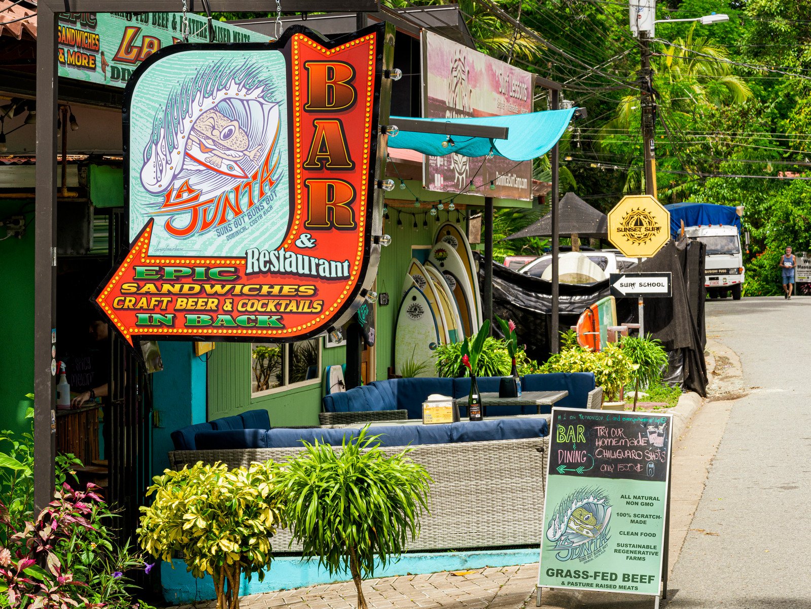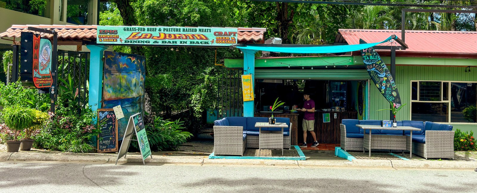 La Junta has built an excellent reputation and is currently ranked #1 on TripAdvisor in Dominical, with outstanding reviews and strong visibility on Google. The restaurant is well known for its delicious sandwiches, creative menu, and exceptional cocktails. It features a full bar with a bartender preparing signature drinks and cocktails, making it a popular spot for both visitors and locals.