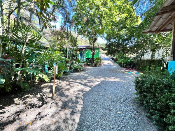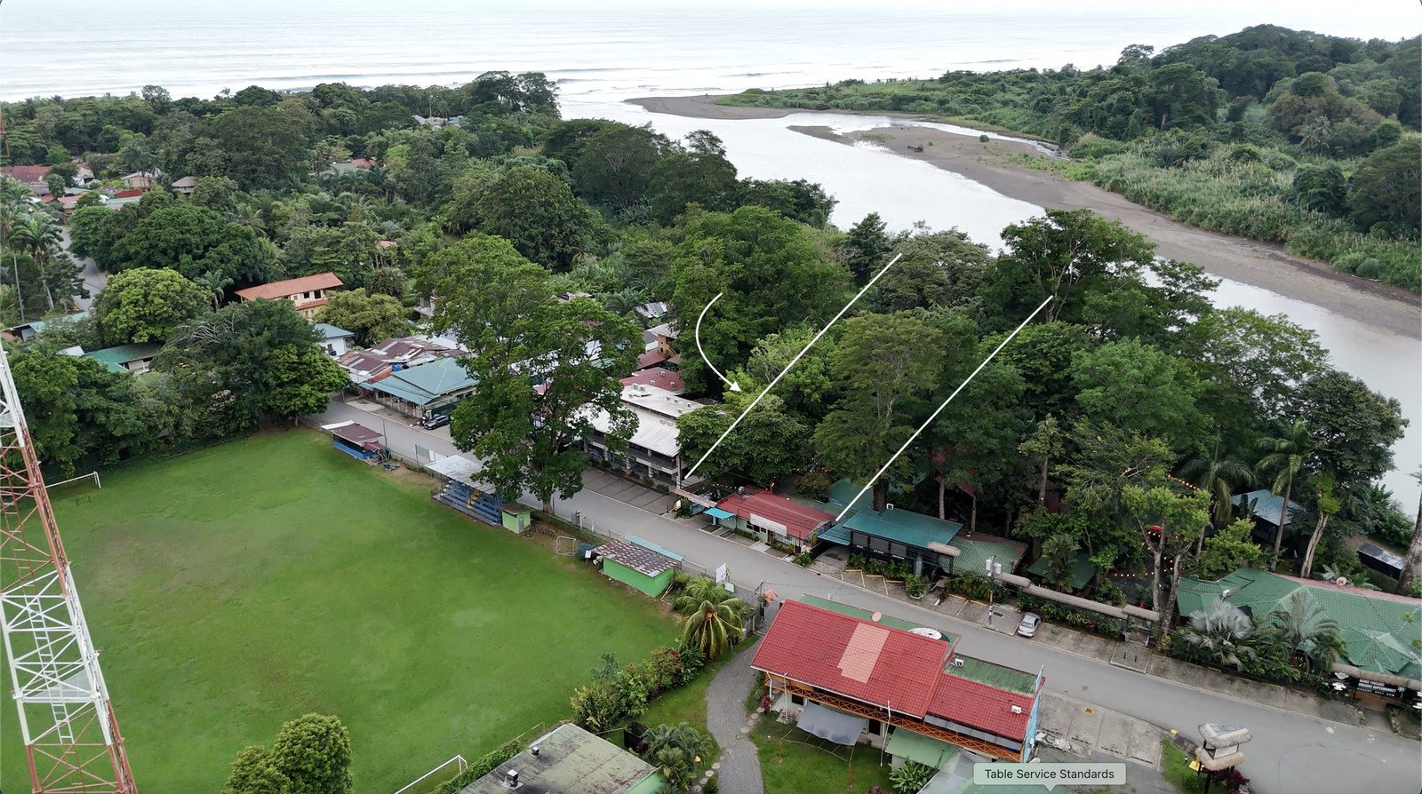 At the front of the property is La Junta Restaurant, located directly on Dominical’s main street where nearly all pedestrian and vehicle traffic passes through town.