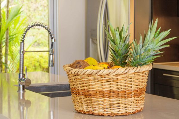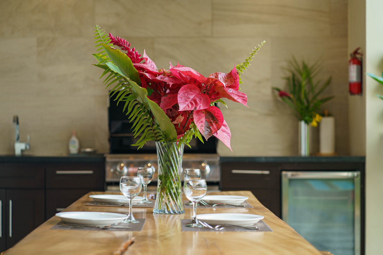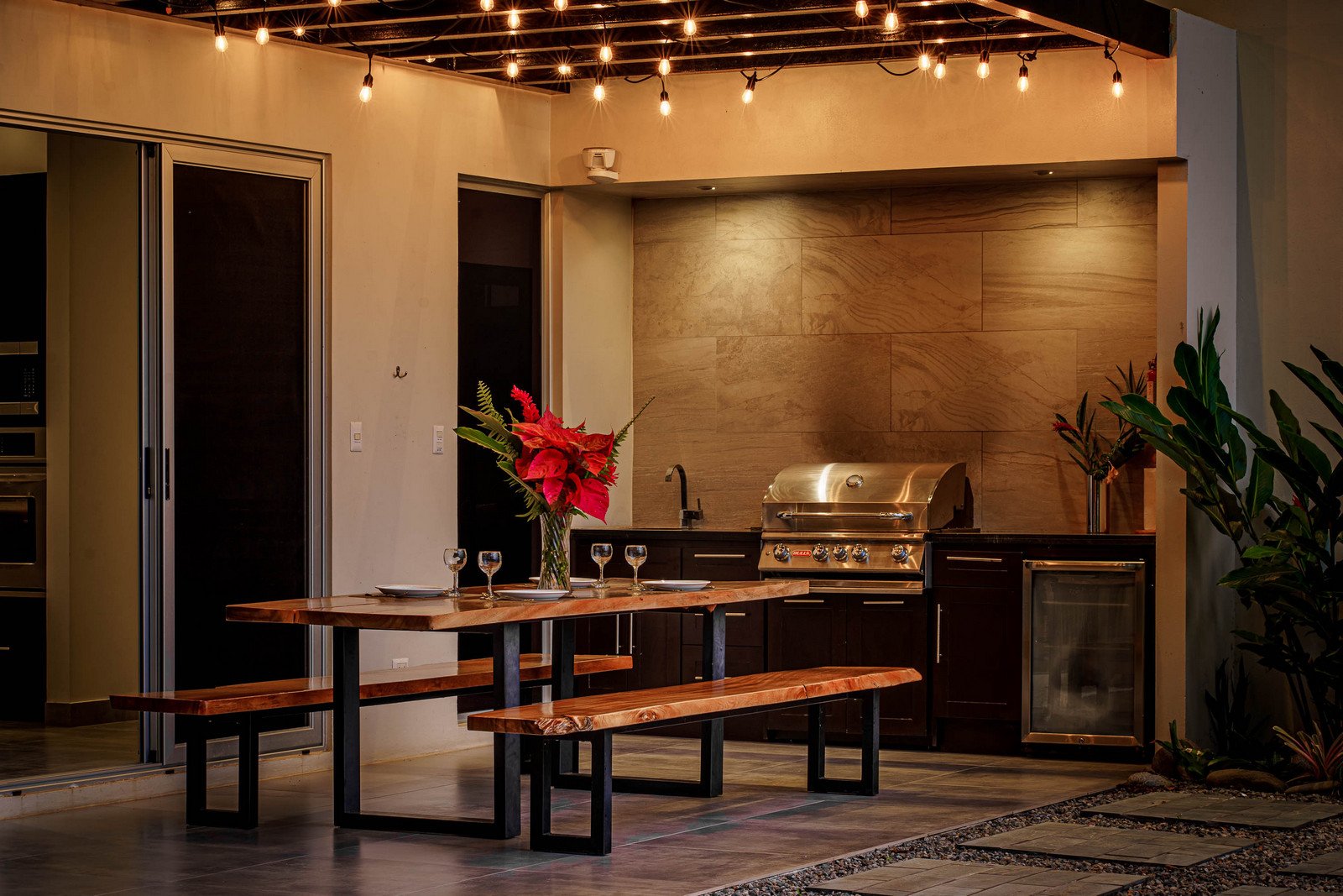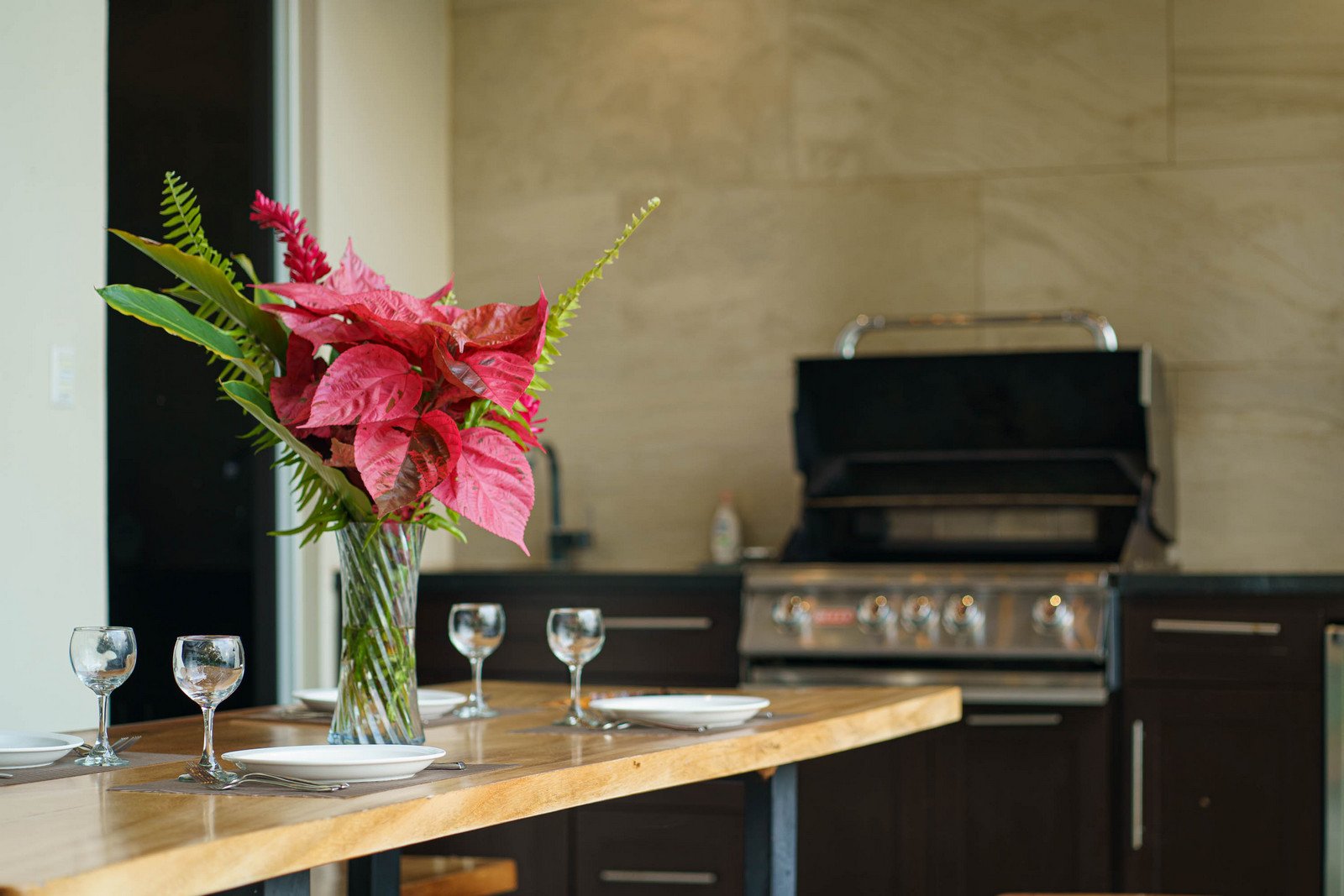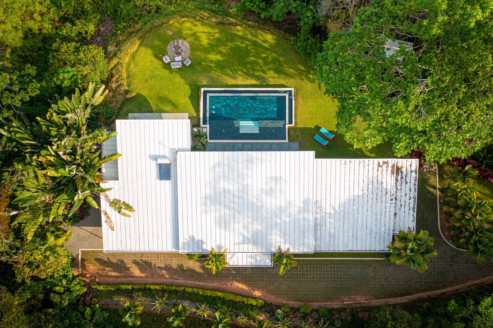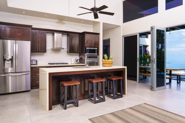 The kitchen, complete with a quartz waterfall island, allows hosts and guests to gather effortlessly after days spent exploring the beaches, waterfalls, and rainforest adventures nearby. Outdoors, a fully equipped kitchen and grill station complement the spacious dining and lounge areas, all set against a backdrop of endless ocean.