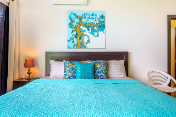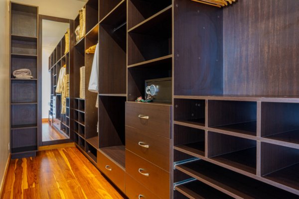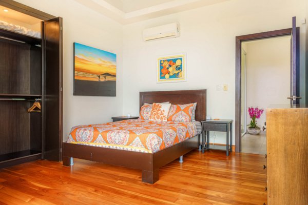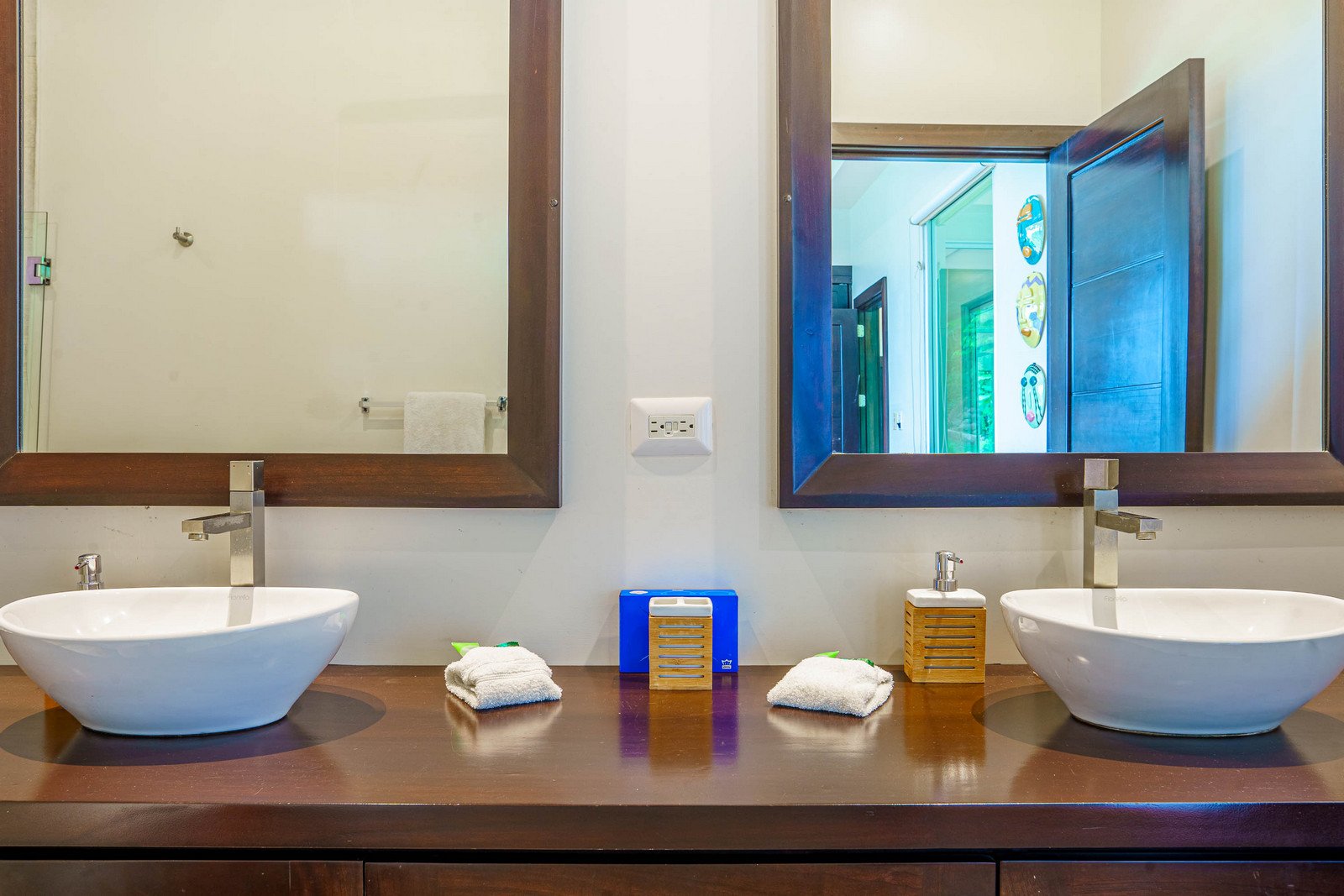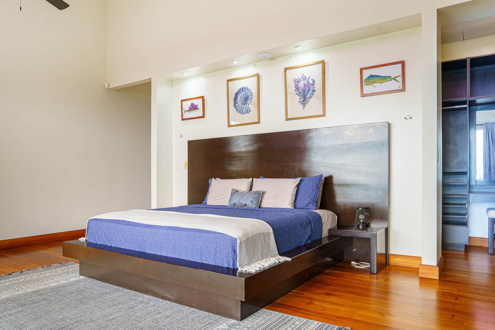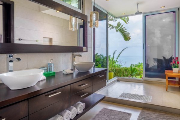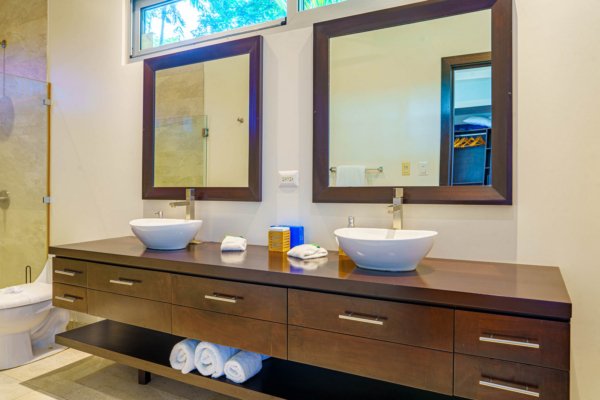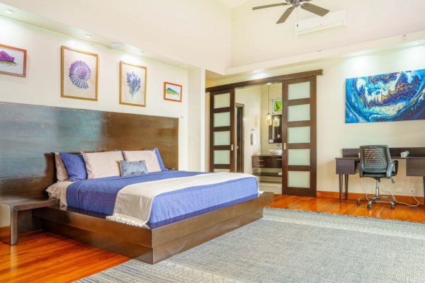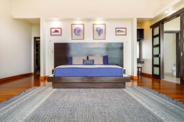 Each of the three suites offers a private retreat, featuring rich teak flooring, expansive ocean views, and spa-inspired ensuite bathrooms with rain showers, double vanities, and impeccable finishes. Designed with a split floor plan, the principle bedroom is positioned on one side of the home, creating a private oasis where large glass doors retract to bring nature into your mornings or enhance the tranquility of a spa-like shower, and a large walk-in closet with dressing table. On the opposite side, two spacious guest suites offer comfort and privacy, ensuring a serene and secluded experience for family and visitors. Every space is designed to provide the perfect balance of comfort, privacy, and natural beauty.