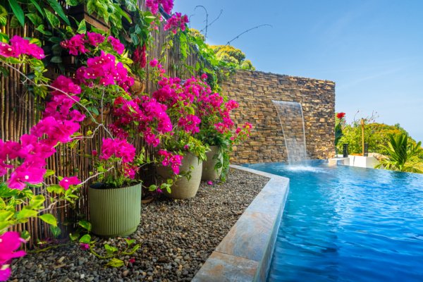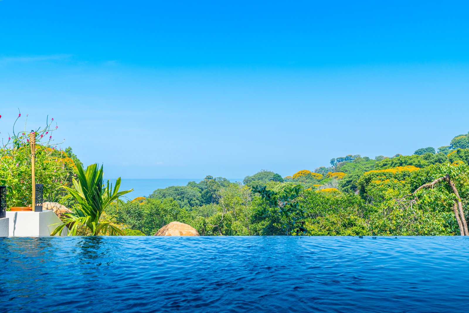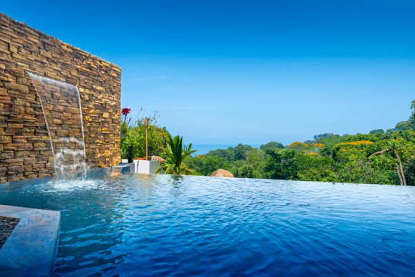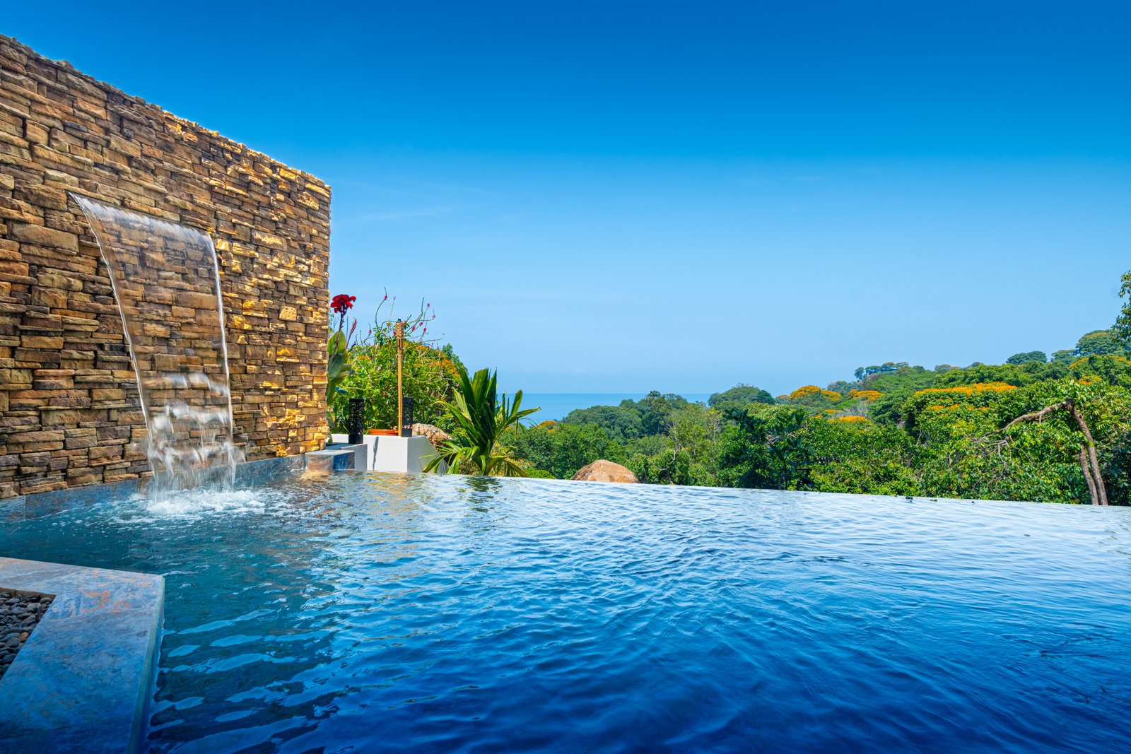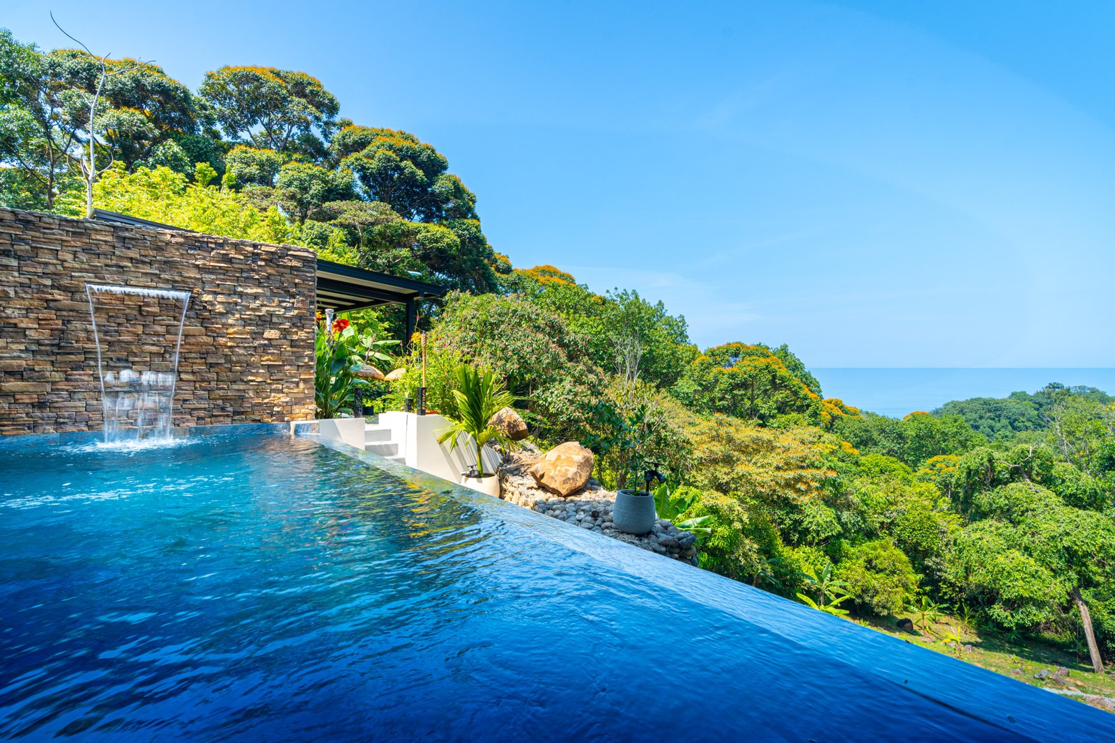 - Outdoor Oasis: The outdoor area features a serene infinity-edge pool with a waterfall, surrounded by ample space for lounging and enjoying the ocean and sunset views and expansive garden valley below.