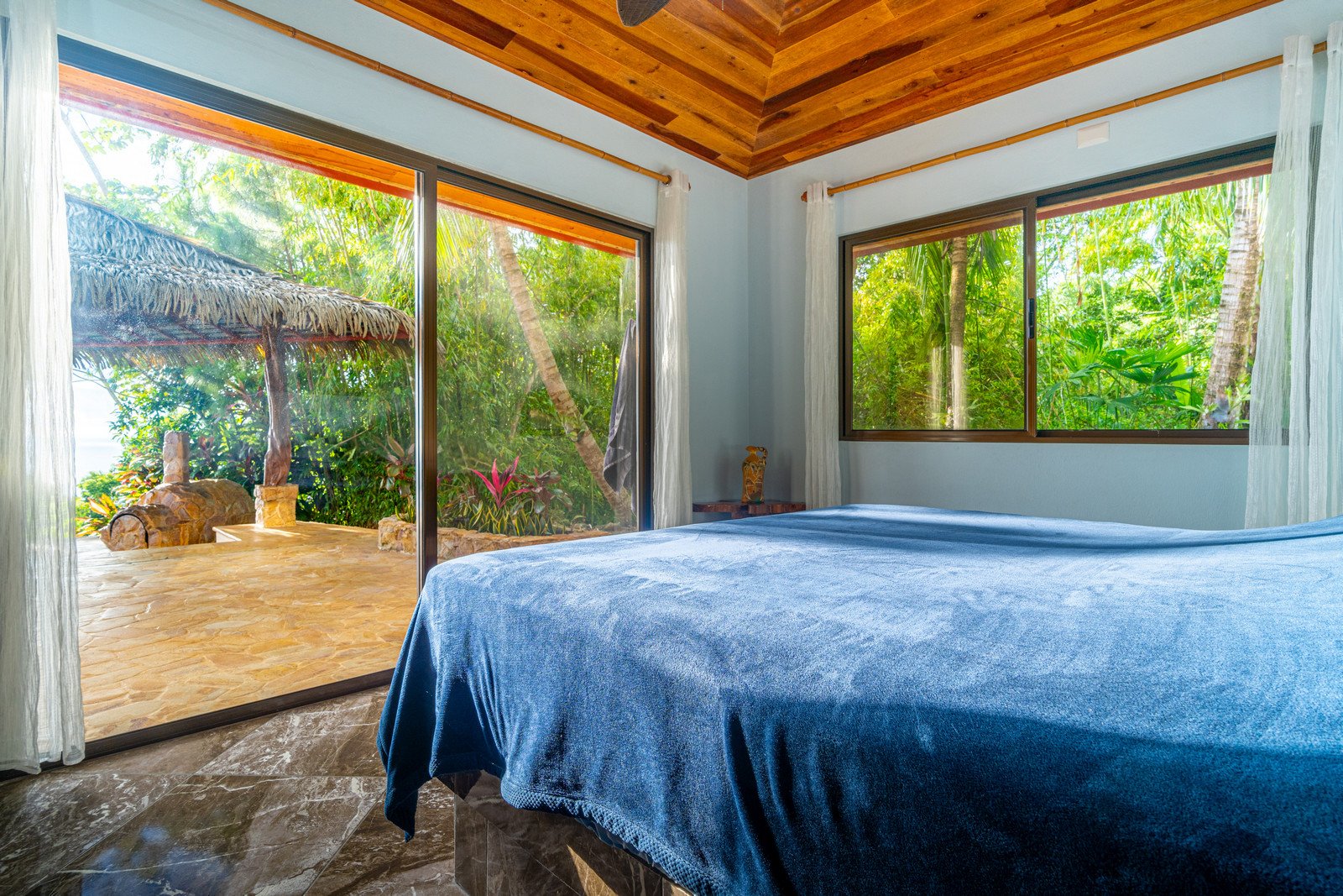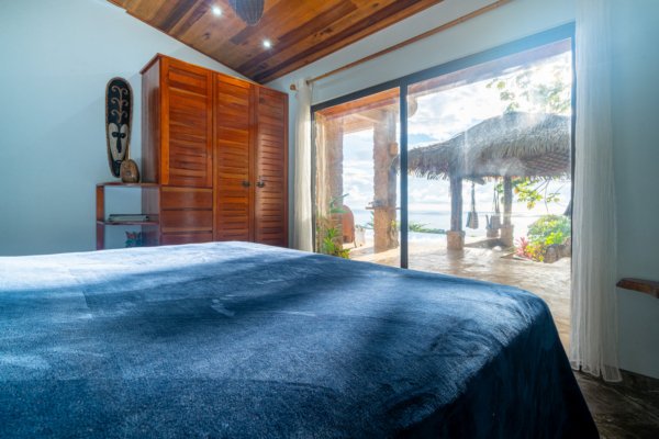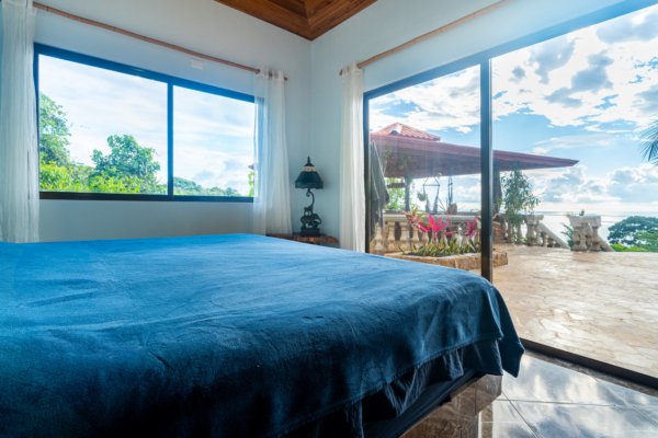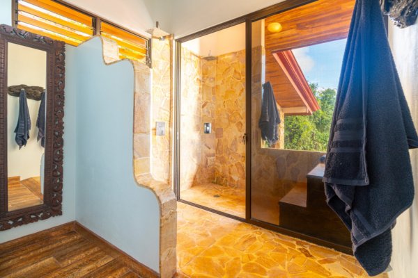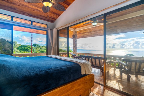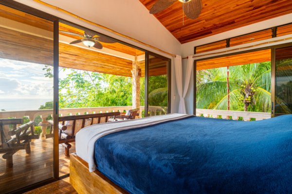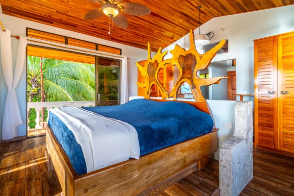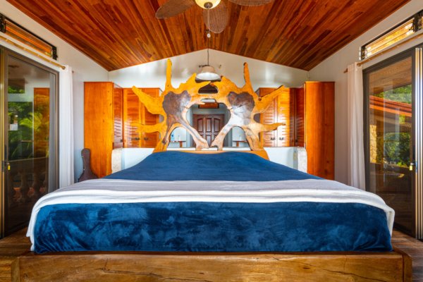 The estate features four king-sized bedrooms, each with its own ensuite bathroom, offering luxurious accommodations for you and your guests. The master suite, with its heart-shaped purpleheart hardwood headboard and panoramic glass doors, feels as though it is floating above the jungle canopy. From your elevated king-sized bed, you can watch the ocean stretch out before you, while the soft rustle of leaves and the distant crash of waves lull you into a peaceful slumber.