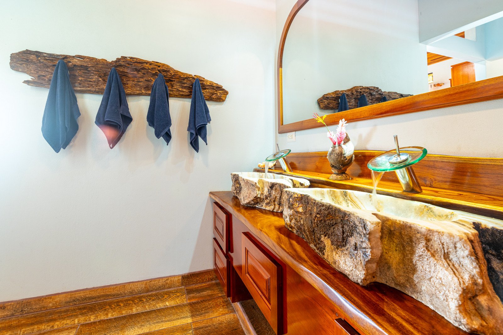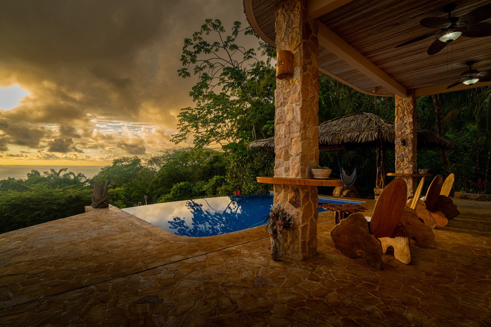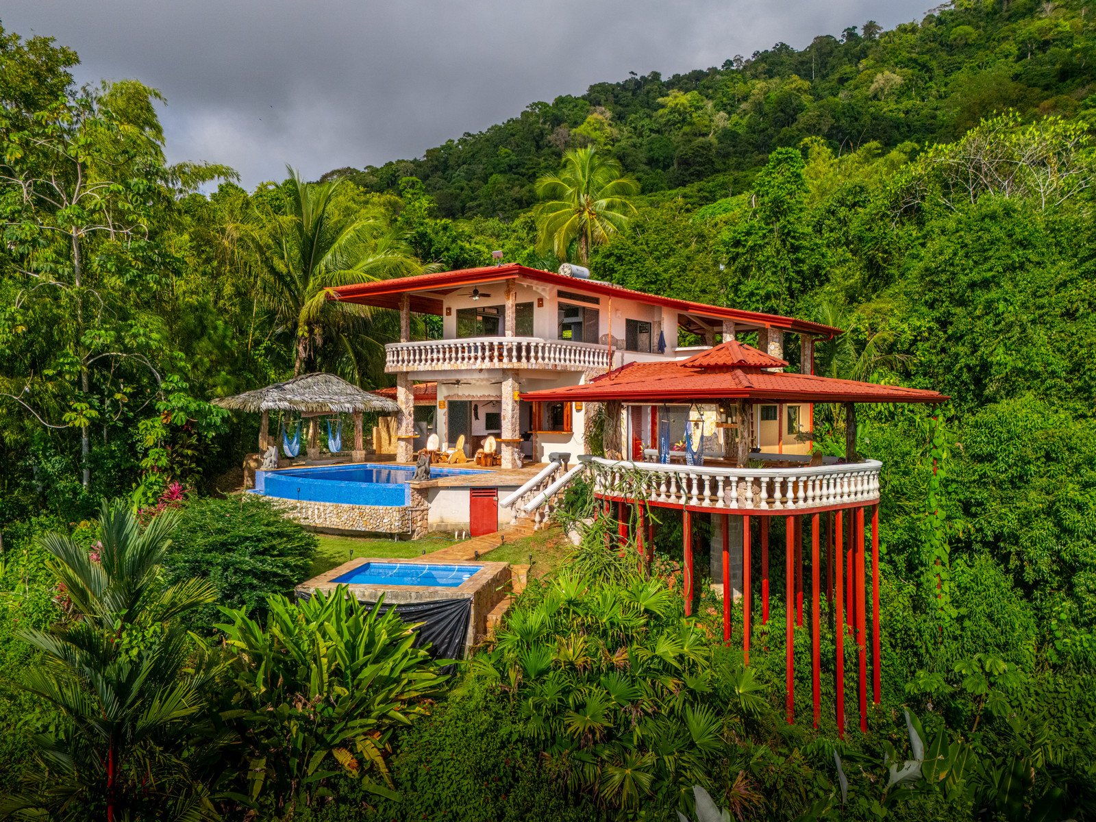 The estate features four king-sized bedrooms, each with its own ensuite bathroom, offering luxurious accommodations for you and your guests. The master suite, with its heart-shaped purpleheart hardwood headboard and panoramic glass doors, feels as though it is floating above the jungle canopy. From your elevated king-sized bed, you can watch the ocean stretch out before you, while the soft rustle of leaves and the distant crash of waves lull you into a peaceful slumber.
