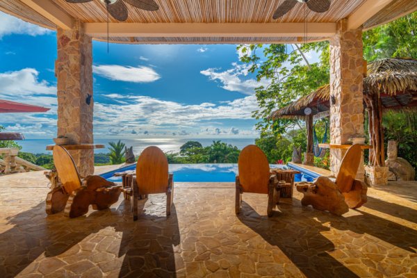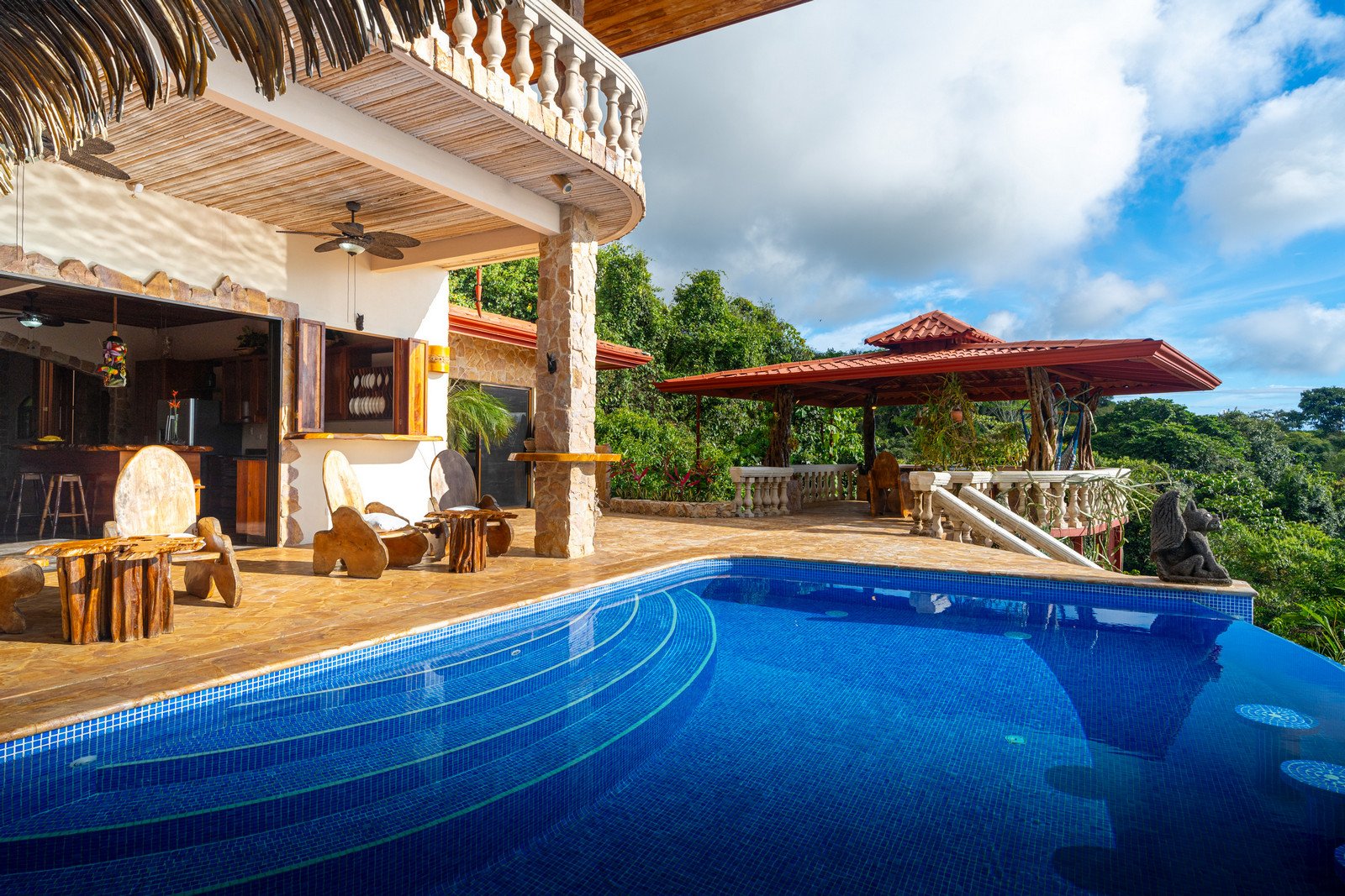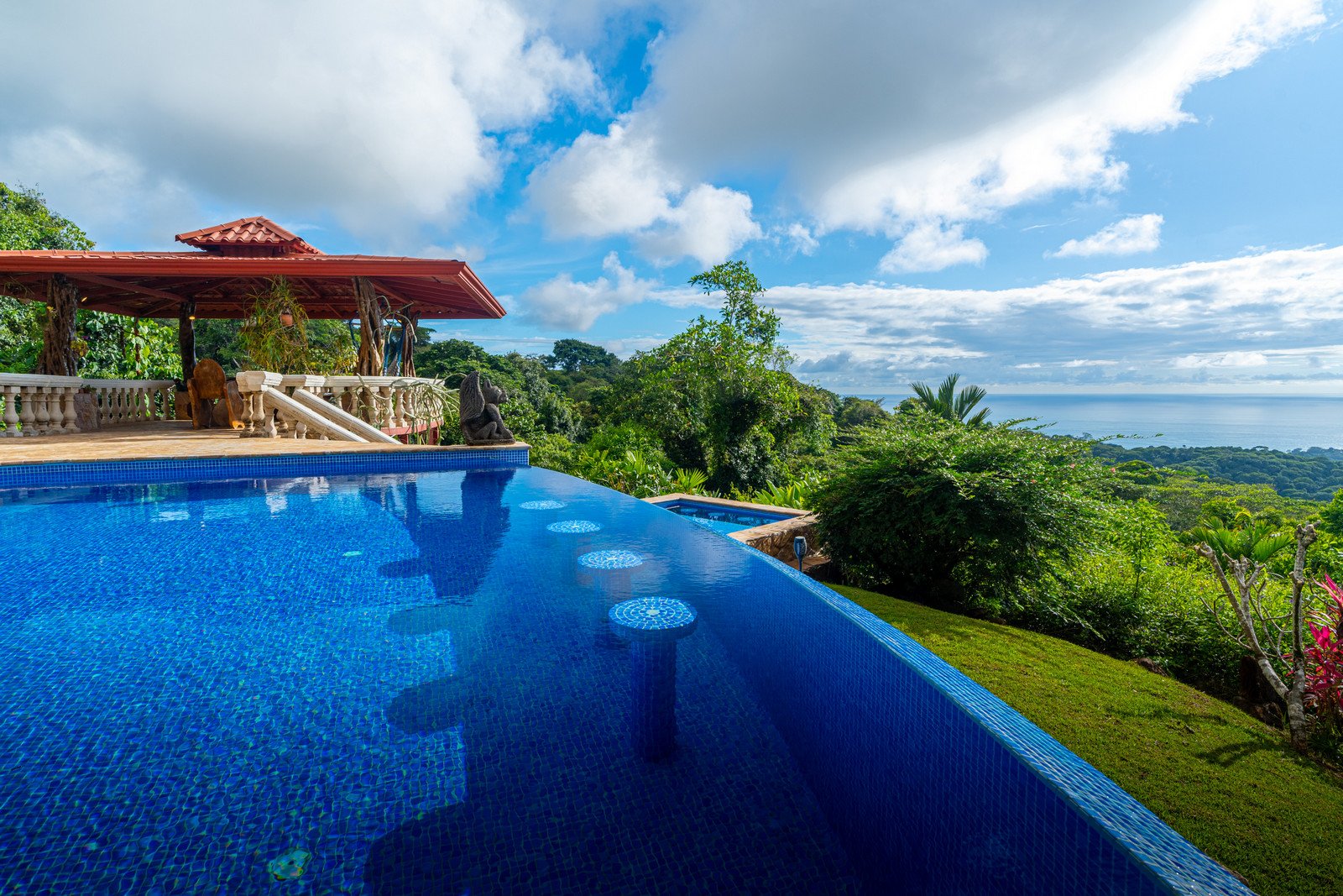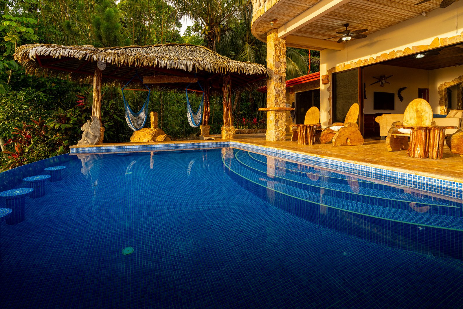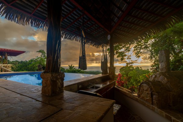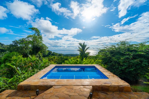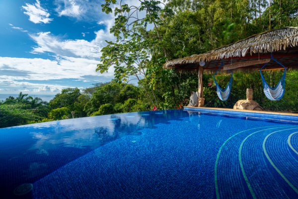 One of the estate’s most enchanting features is the outdoor living space. The infinity-edge pool, tiled in a vibrant blue that mirrors the sky and ocean, is the perfect place to unwind as you watch whales breach in the distance or marvel at the playful antics of monkeys and sloths in the surrounding trees. The pool is complemented by a hot tub lounge, where you can relax under the stars, feeling the warmth of the water and the coolness of the mountain breeze.