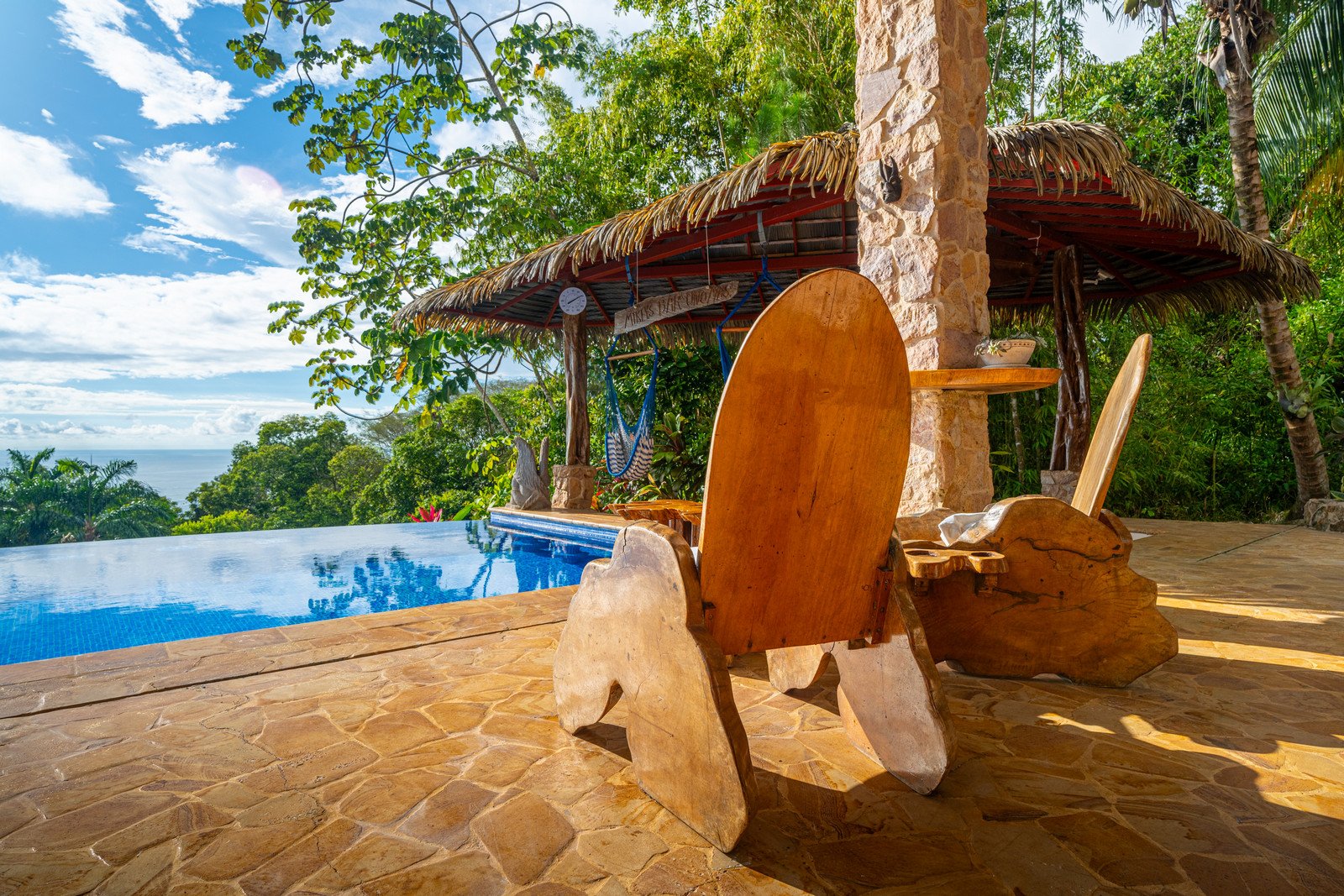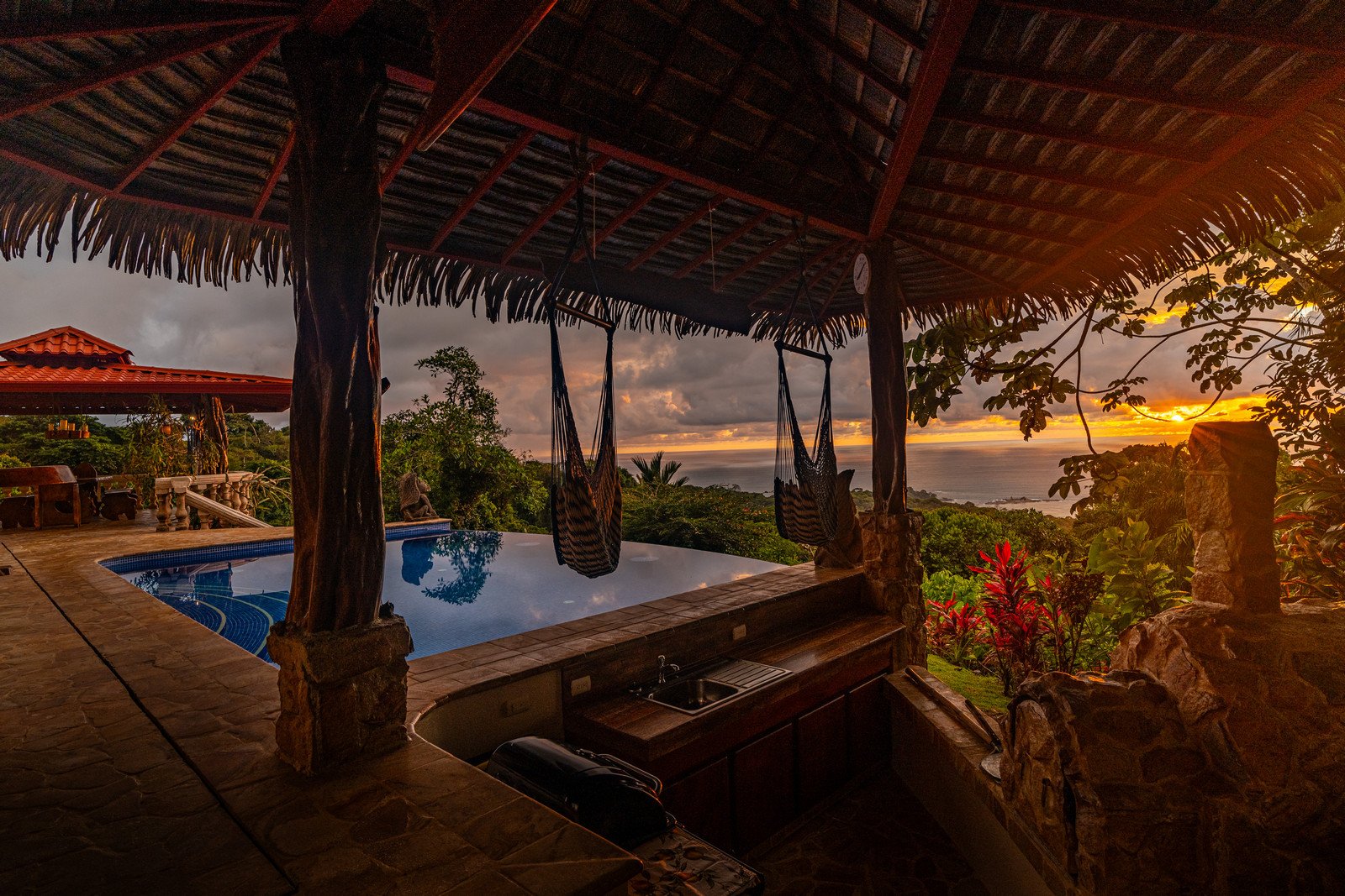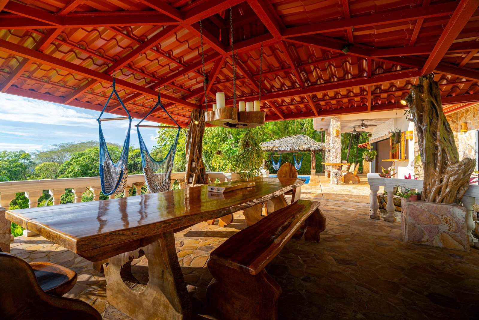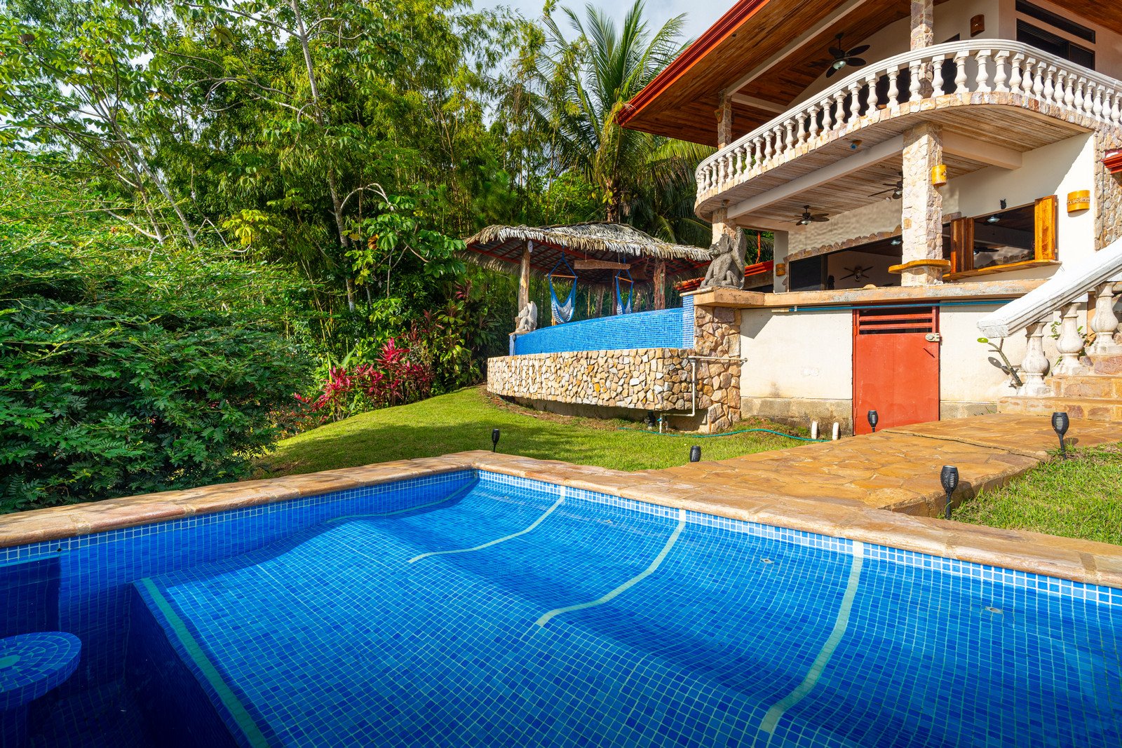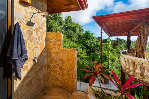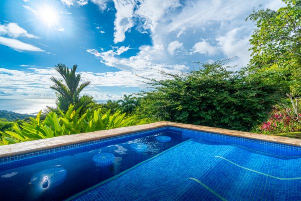 One of the estate’s most enchanting features is the outdoor living space. The infinity-edge pool, tiled in a vibrant blue that mirrors the sky and ocean, is the perfect place to unwind as you watch whales breach in the distance or marvel at the playful antics of monkeys and sloths in the surrounding trees. The pool is complemented by a hot tub lounge, where you can relax under the stars, feeling the warmth of the water and the coolness of the mountain breeze.