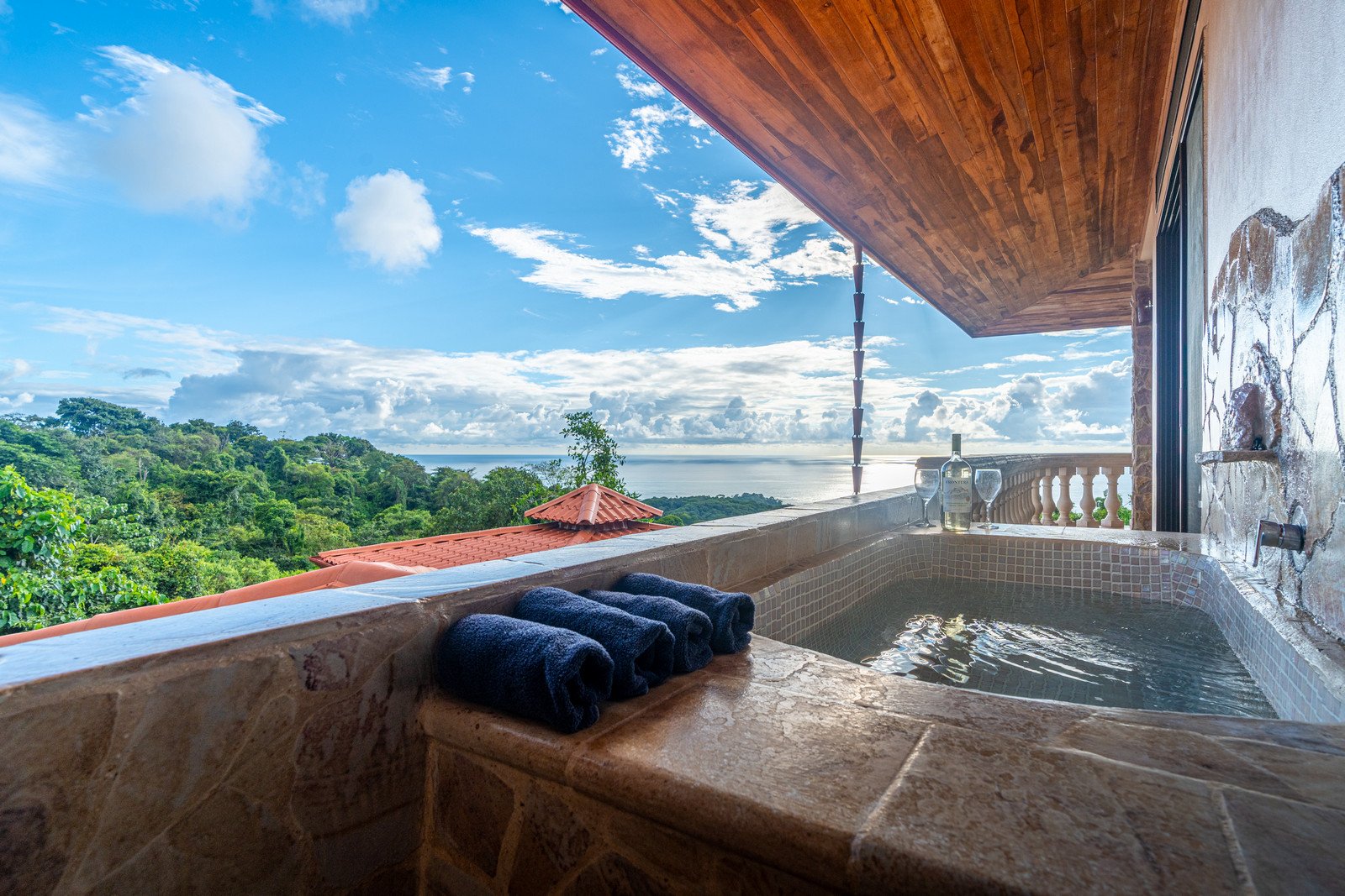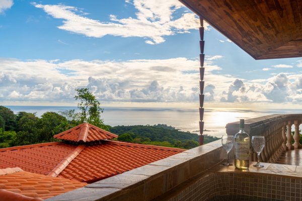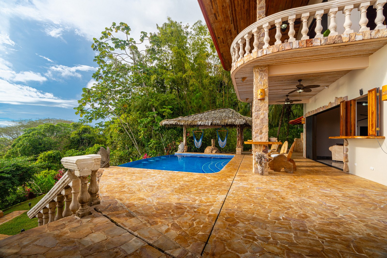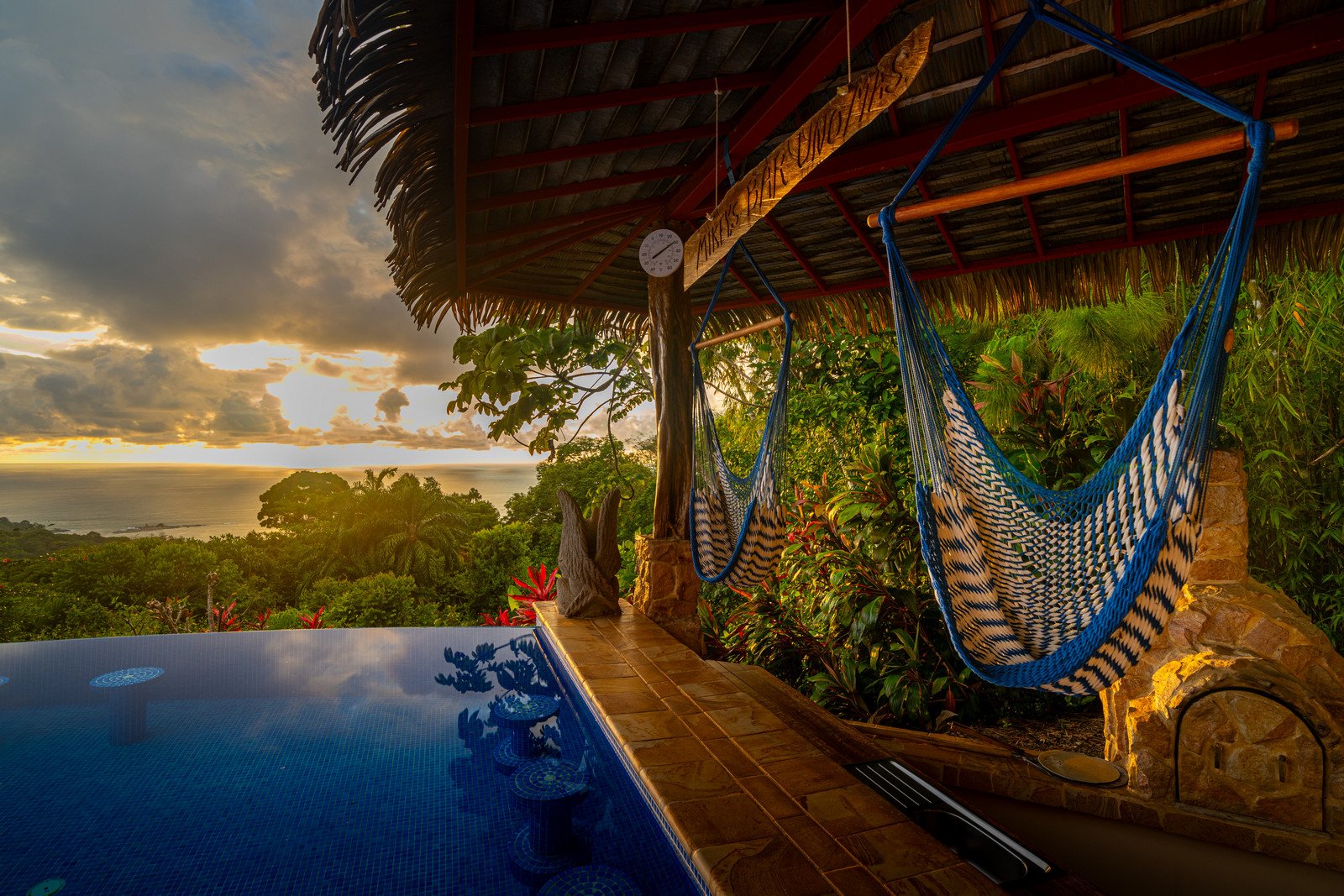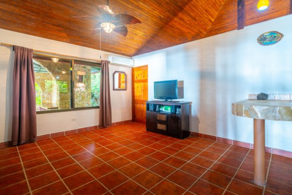 One of the estate’s most enchanting features is the outdoor living space. The infinity-edge pool, tiled in a vibrant blue that mirrors the sky and ocean, is the perfect place to unwind as you watch whales breach in the distance or marvel at the playful antics of monkeys and sloths in the surrounding trees. The pool is complemented by a hot tub lounge, where you can relax under the stars, feeling the warmth of the water and the coolness of the mountain breeze.