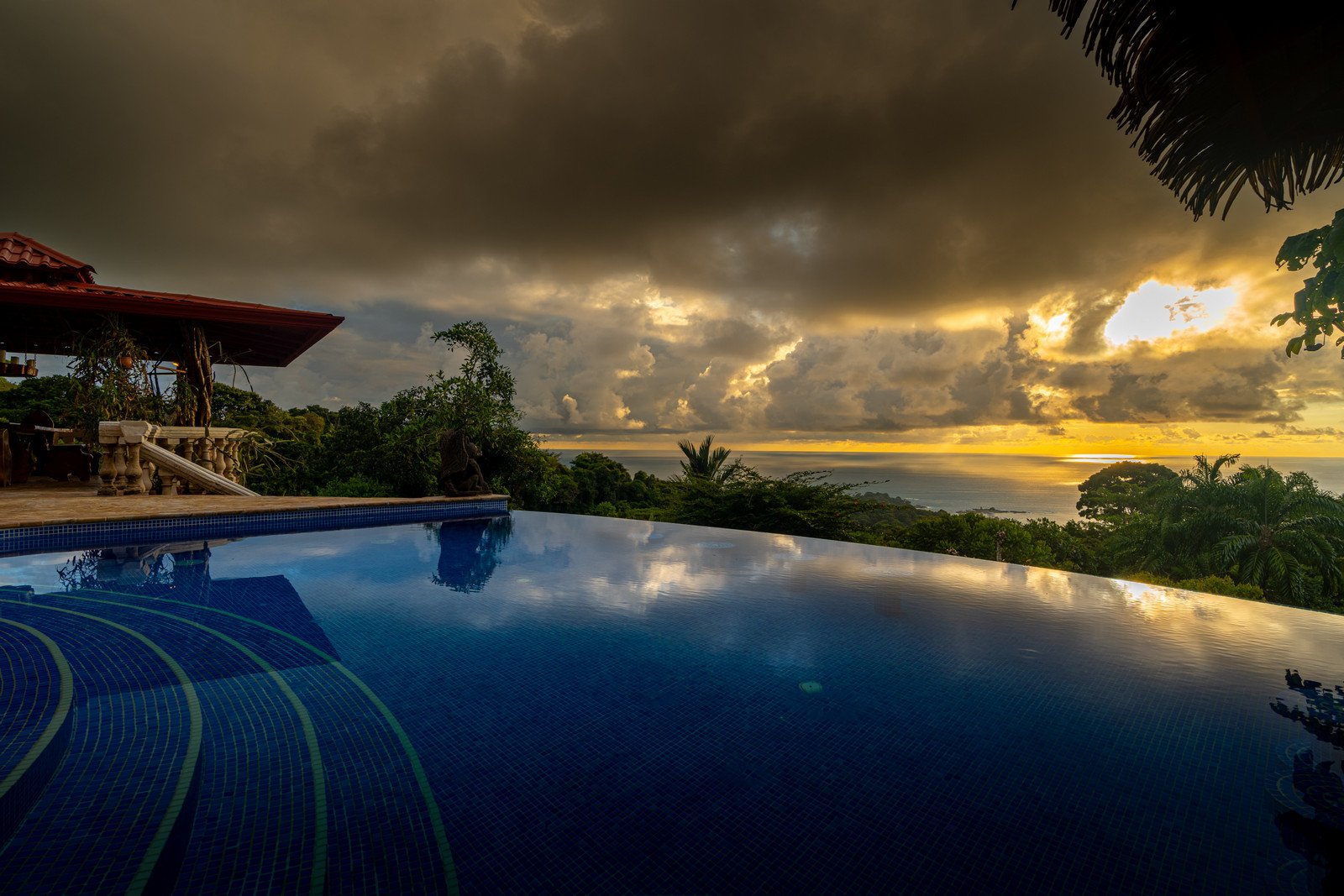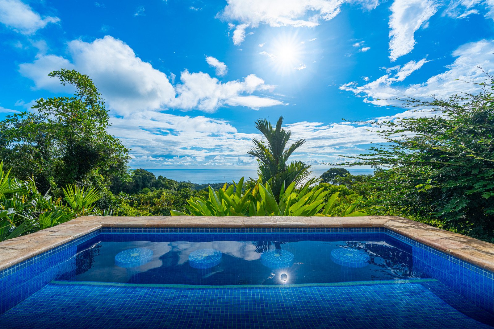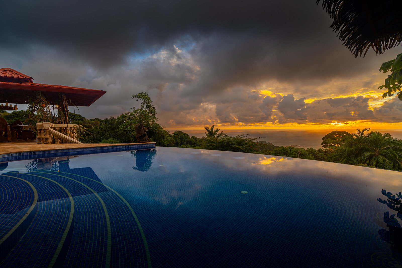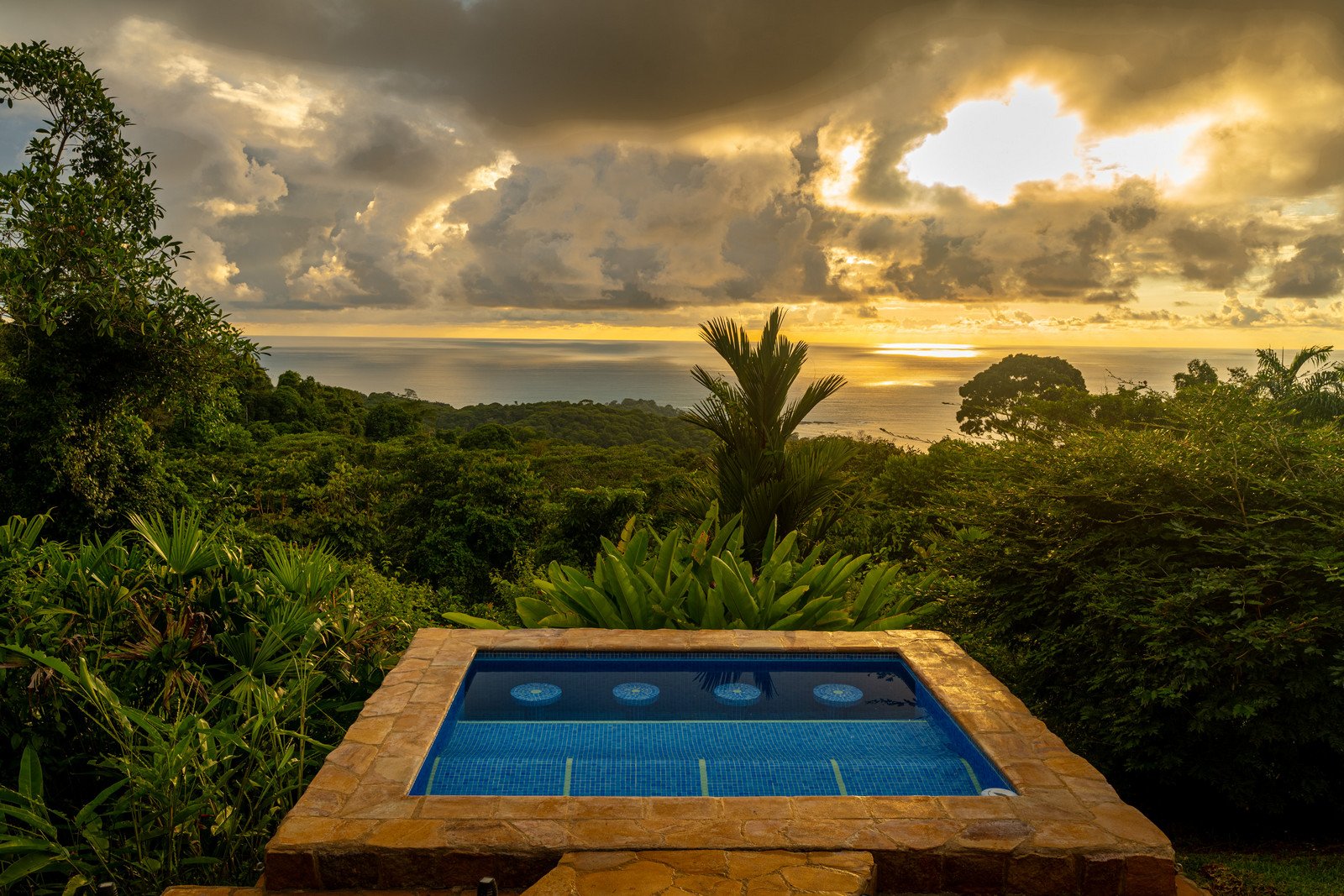 One of the estate’s most enchanting features is the outdoor living space. The infinity-edge pool, tiled in a vibrant blue that mirrors the sky and ocean, is the perfect place to unwind as you watch whales breach in the distance or marvel at the playful antics of monkeys and sloths in the surrounding trees. The pool is complemented by a hot tub lounge, where you can relax under the stars, feeling the warmth of the water and the coolness of the mountain breeze.