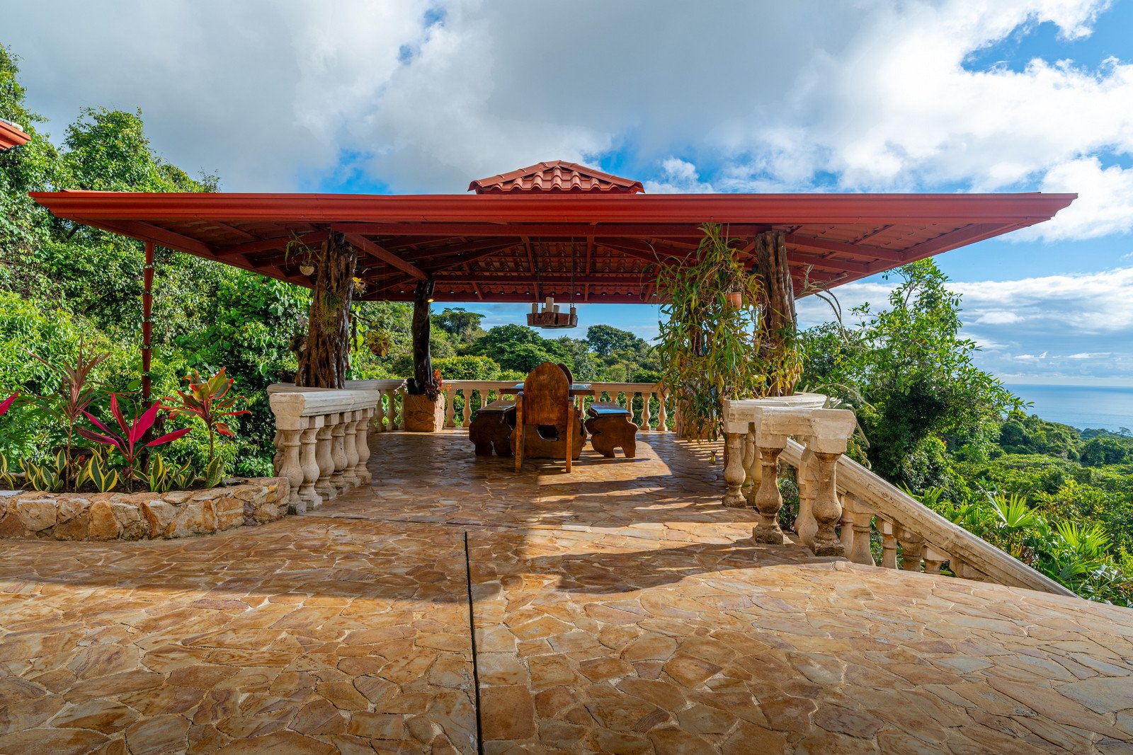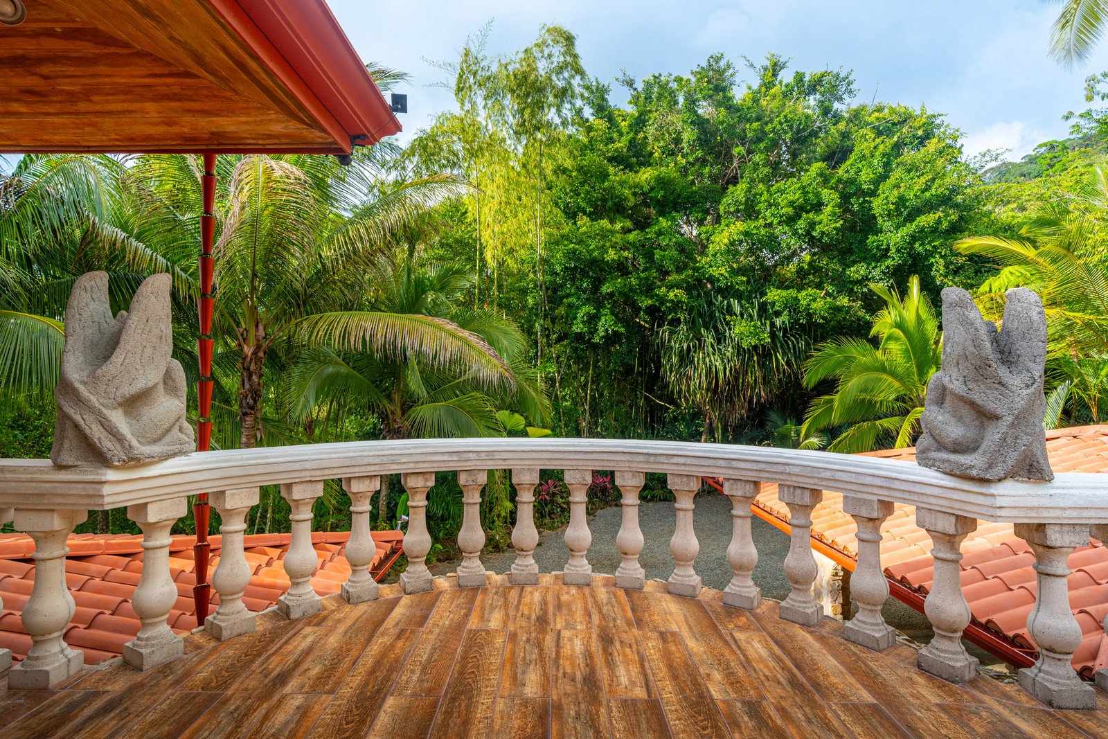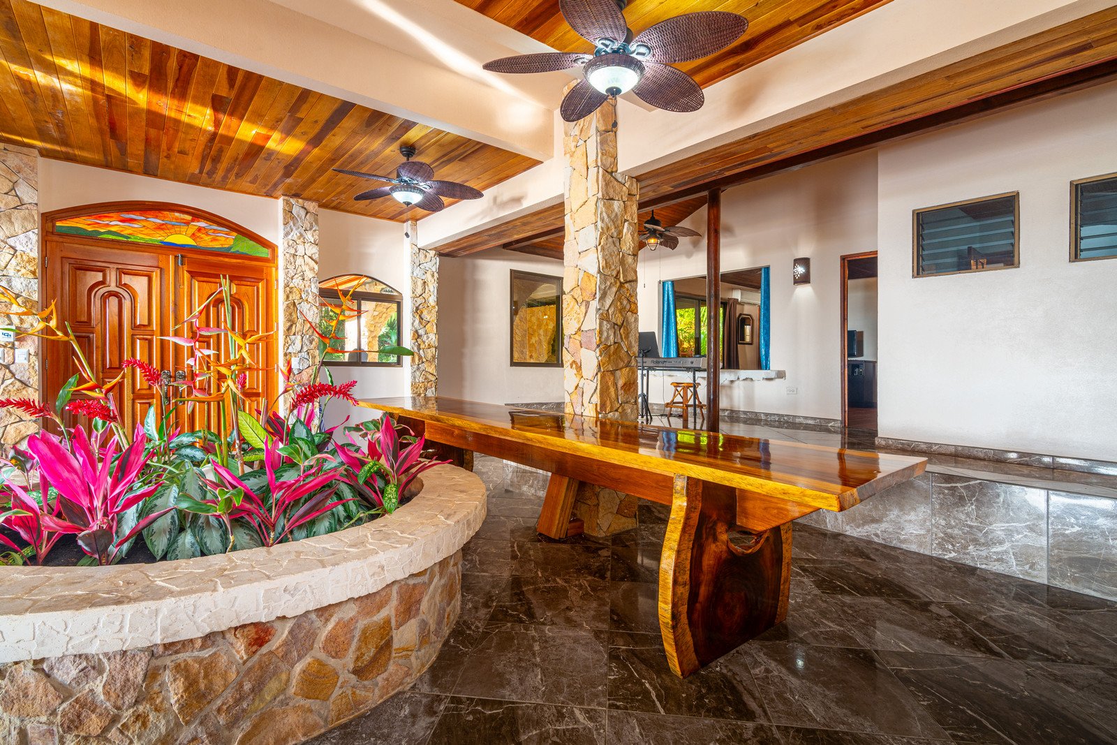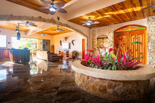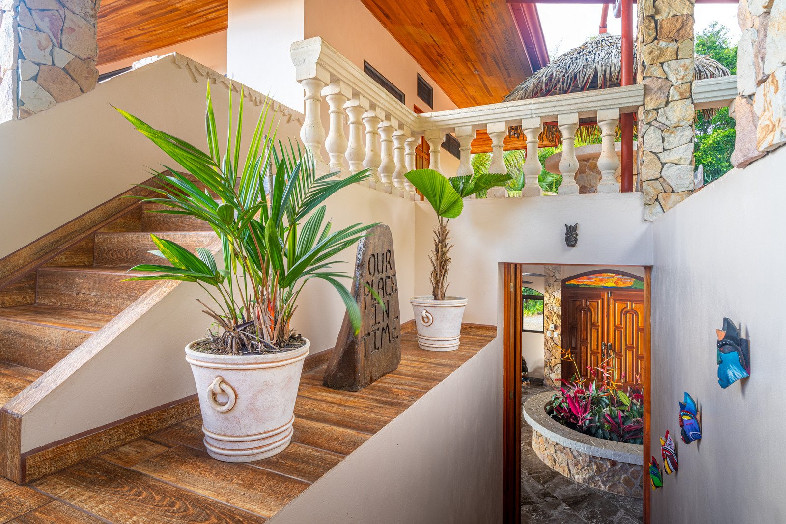 As you approach this enchanting estate, you are greeted by the sight of a beautiful stone exterior, crowned by a roof of low-maintenance Teja Real tiles that keep the home cool and comfortable year-round. A private hardwood gate opens to reveal a driveway lined with swaying palm trees, pineapples, and vibrant tropical flowers, guiding you to the entrance of this dream home.