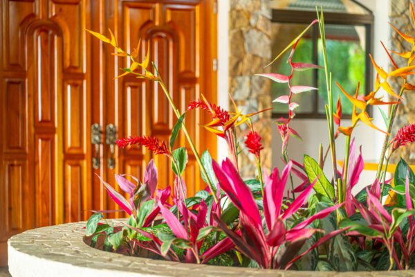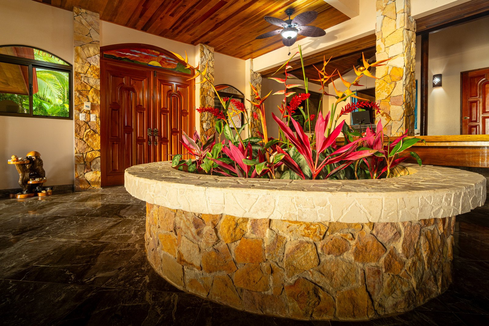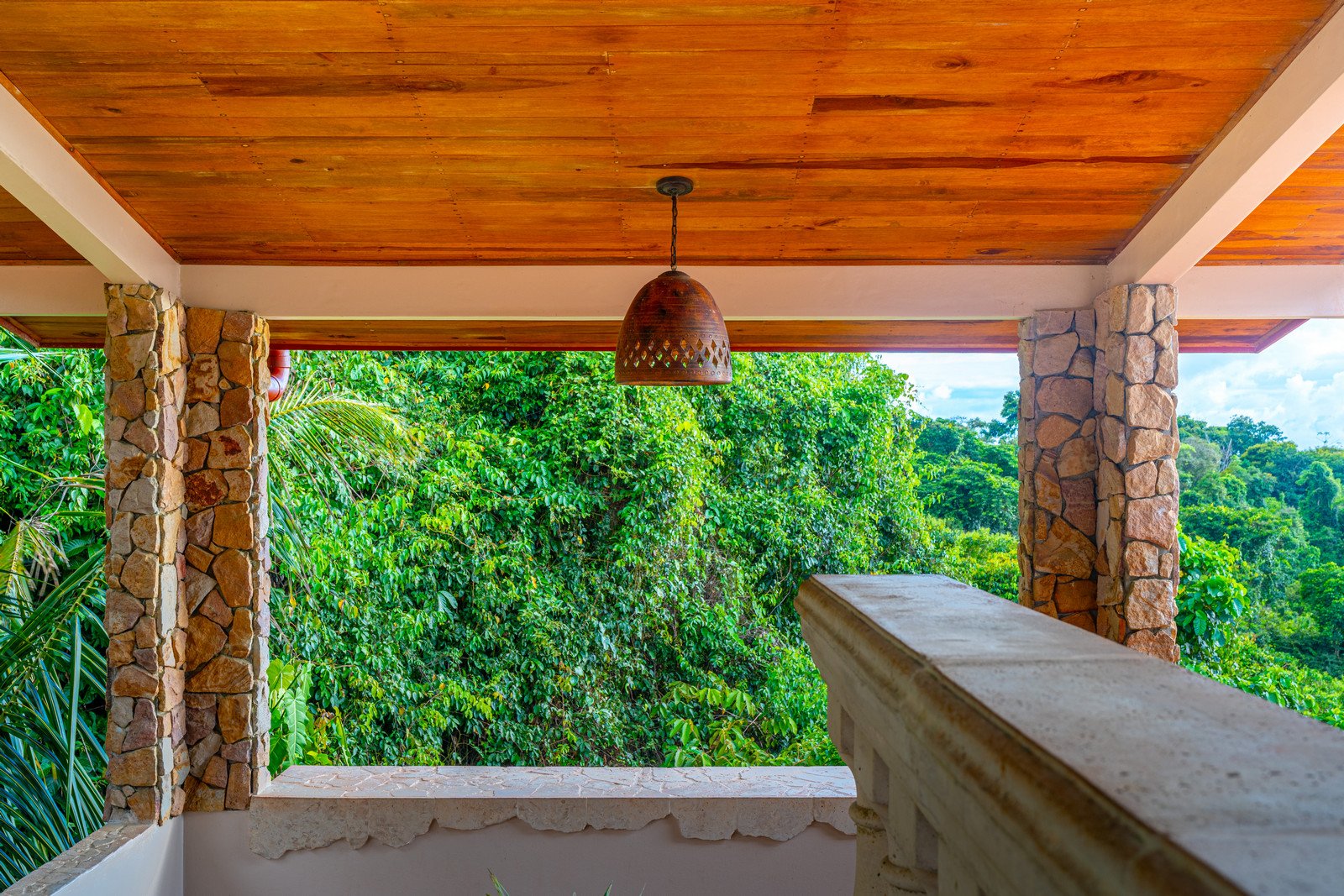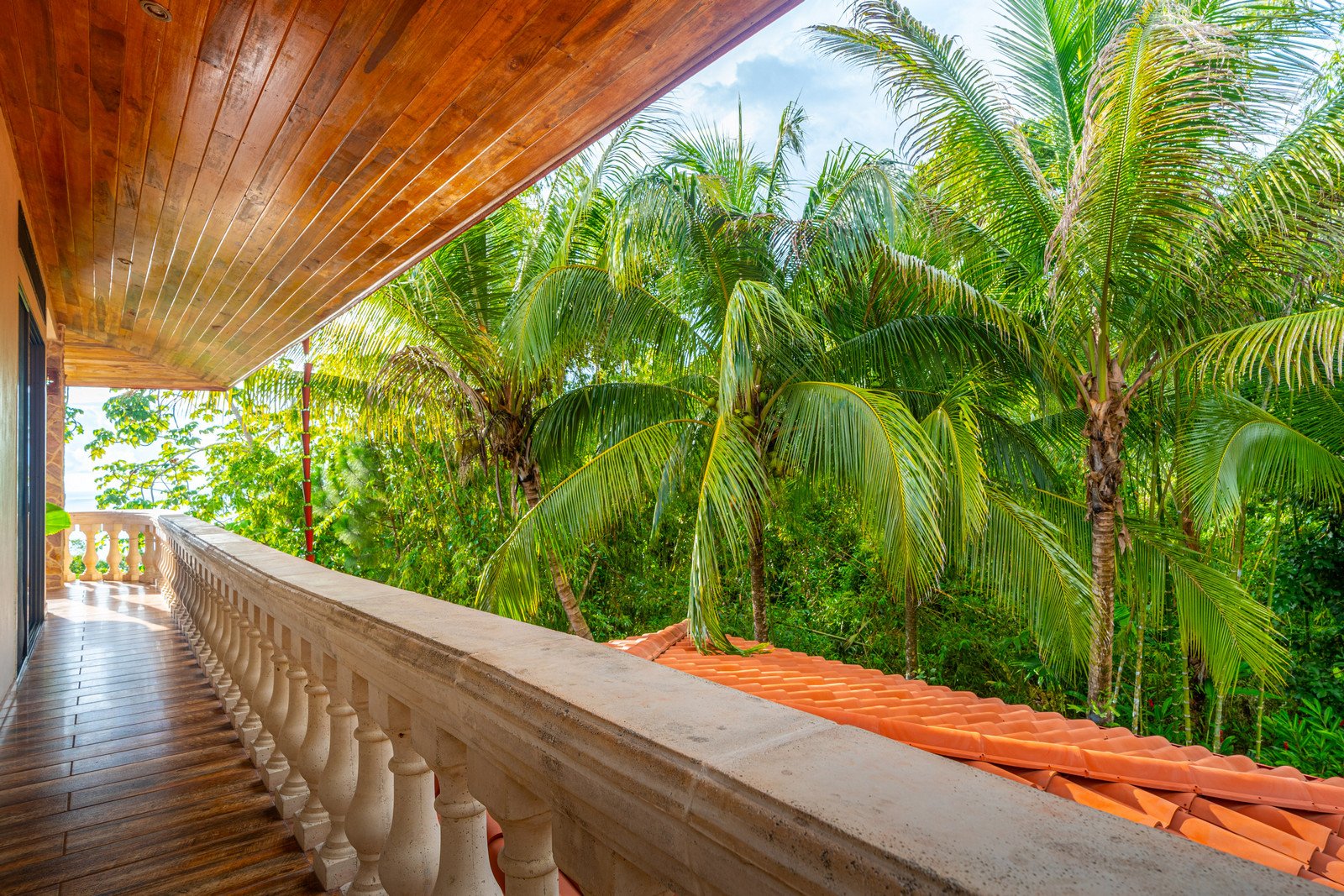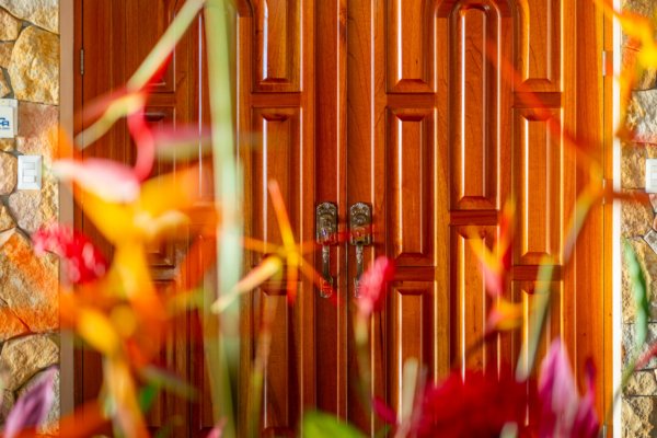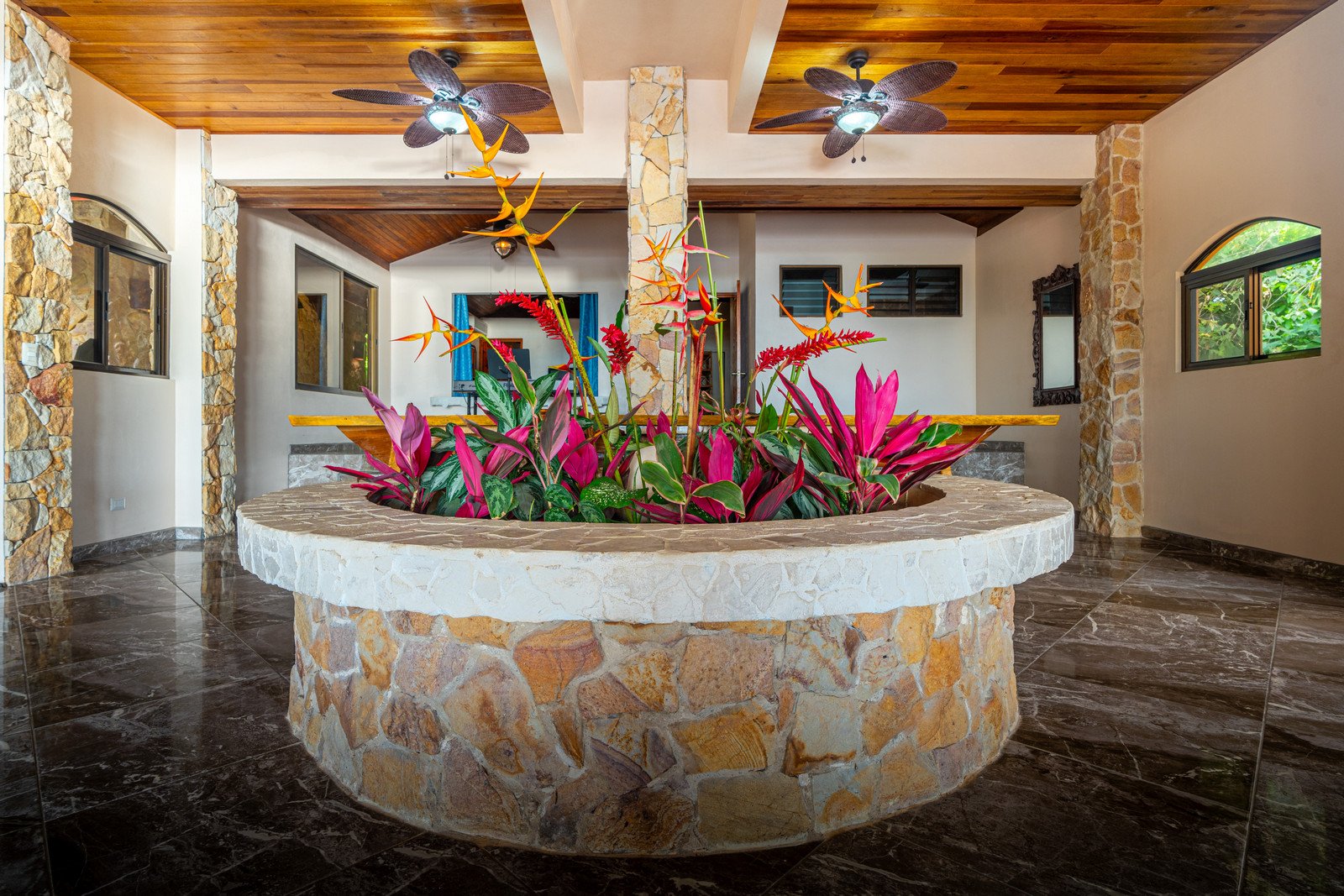 As you approach this enchanting estate, you are greeted by the sight of a beautiful stone exterior, crowned by a roof of low-maintenance Teja Real tiles that keep the home cool and comfortable year-round. A private hardwood gate opens to reveal a driveway lined with swaying palm trees, pineapples, and vibrant tropical flowers, guiding you to the entrance of this dream home.