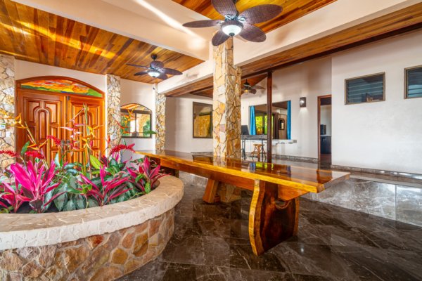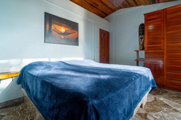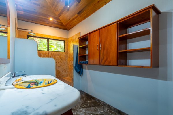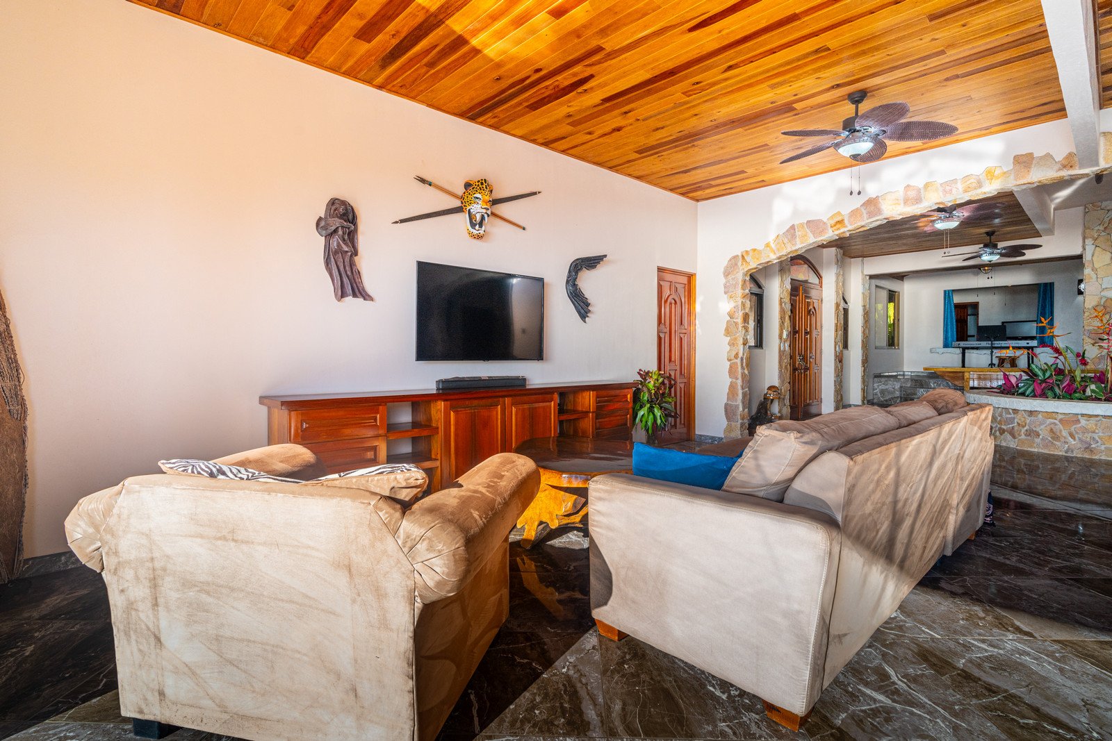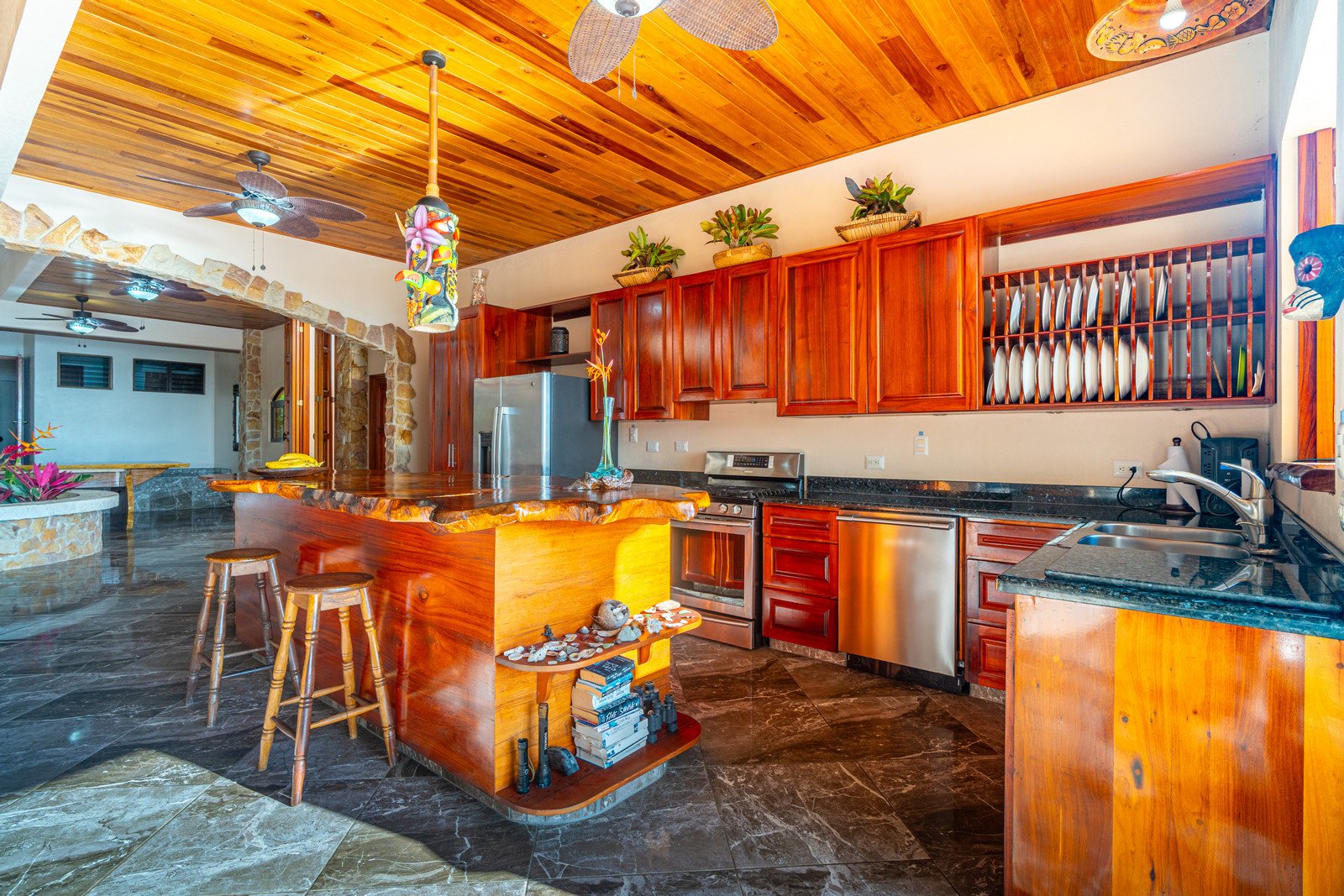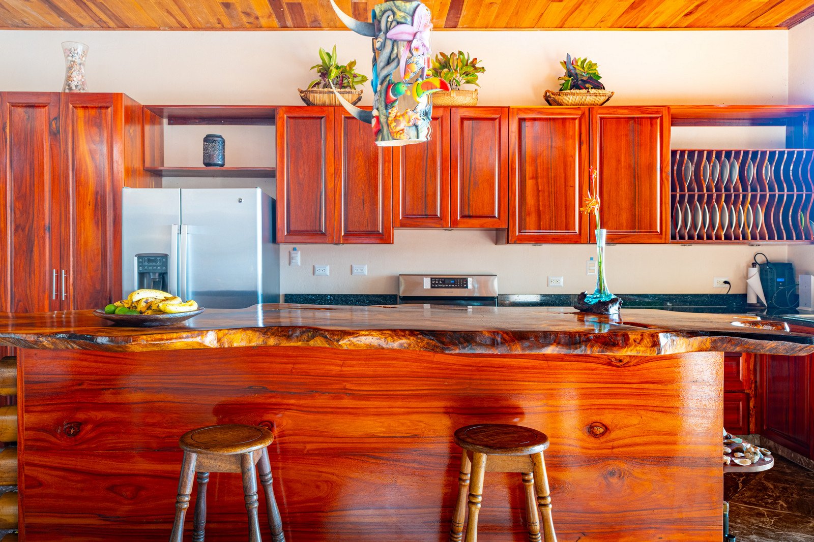 Step inside, and you are immediately embraced by a sense of warmth and tranquility. The heart of the home is an open-concept living space, where elegant marble-accented tiles from Spain meet the rich warmth of tropical hardwood ceilings. Here, the living room and kitchen flow seamlessly into one another, creating a space that is both inviting and sophisticated. The centerpiece of the kitchen is a massive island, hewn from a single piece of Costa Rican Cenizero wood, offering not just a place to prepare meals, but a gathering spot where stories are shared and memories are made.