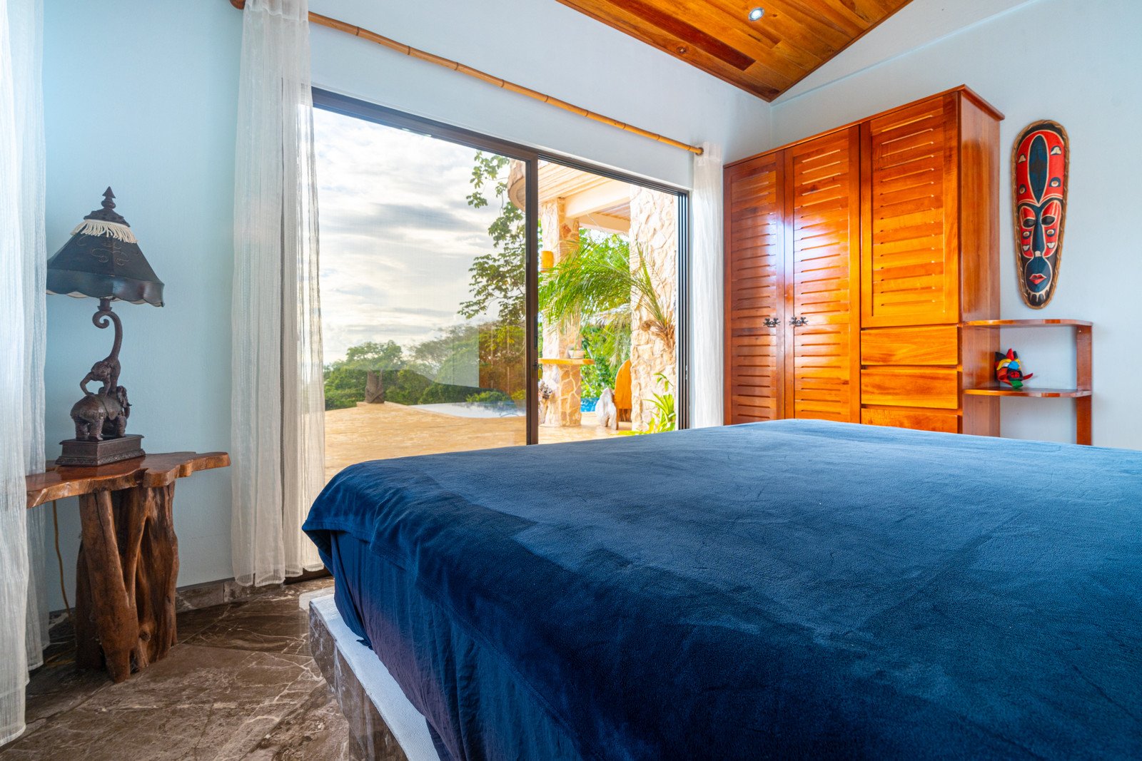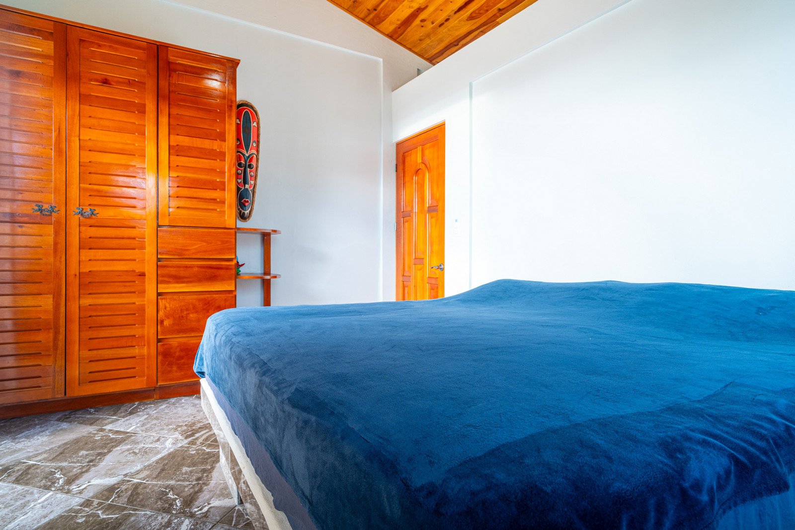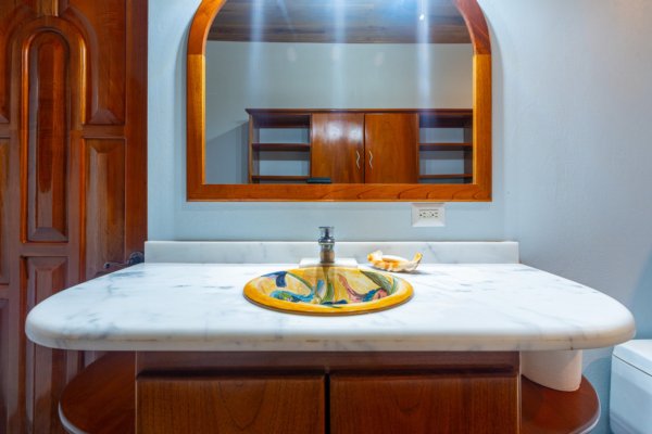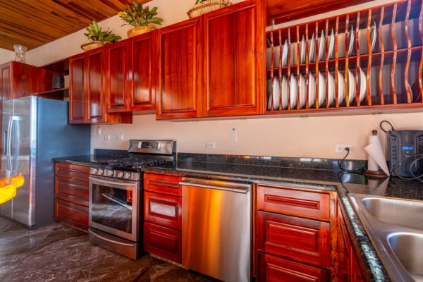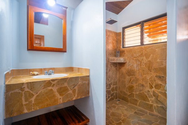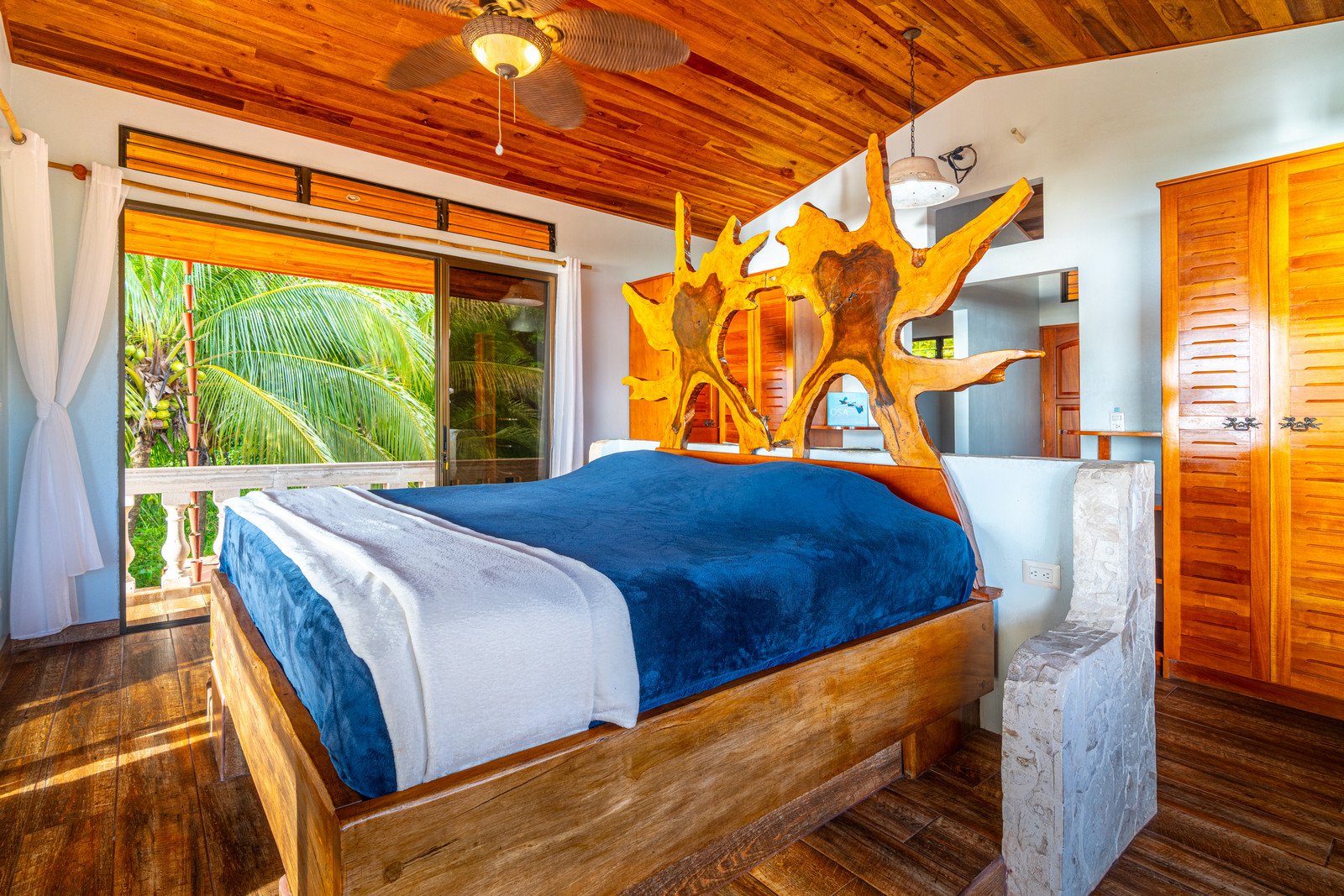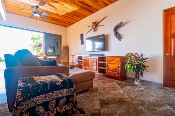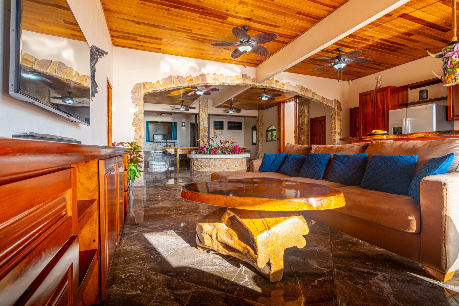 Step inside, and you are immediately embraced by a sense of warmth and tranquility. The heart of the home is an open-concept living space, where elegant marble-accented tiles from Spain meet the rich warmth of tropical hardwood ceilings. Here, the living room and kitchen flow seamlessly into one another, creating a space that is both inviting and sophisticated. The centerpiece of the kitchen is a massive island, hewn from a single piece of Costa Rican Cenizero wood, offering not just a place to prepare meals, but a gathering spot where stories are shared and memories are made.