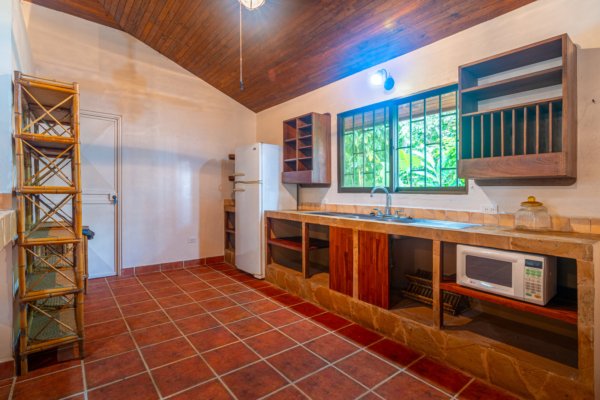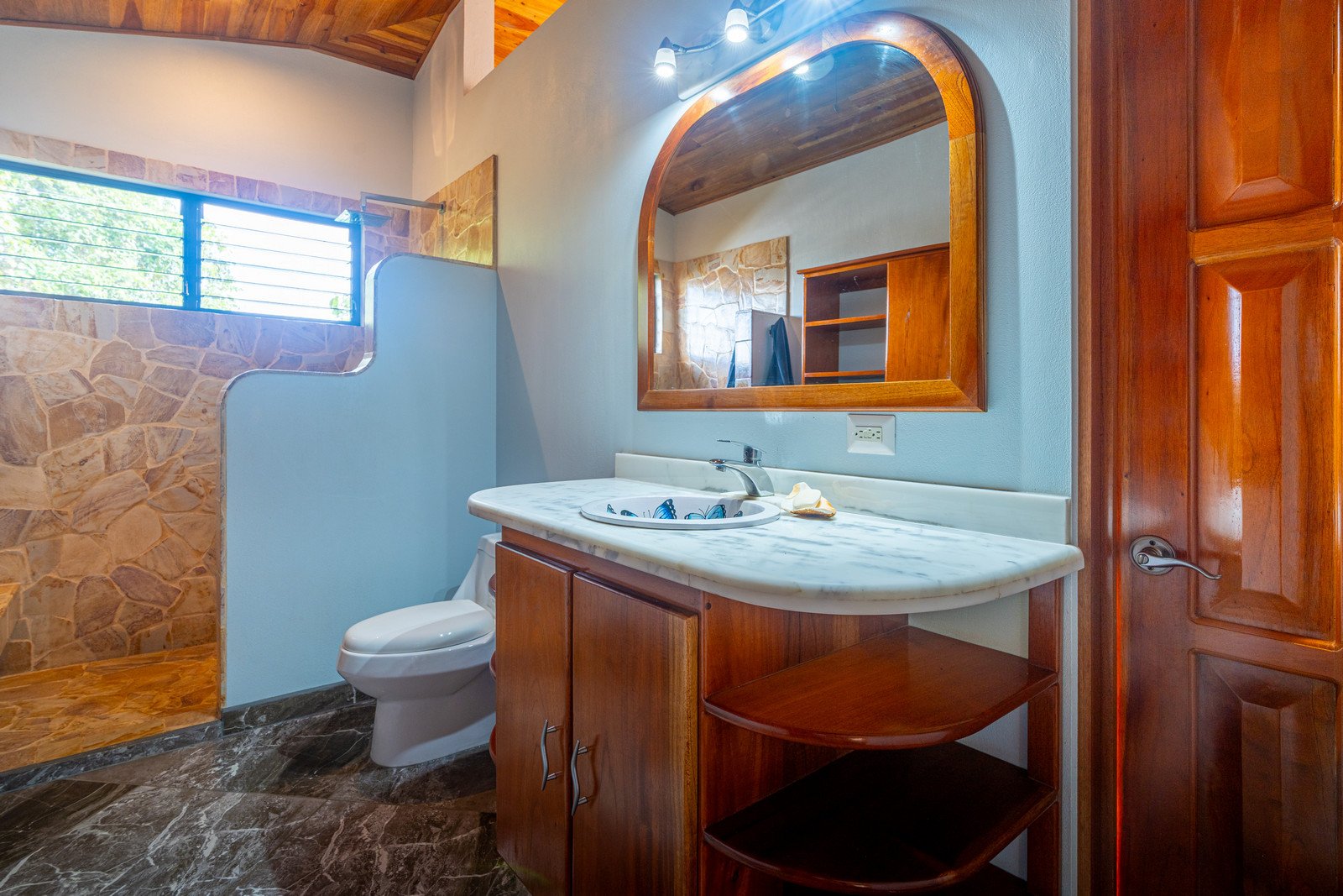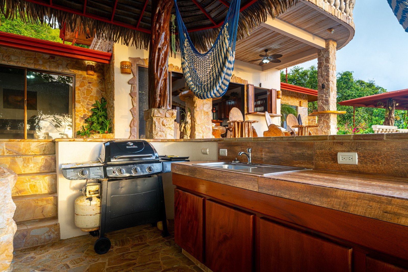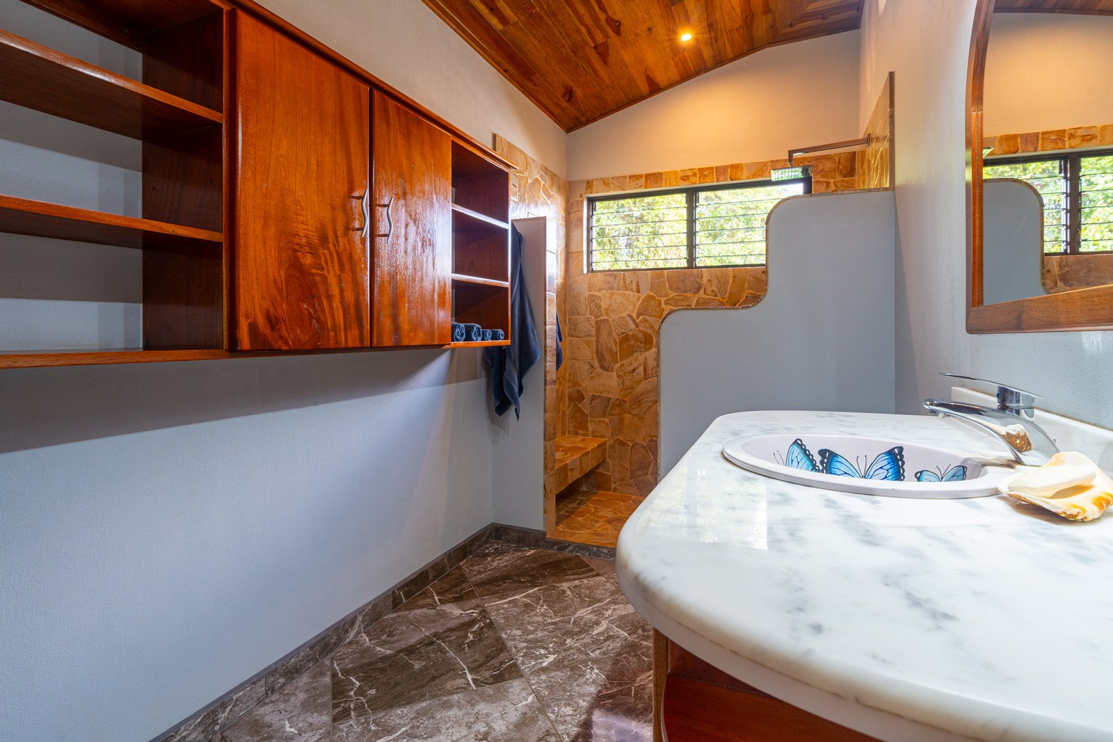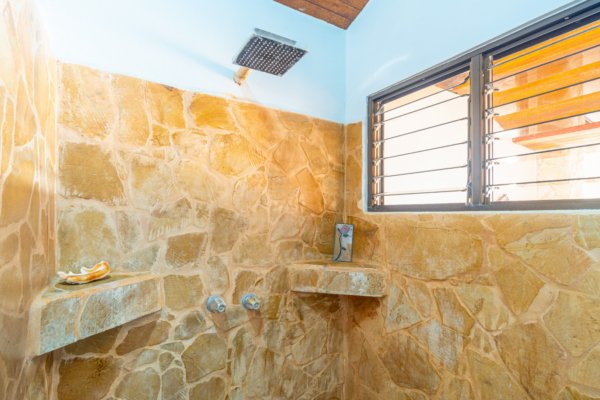 Step inside, and you are immediately embraced by a sense of warmth and tranquility. The heart of the home is an open-concept living space, where elegant marble-accented tiles from Spain meet the rich warmth of tropical hardwood ceilings. Here, the living room and kitchen flow seamlessly into one another, creating a space that is both inviting and sophisticated. The centerpiece of the kitchen is a massive island, hewn from a single piece of Costa Rican Cenizero wood, offering not just a place to prepare meals, but a gathering spot where stories are shared and memories are made.