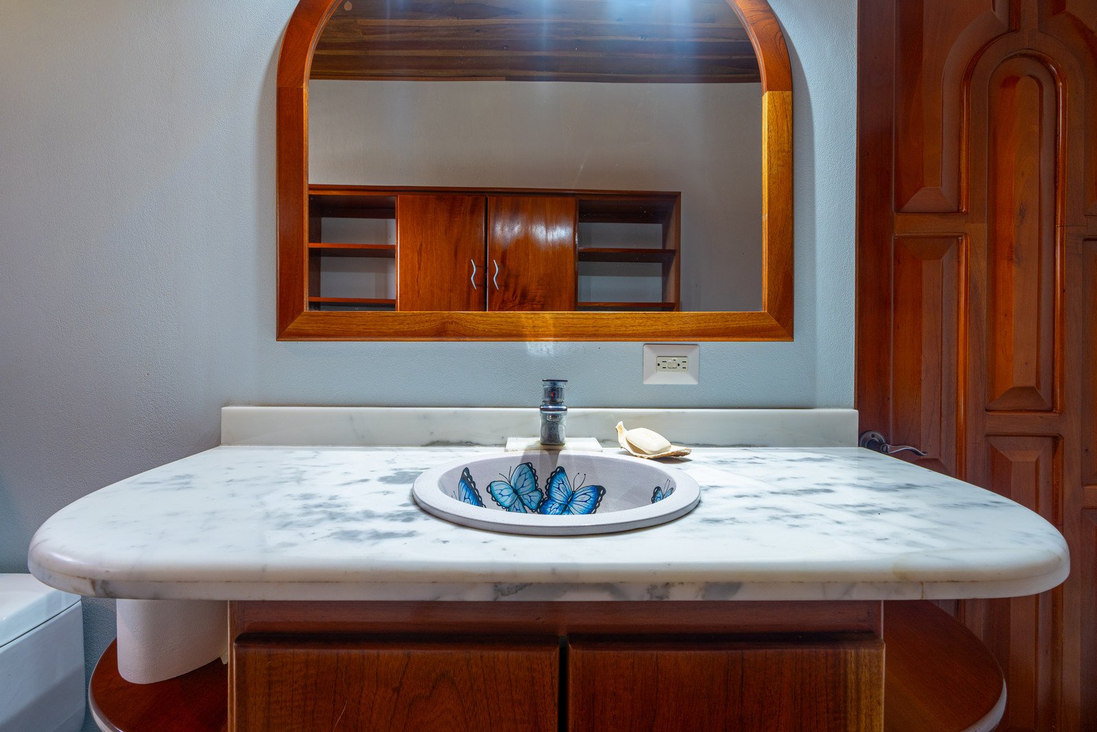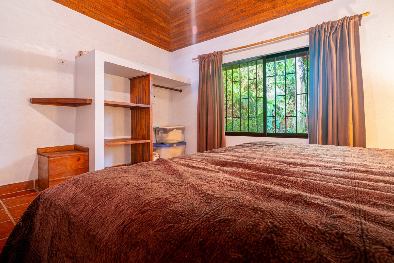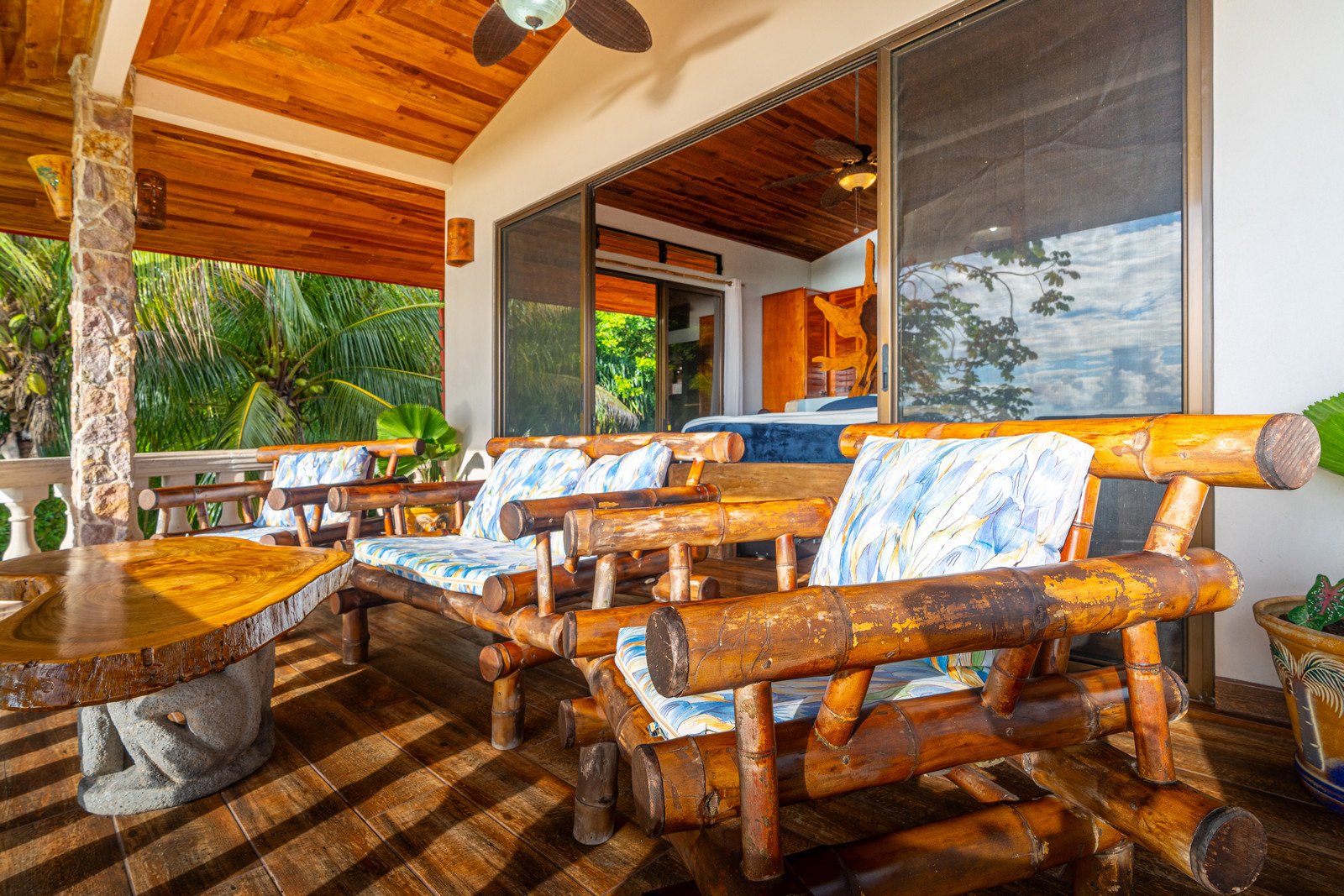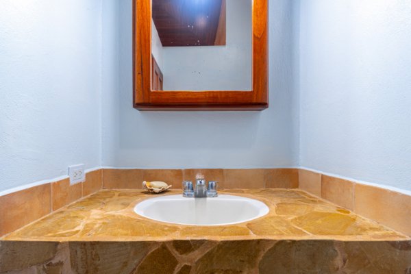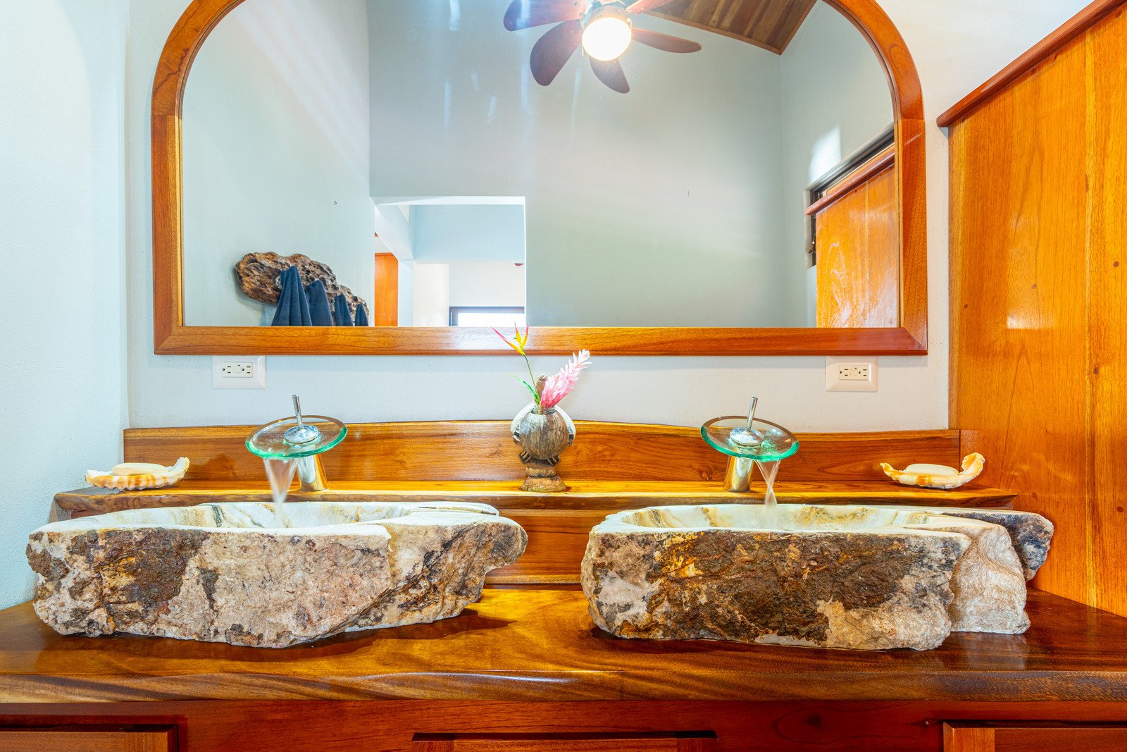 Step inside, and you are immediately embraced by a sense of warmth and tranquility. The heart of the home is an open-concept living space, where elegant marble-accented tiles from Spain meet the rich warmth of tropical hardwood ceilings. Here, the living room and kitchen flow seamlessly into one another, creating a space that is both inviting and sophisticated. The centerpiece of the kitchen is a massive island, hewn from a single piece of Costa Rican Cenizero wood, offering not just a place to prepare meals, but a gathering spot where stories are shared and memories are made.