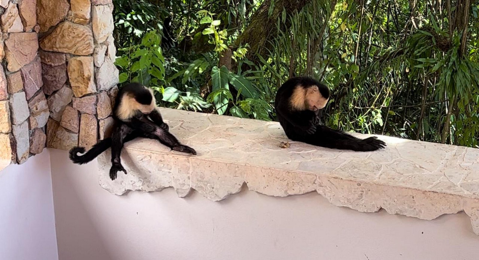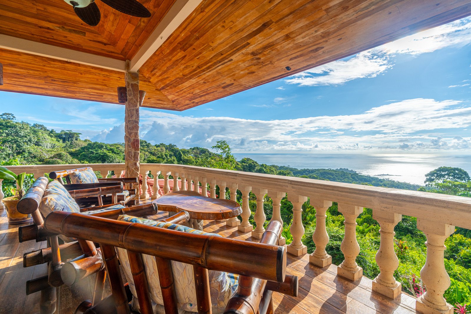 As you ascend to the rooftop terrace, you are greeted by sweeping views of the jungle and ocean, a perfect spot for entertaining or simply enjoying a quiet moment with a glass of wine. The terrace is adorned with Coralina fossil rock ledges and features a round-tabled lounging area shaded by a Palmex umbrella, offering a serene space to relax and soak in the beauty of Costa Rica.