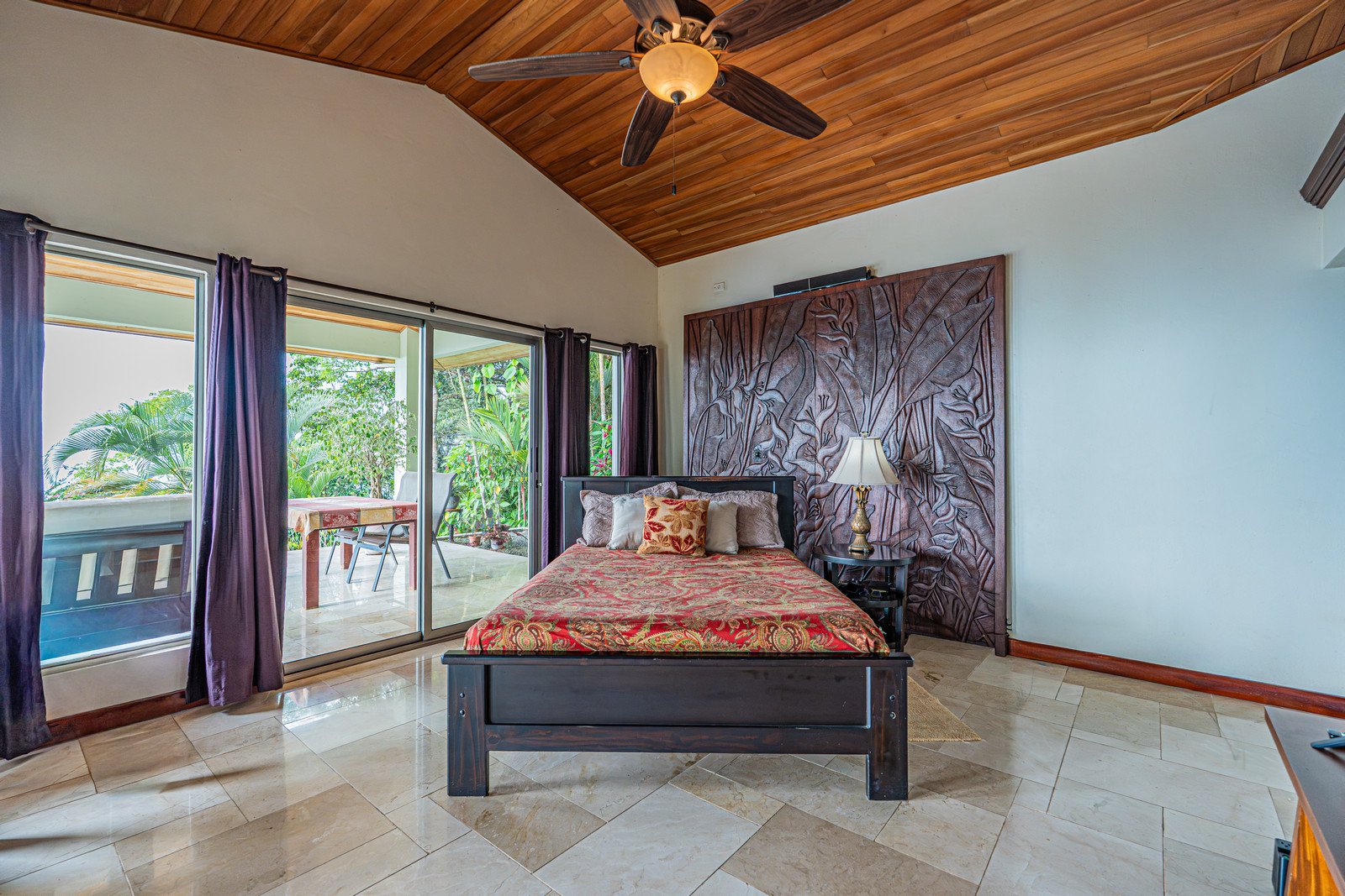 Primary suite retreat with en-suite bathroom, walk-in closet, private terrace access, and a hand-carved Balinese hardwood bed, a true statement piece