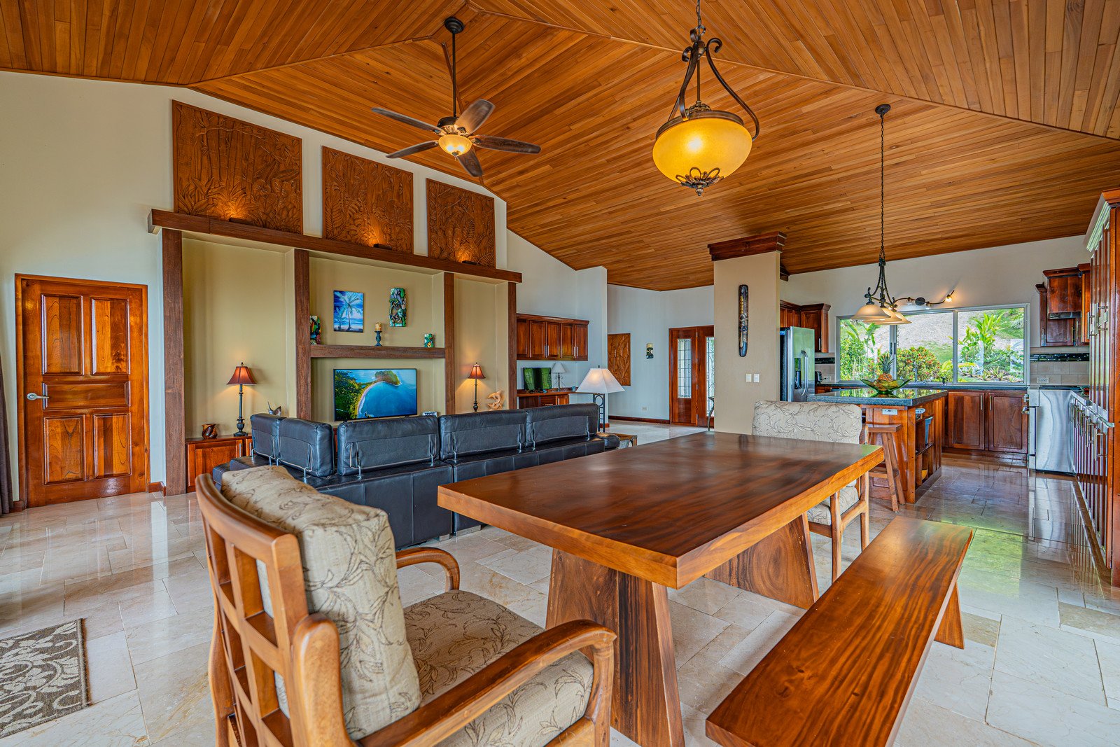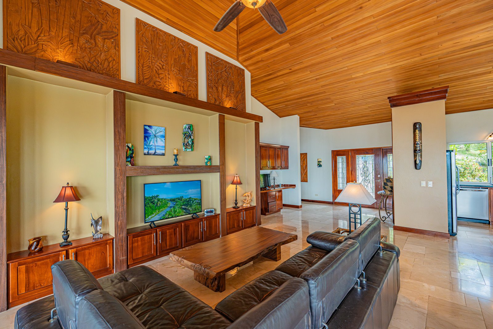 High-quality construction throughout: solid concrete block structure, wood ceilings, travertine flooring, premium ceiling fans, and solid wood furnishings