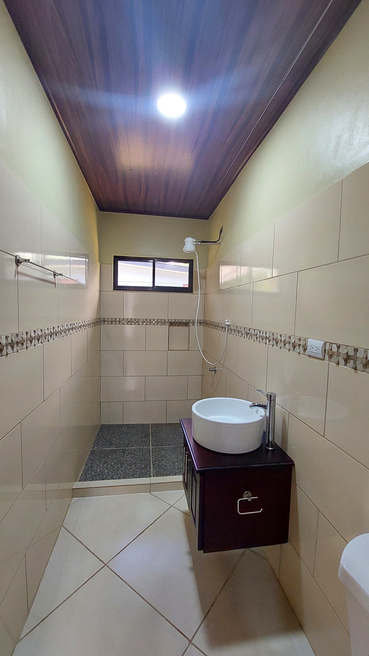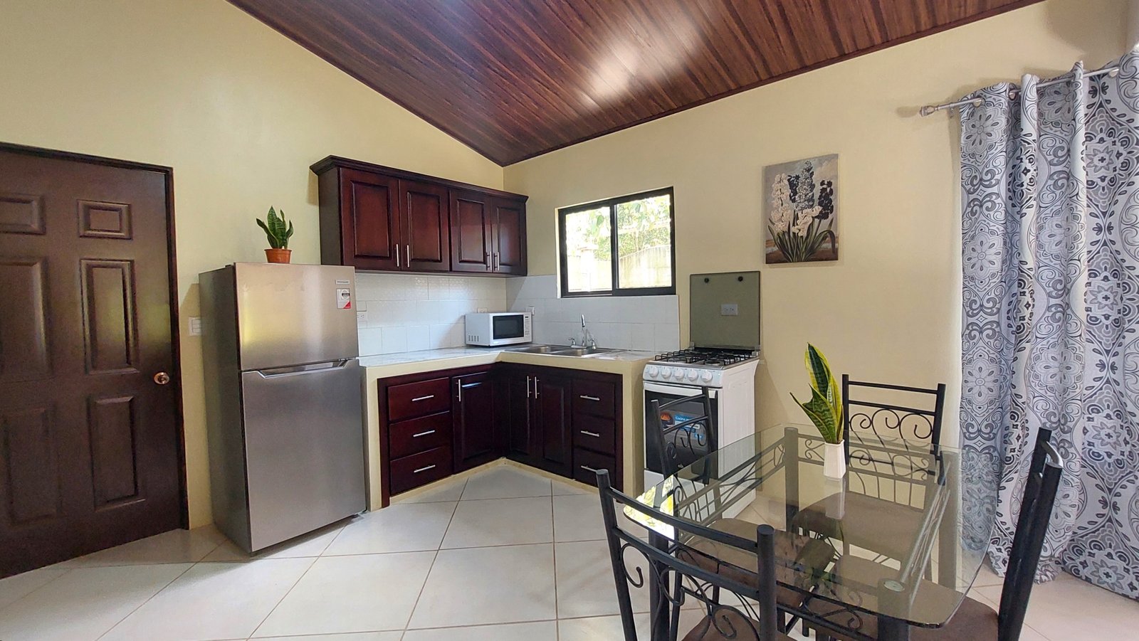 The charming single level home features 2 bedrooms and 2 full bathrooms. This home has combined living and dining area with comfortable sofas, internet, ceiling fans, and air conditioner. It is a great place to relax with friends and spacious for digital nomads working remotely, or retirees looking to enjoy the Costa Rican way of life in a brand new home. The fully equipped kitchen connects to a spacious laundry room located in the back of the house. Tiled counters and backsplash, solid wood cabinets hand crafted locally, and tile floors are all in a traditional style making it the perfect setting for cooking up some delicious meals.
