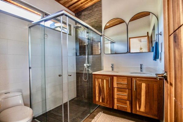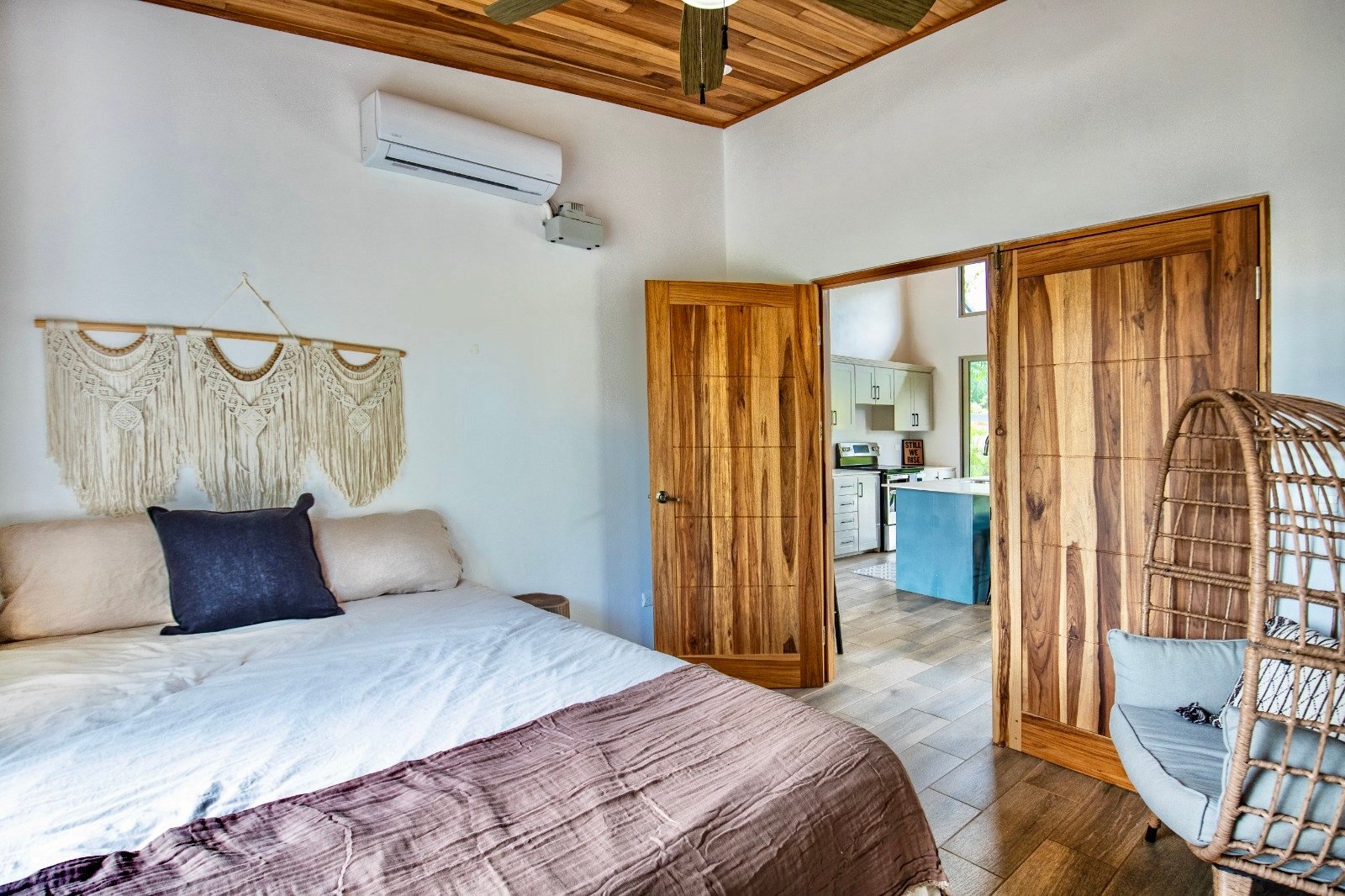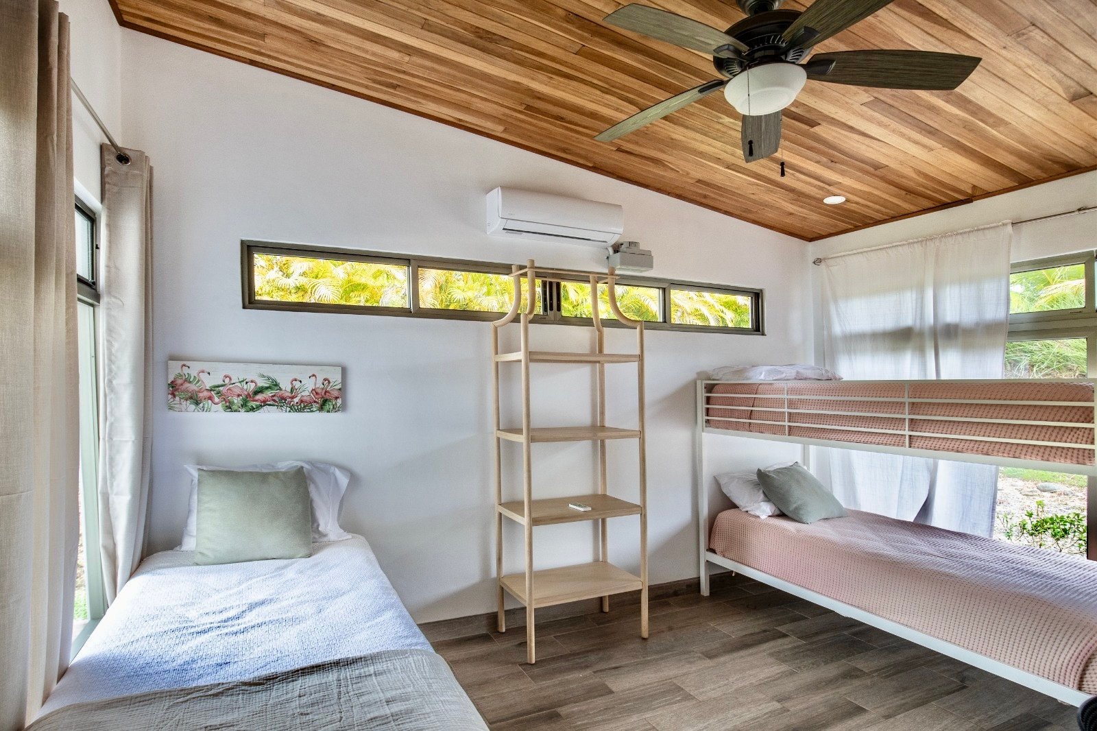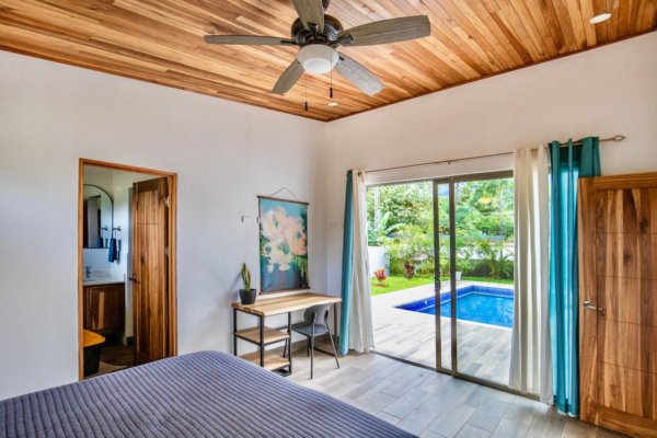 The primary suite is designed for comfort and privacy, featuring an ensuite bathroom, walk-in closet, and views that extend over the pool and surrounding mountains. Two additional bedrooms include built-in closets and share a well-appointed bathroom. Both bathrooms are equipped with ventilation systems, helping maintain airflow and comfort in the tropical climate.