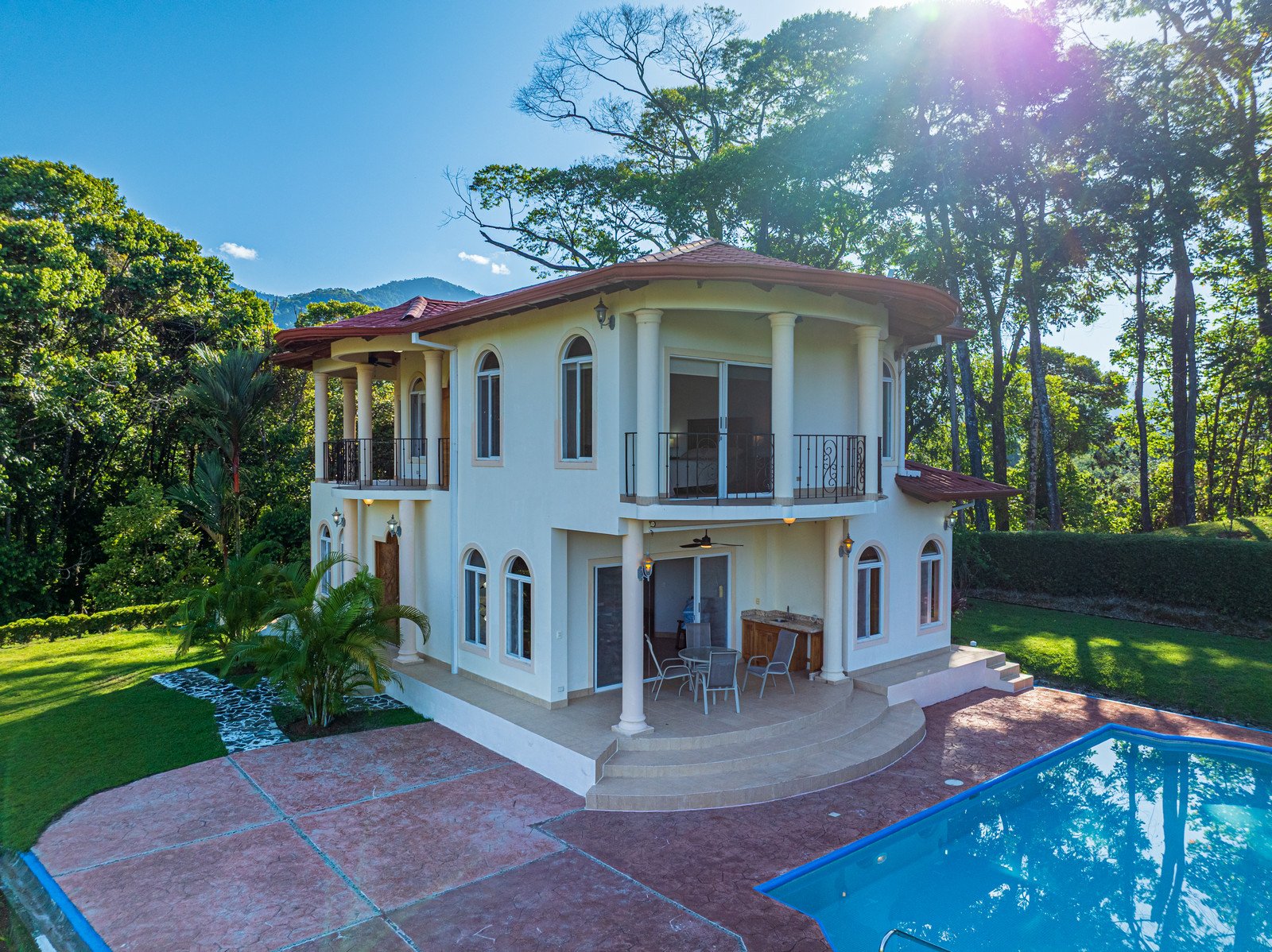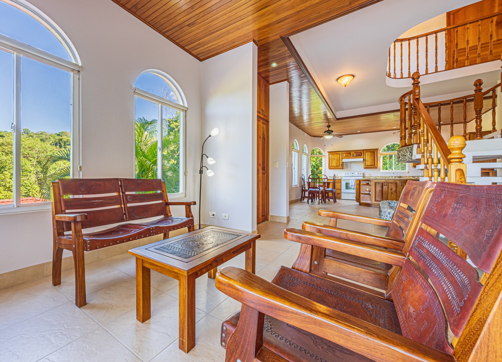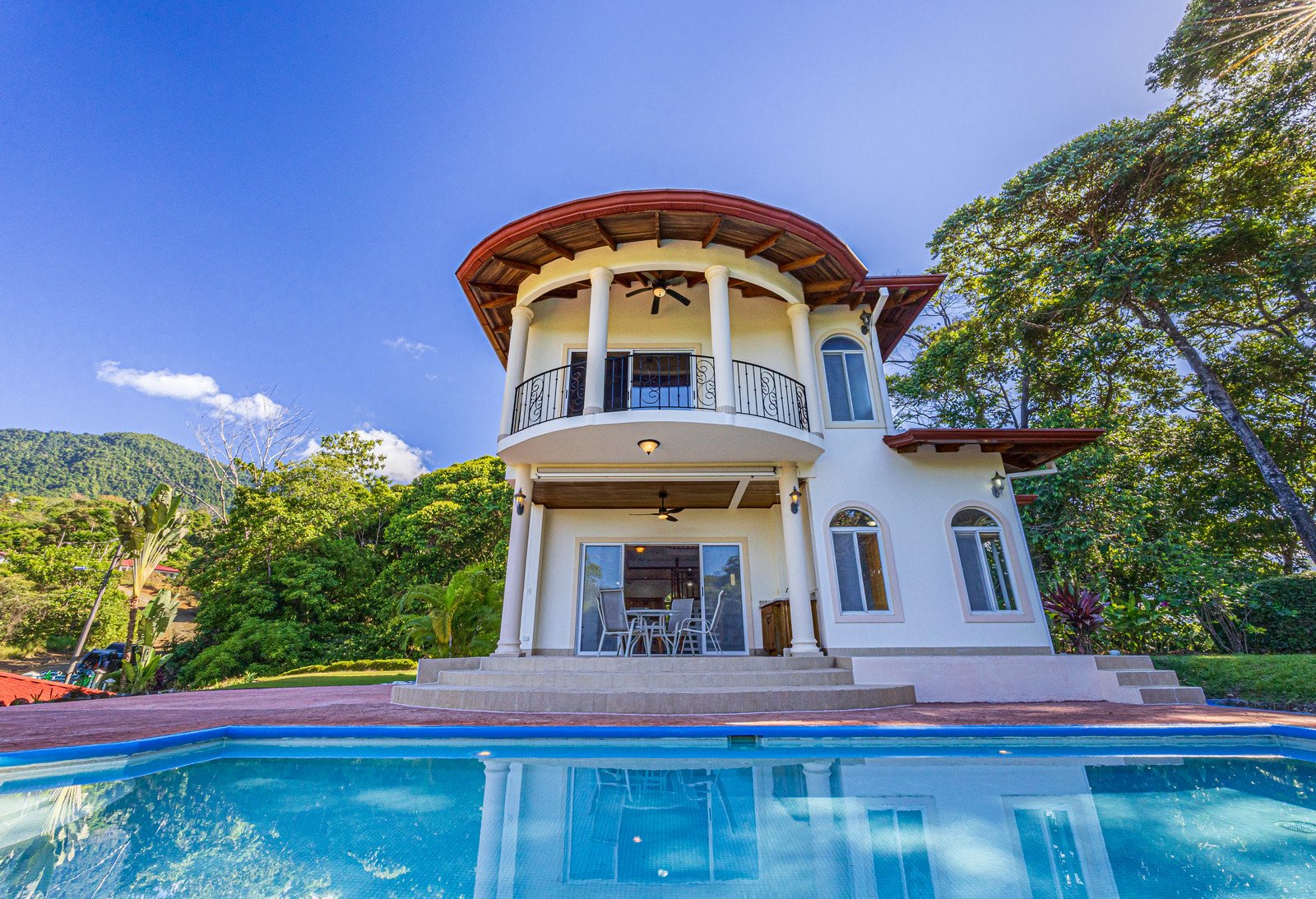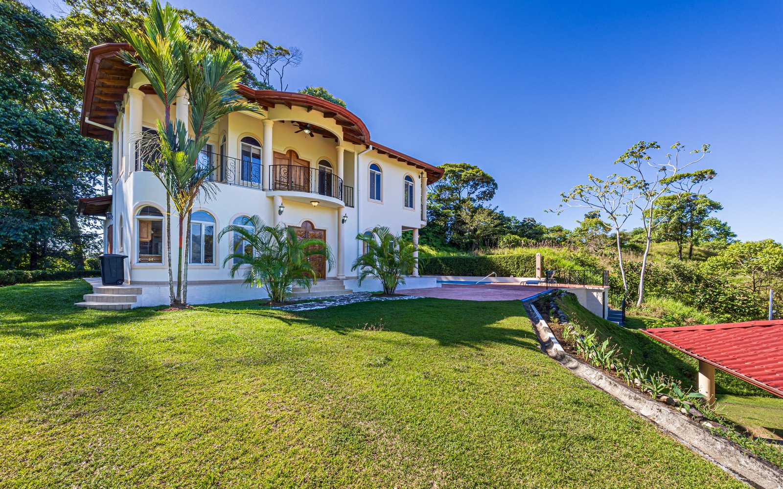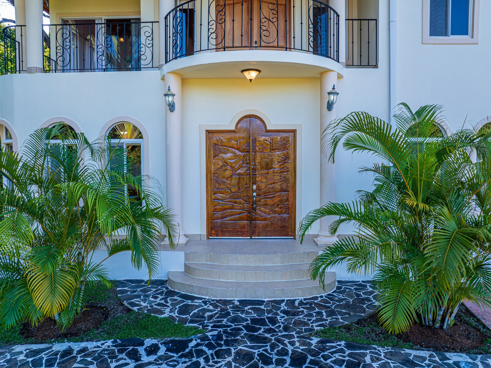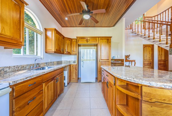 From the moment you arrive, you appreciate the immaculate landscaping, tropical plants and fruit trees around the residence. The home was completed in 2013, built with quality and longevity in mind. With a total of 2,652 sq.ft. solid concrete construction, intricate details, abundant windows and soaring ceilings create a feeling of grandeur within the home. The classic architecture is complemented by warm natural hardwood accents and custom wood ceilings. The main floor is a functional open space, with indoor dining, living space and the kitchen, which features granite countertops and locally made cabinetry. The main floor also hosts two guest bedrooms and one spacious full bathroom, as well as the laundry room with storage. The elegant staircase leads upstairs to a flexible bonus room with private balcony access, perfect as an art studio, office, or additional bedroom. The private primary bedroom is bright and spacious, with high ceilings, private balcony and large ensuite bathroom with double vanities.