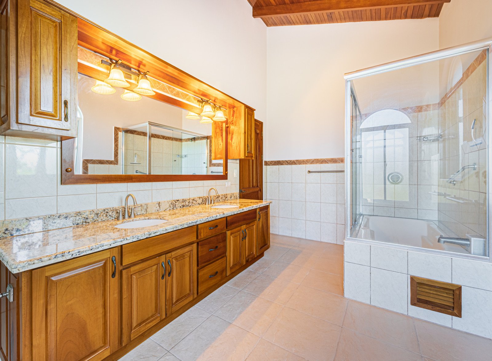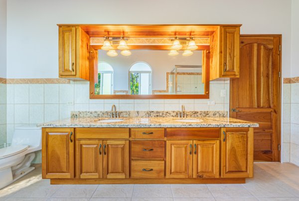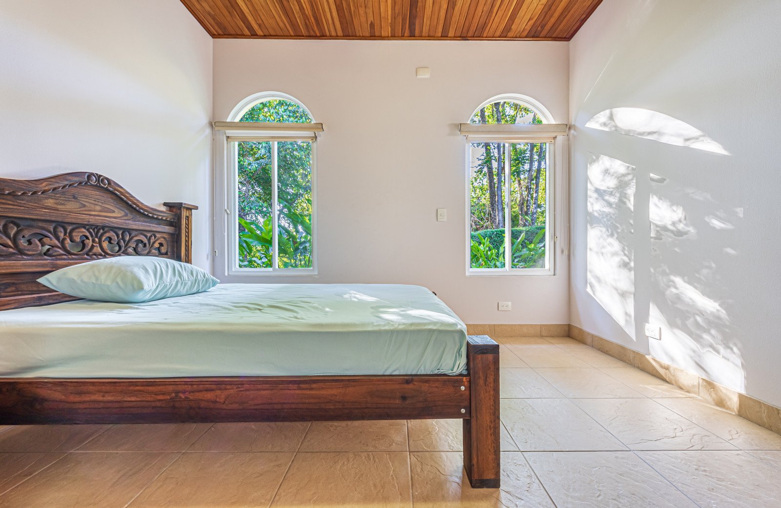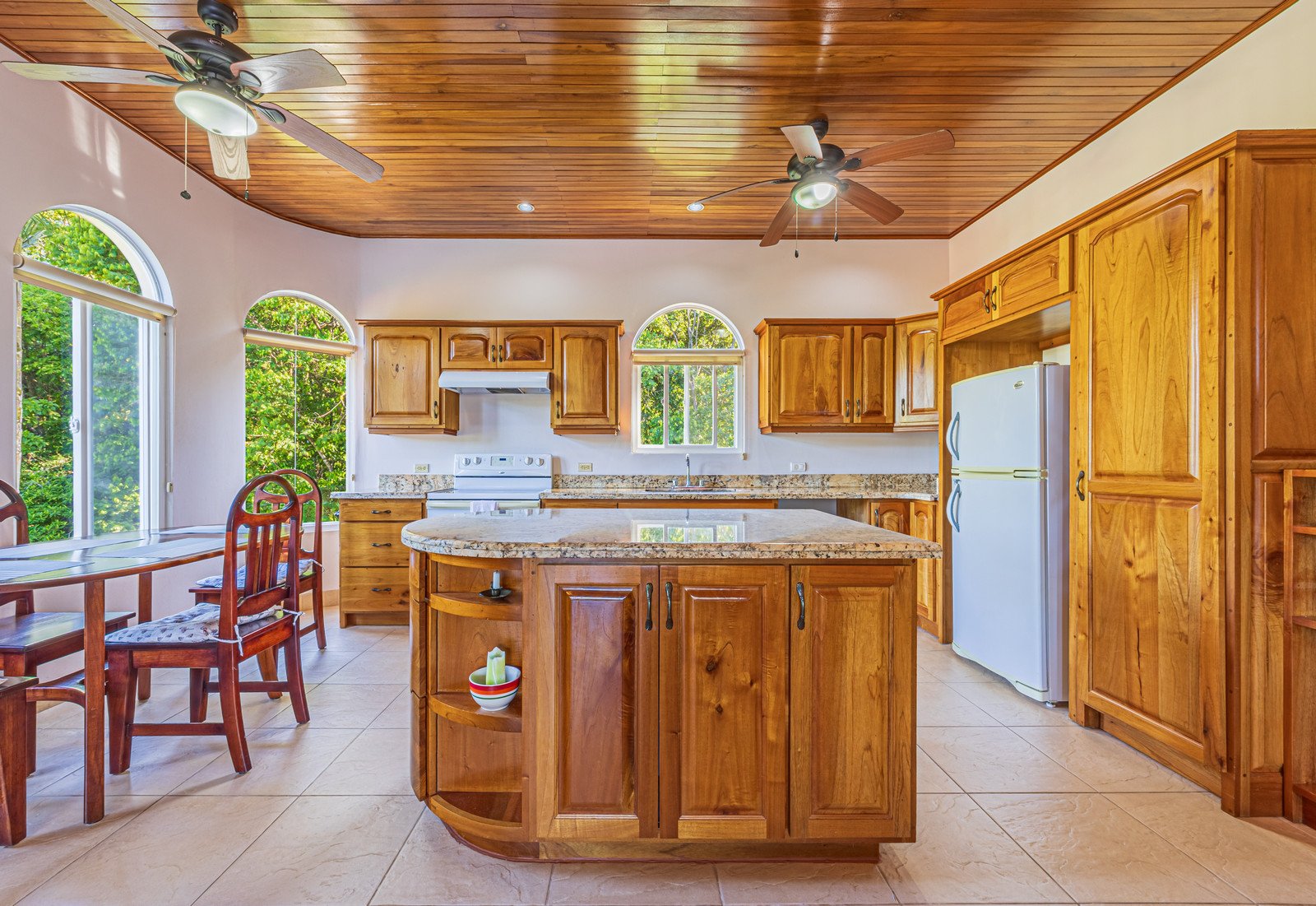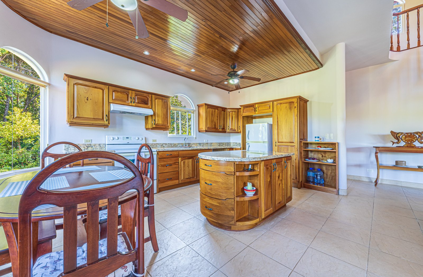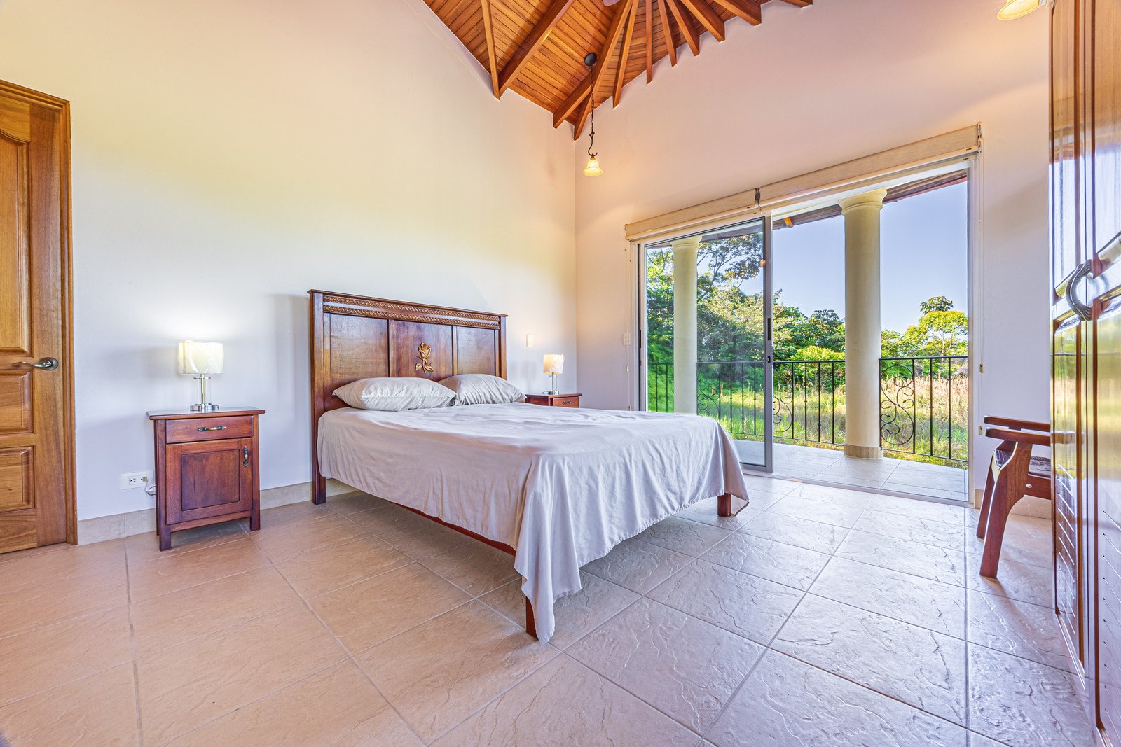 From the moment you arrive, you appreciate the immaculate landscaping, tropical plants and fruit trees around the residence. The home was completed in 2013, built with quality and longevity in mind. With a total of 2,652 sq.ft. solid concrete construction, intricate details, abundant windows and soaring ceilings create a feeling of grandeur within the home. The classic architecture is complemented by warm natural hardwood accents and custom wood ceilings. The main floor is a functional open space, with indoor dining, living space and the kitchen, which features granite countertops and locally made cabinetry. The main floor also hosts two guest bedrooms and one spacious full bathroom, as well as the laundry room with storage. The elegant staircase leads upstairs to a flexible bonus room with private balcony access, perfect as an art studio, office, or additional bedroom. The private primary bedroom is bright and spacious, with high ceilings, private balcony and large ensuite bathroom with double vanities.