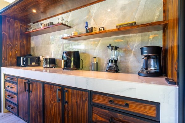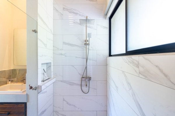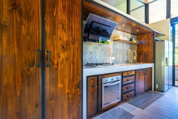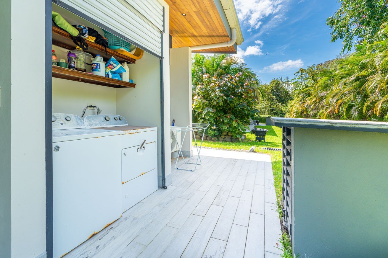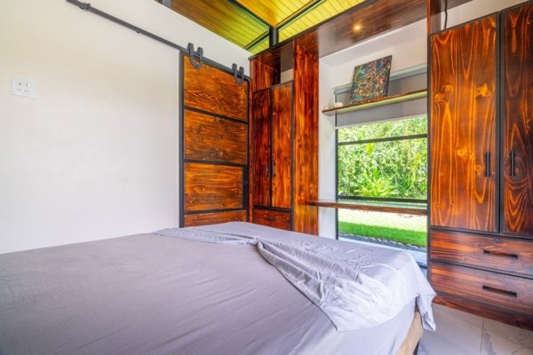 The two homes are identical and reached via a footpath leading away from the carpark. A sunny swimming pool and a large covered front patio, with plentiful seating options and a BBQ, occupy the entire frontal section of each house. This patio opens directly towards the two ensuite bedrooms and the central kitchen / living space. Frontal floor-to-ceiling glazing floods the home with sunlight and natural vistas. A high ceiling adds a sense of spaciousness and ceiling windows, gracing both the external and internal walls, complete the bright & sunny offering. Beautiful lumber fit outs and teak ceilings, double-treated for bug resistance, add a touch of warmth and nature to every nook and cranny of the home. Air Conditioning is provided in every bedroom, and the AC units as well as the washer & dryer are conveniently located in external rooms at the back of the homes.