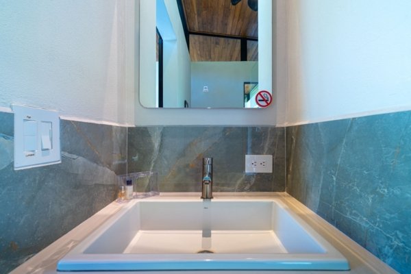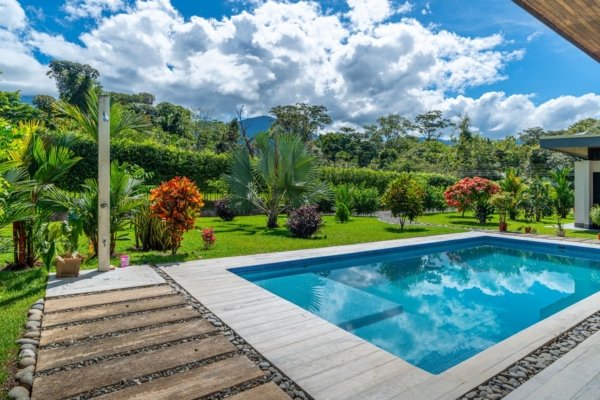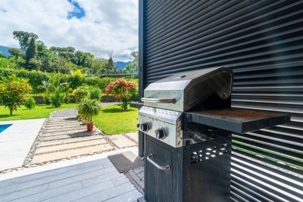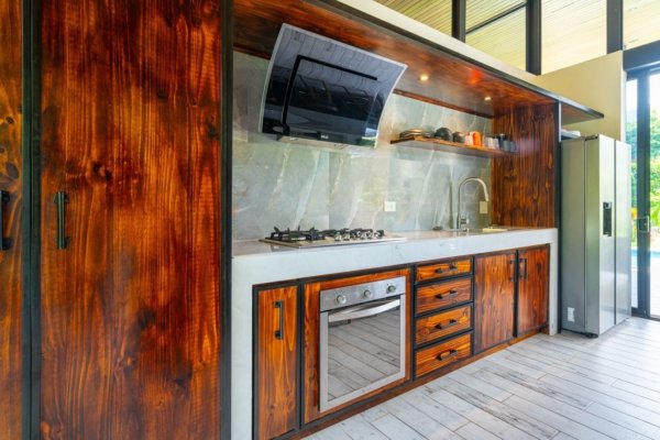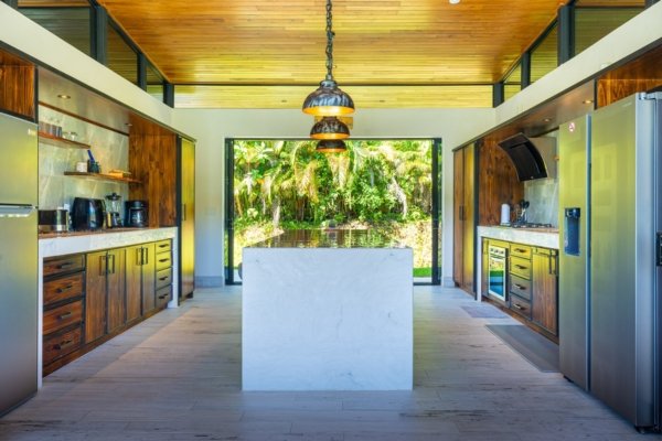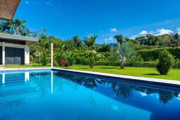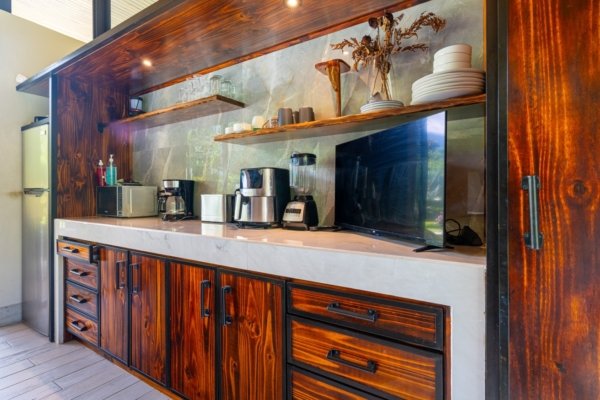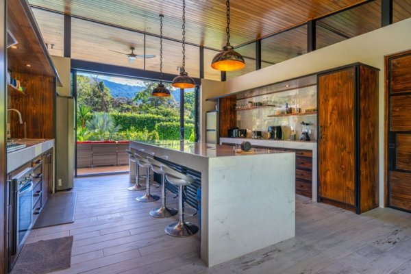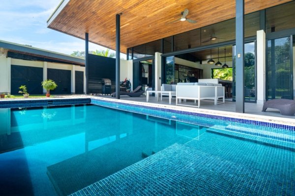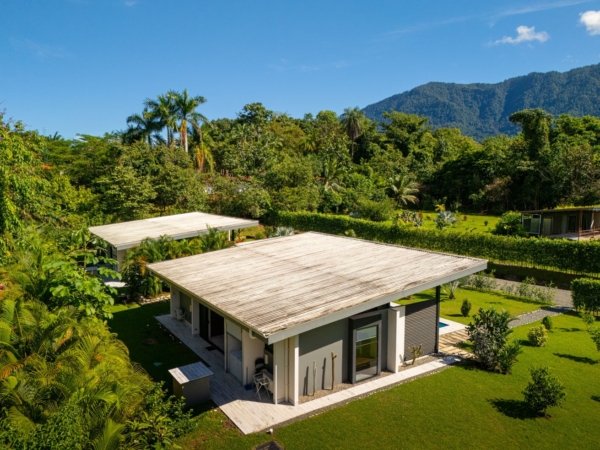 The large kitchen is fully equipped and provides plenty of counter and storage space while a centrally located dining table can comfortably seat eight guests. The bedrooms are equipped with storage space and a large ensuite which is accessible from each bedroom and from the central kitchen / dining area. Monsoon showers ensure an enjoyable & relaxing experience. The kitchen and two bedrooms look directly onto the jungle & mountain vistas which are complimented by beautiful tropical landscaping. Plentiful manicured green lawns will provide play areas for children and adults alike.