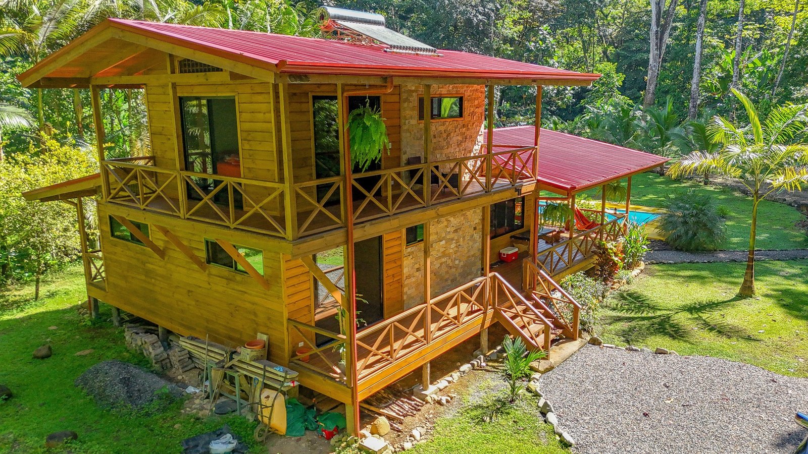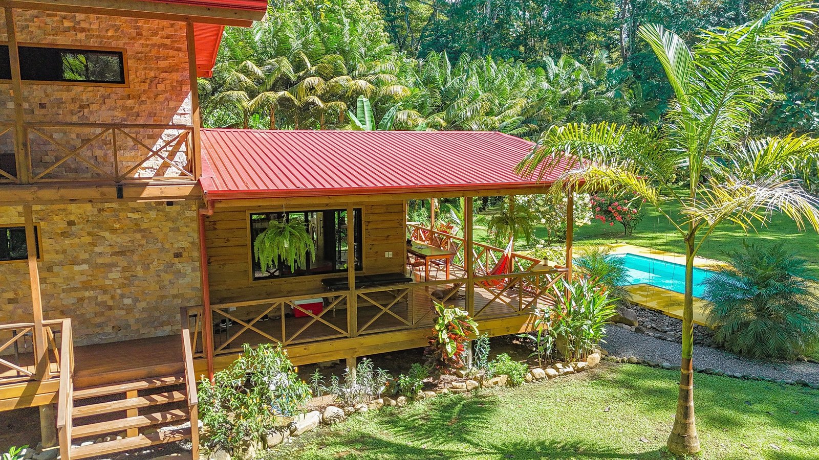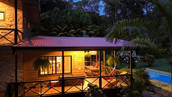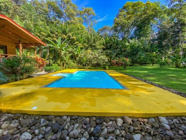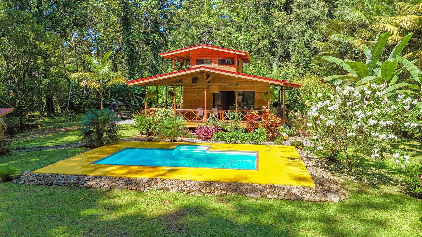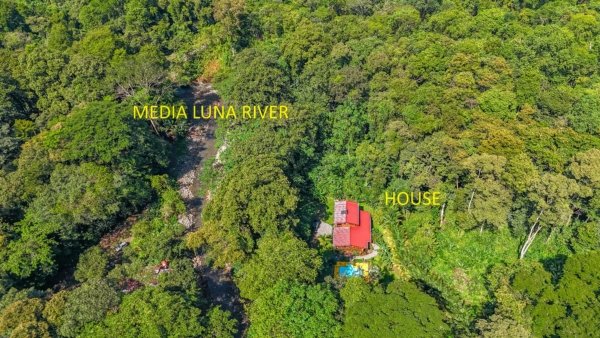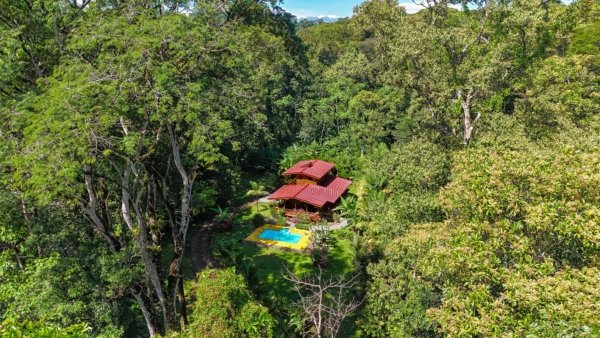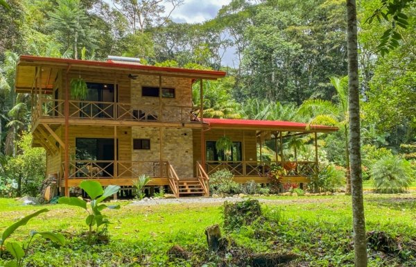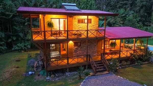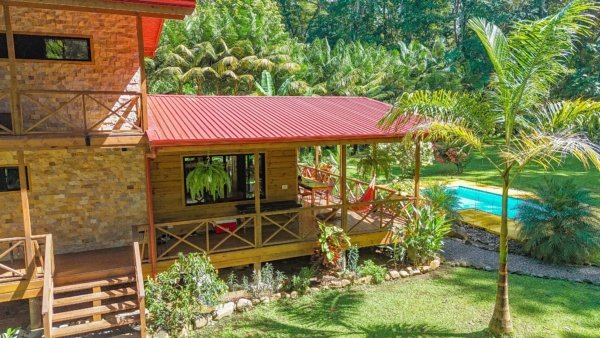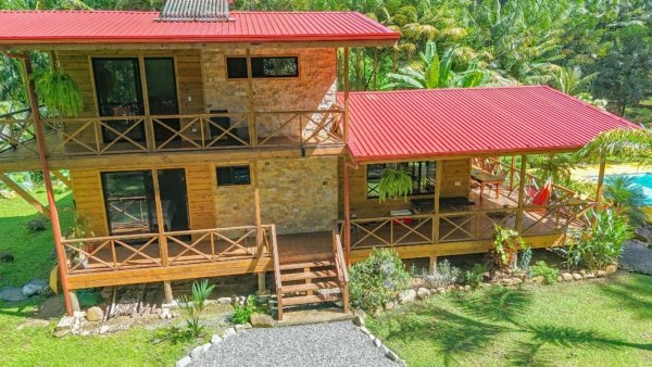 This 2-level, 3-bedroom home fits PERFECTLY into its rainforest surroundings. Beautiful & warm lumber graces both the exterior and interior of the home & tastefully contrasts with the blue pool, sunny yellow pool-deck and the bright red roof of the home. Areas of external stone cladding anchor the home and compliment the riverstone banks of the nearby Rio Media Luna which borders the property.