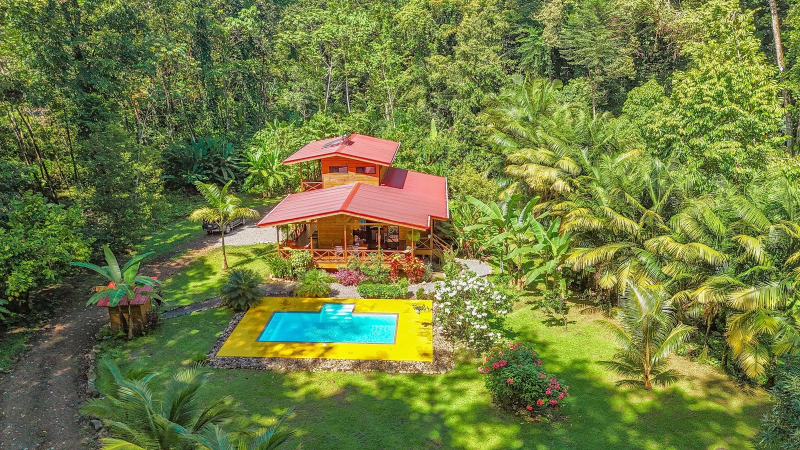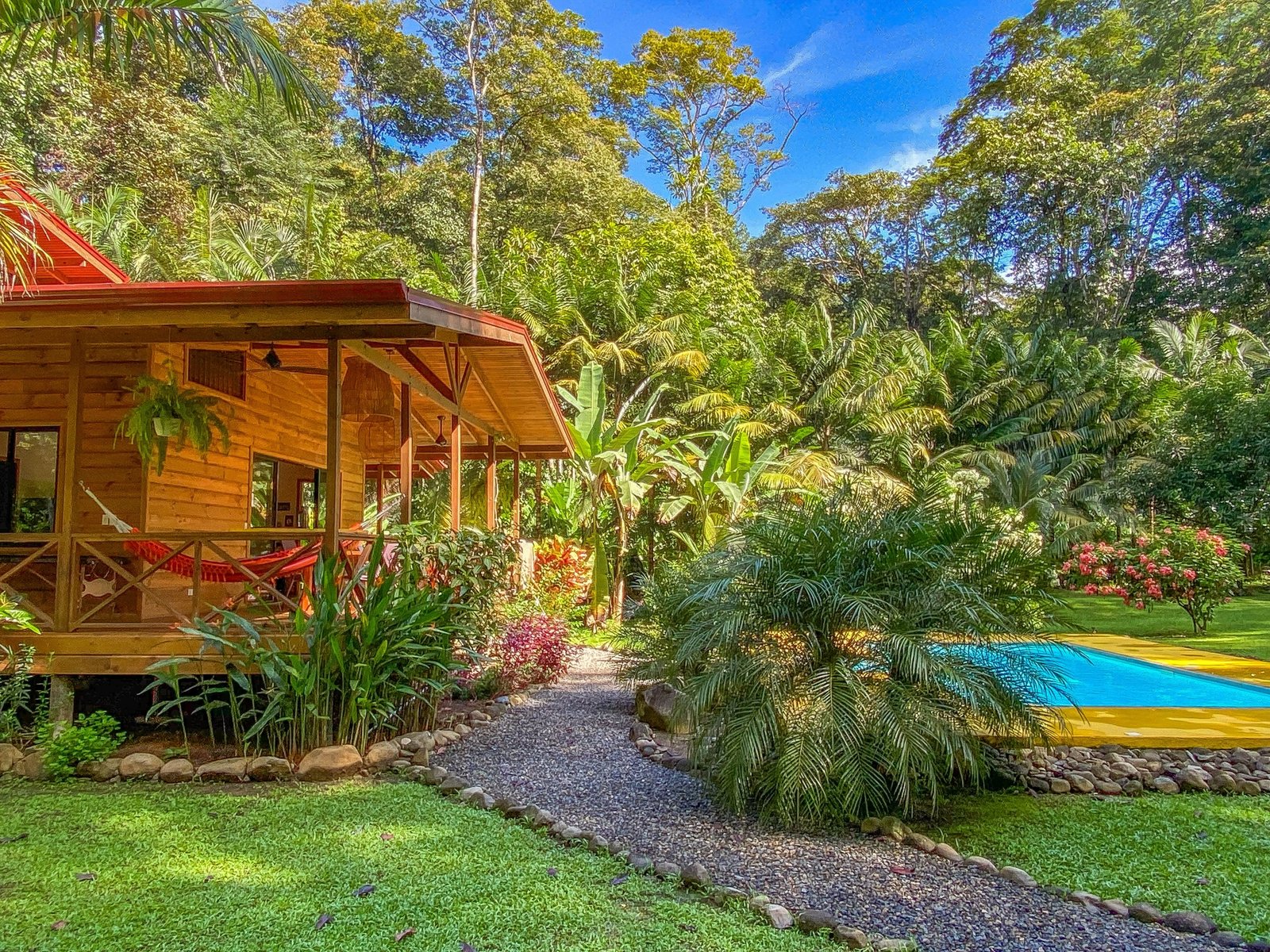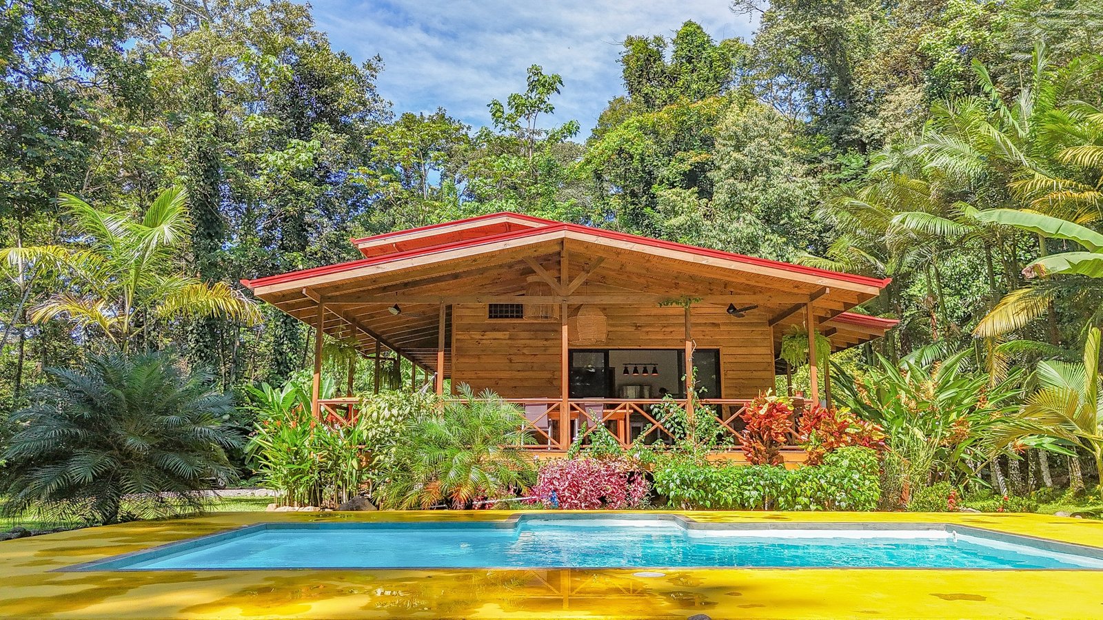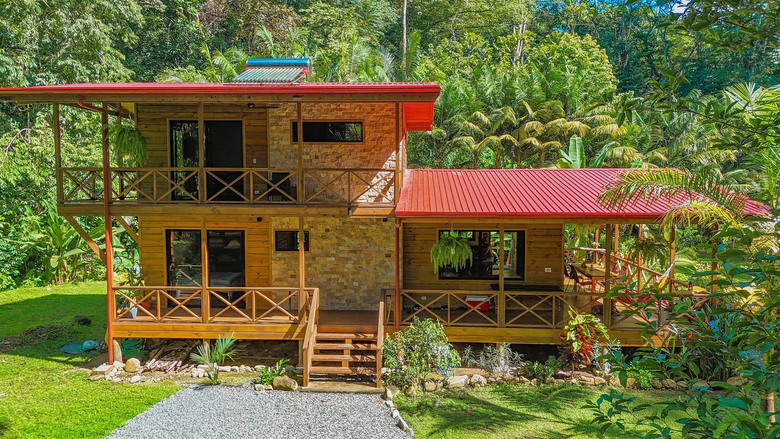 This 2-level, 3-bedroom home fits PERFECTLY into its rainforest surroundings. Beautiful & warm lumber graces both the exterior and interior of the home & tastefully contrasts with the blue pool, sunny yellow pool-deck and the bright red roof of the home. Areas of external stone cladding anchor the home and compliment the riverstone banks of the nearby Rio Media Luna which borders the property.