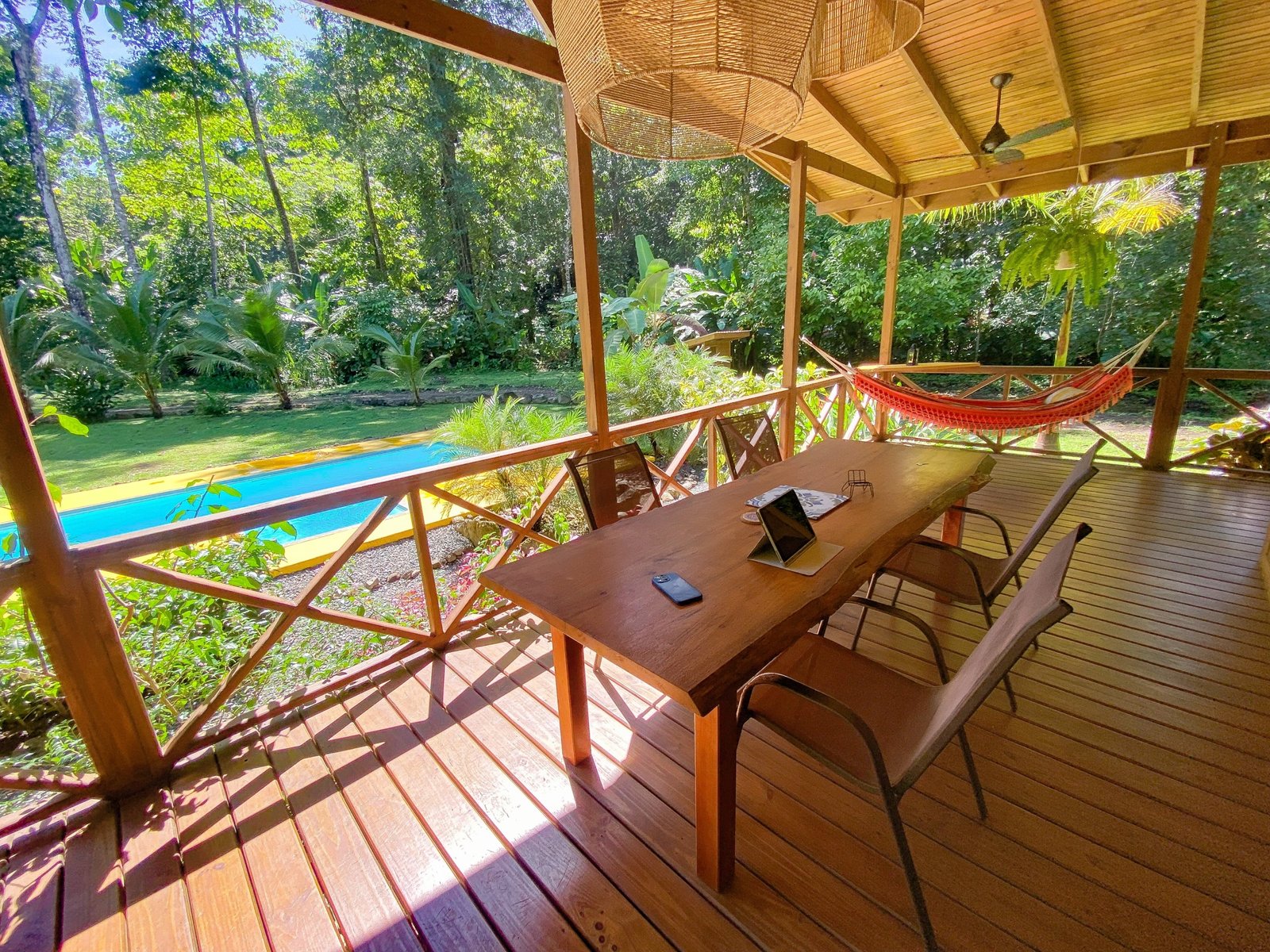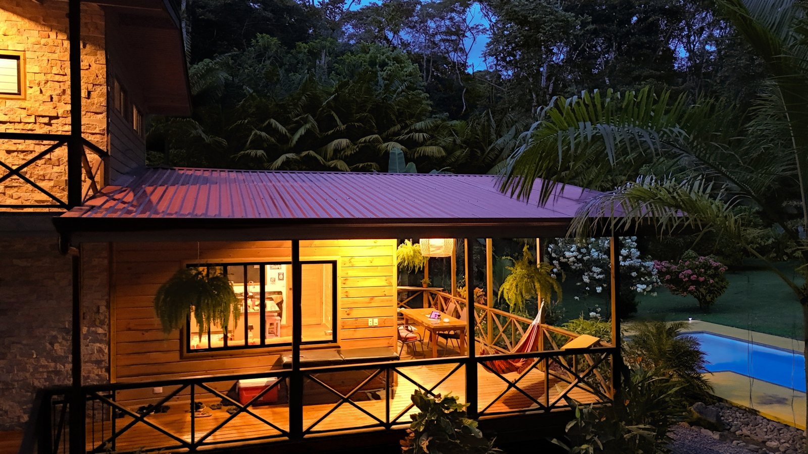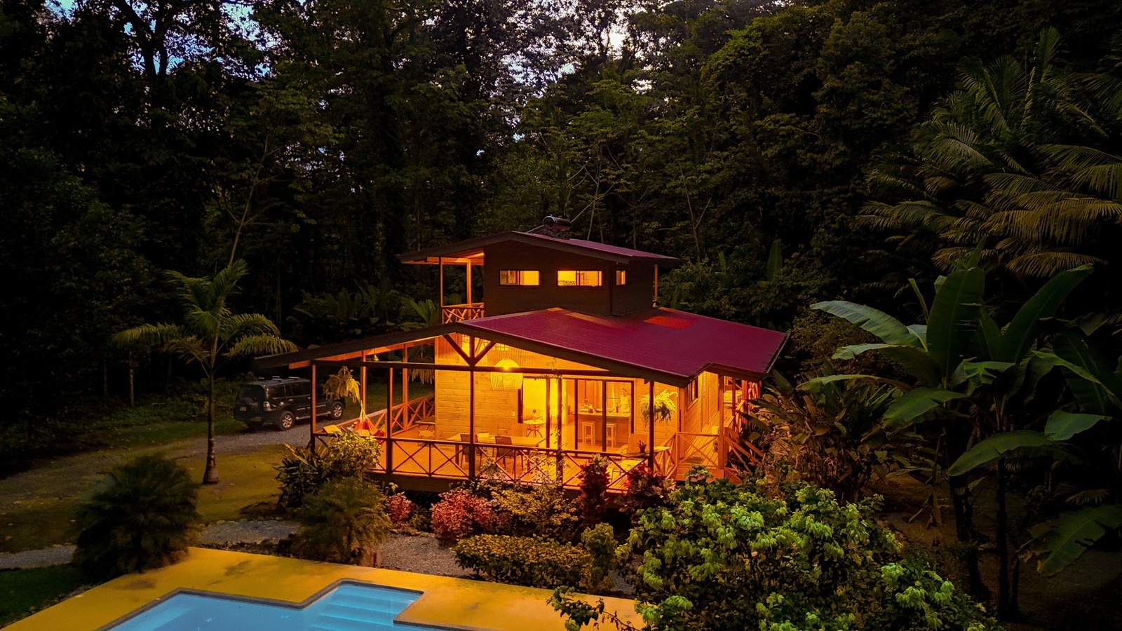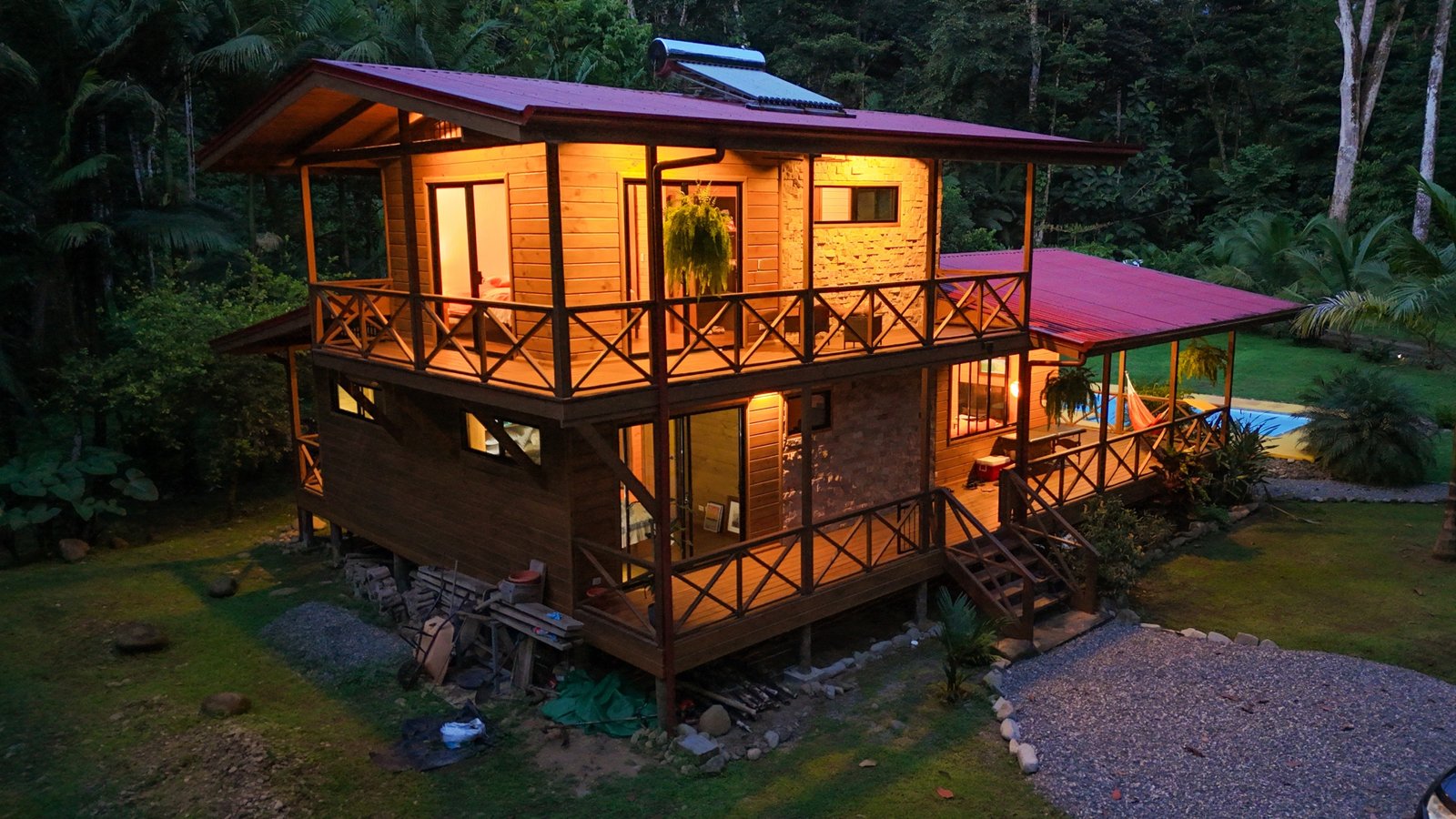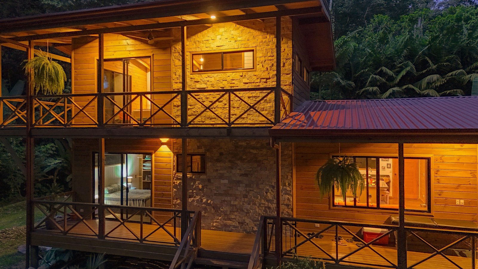 This 2-level, 3-bedroom home fits PERFECTLY into its rainforest surroundings. Beautiful & warm lumber graces both the exterior and interior of the home & tastefully contrasts with the blue pool, sunny yellow pool-deck and the bright red roof of the home. Areas of external stone cladding anchor the home and compliment the riverstone banks of the nearby Rio Media Luna which borders the property.