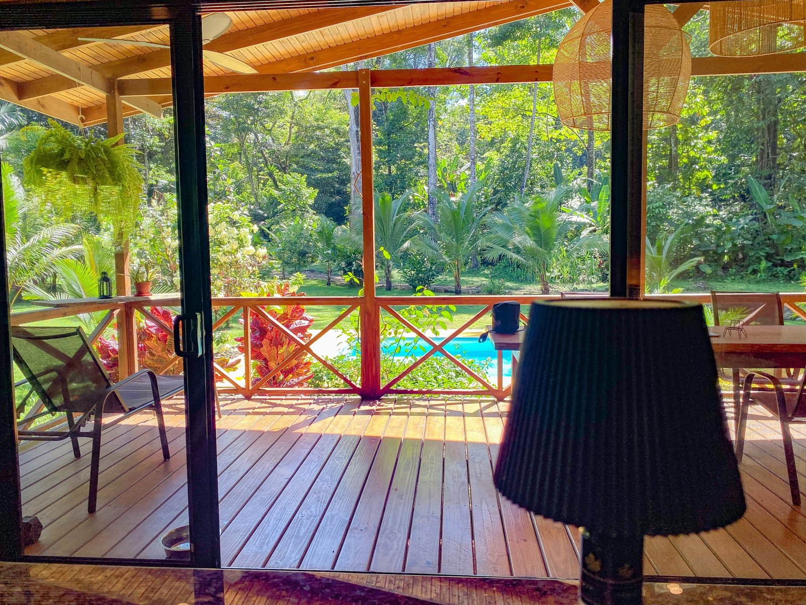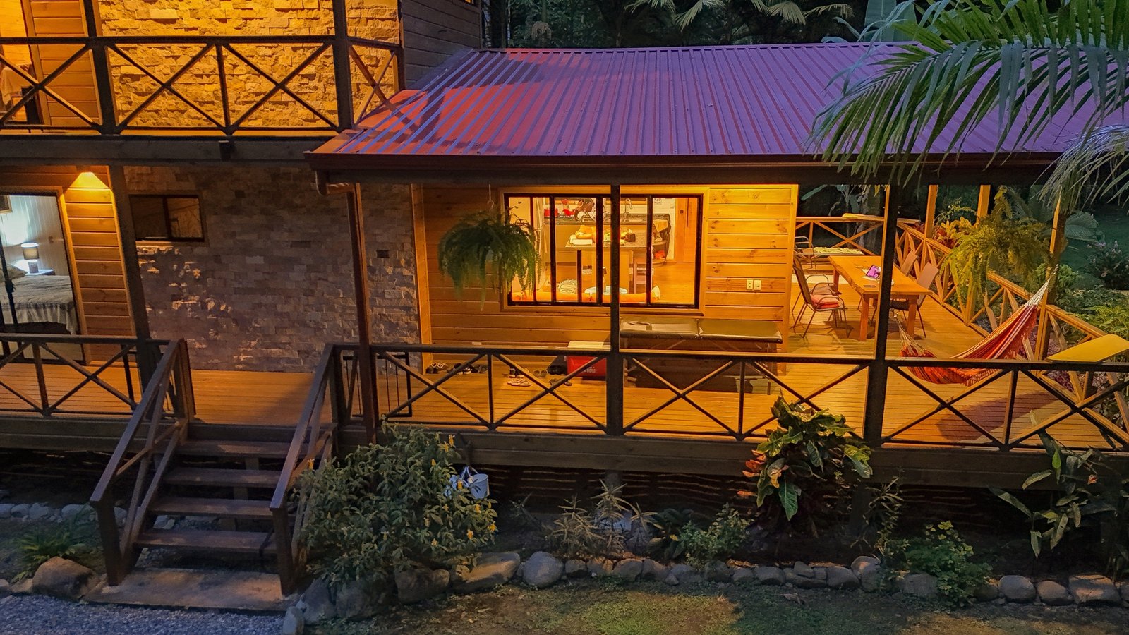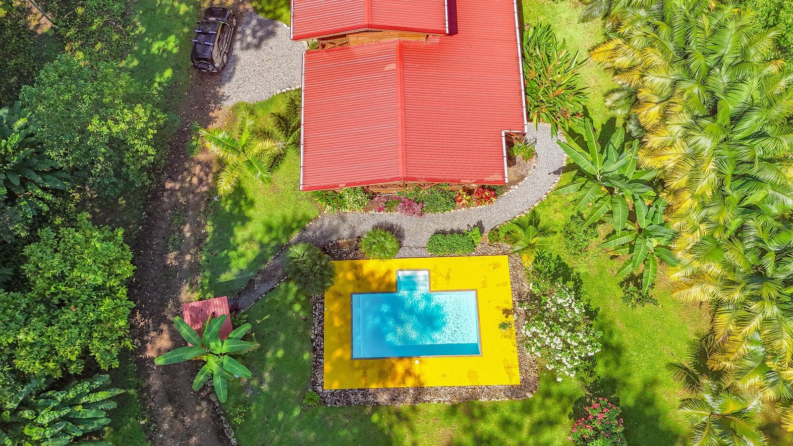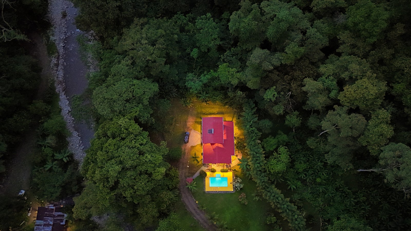This 2-level, 3-bedroom home fits PERFECTLY into its rainforest surroundings. Beautiful & warm lumber graces both the exterior and interior of the home & tastefully contrasts with the blue pool, sunny yellow pool-deck and the bright red roof of the home. Areas of external stone cladding anchor the home and compliment the riverstone banks of the nearby Rio Media Luna which borders the property.