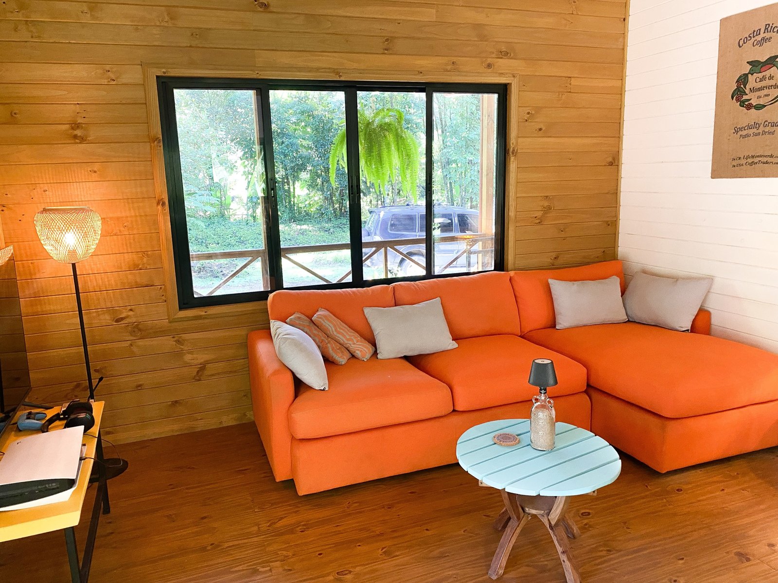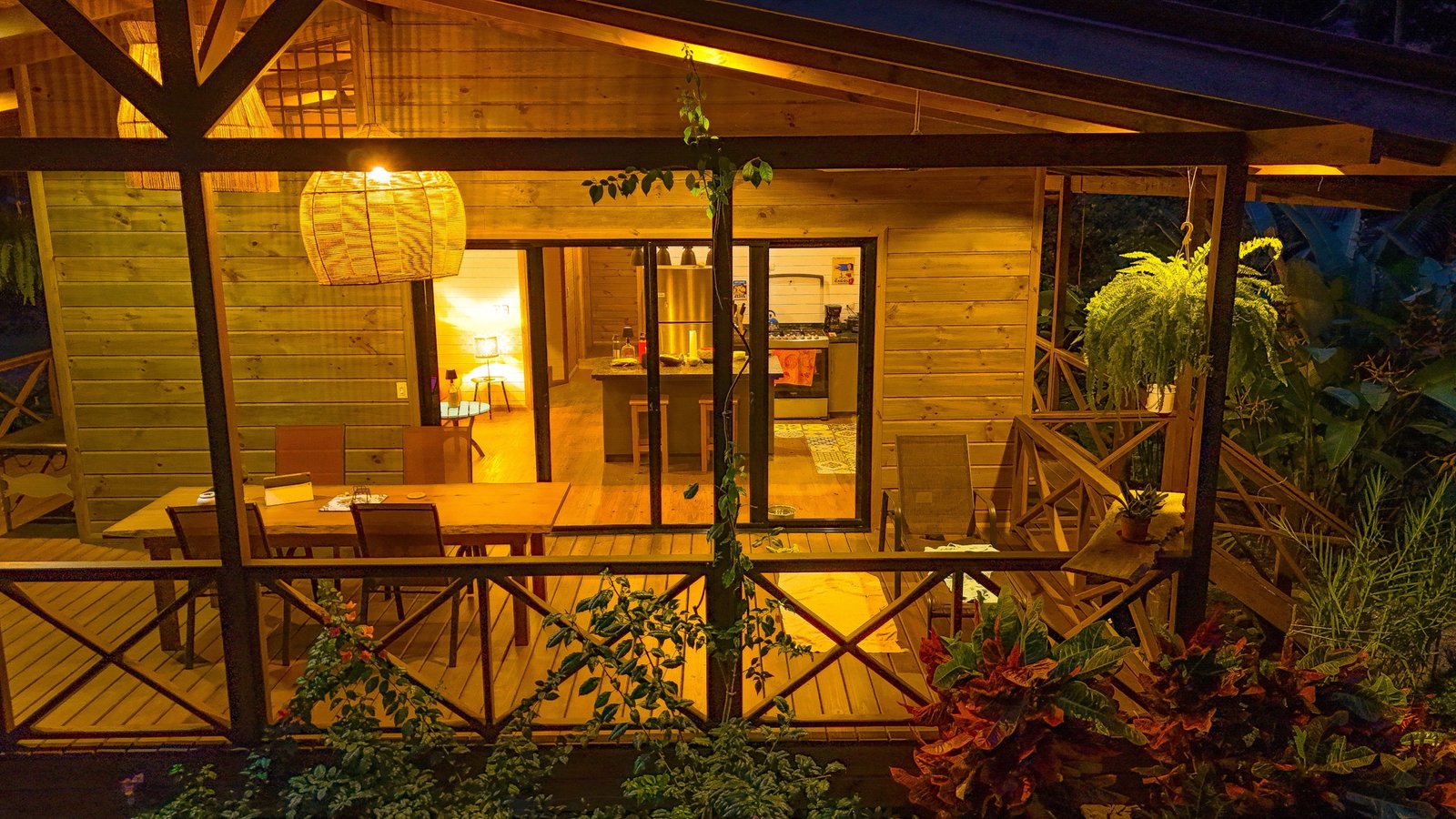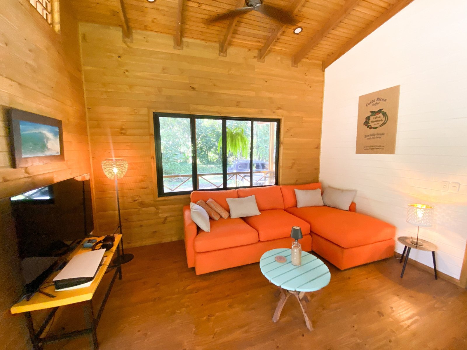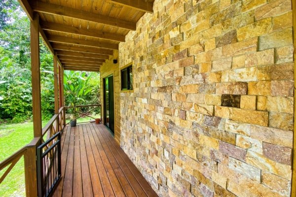 This wonderful home, of a beautiful and warm stone & lumber construction, is designed to take full advantage of the towering jungles that surround the property. Located on Cinco Ventanas road’s quiet, parallel off-shoot, this house is fully separated from the local through traffic and enjoys total peace & serenity. Towering rainforests surround this 0.7-acre property from every direction – a wall of green that creates a magical vibe you will never grow tired of. Full privacy without the isolation – and it is assured, as there will be no construction on the virgin land that touches the house. Beautiful gardens and landscaped lawns surround the home. And to complete this tranquil offer, a crystal-clear mountain river, draped in jungles, winds her way around the border of the property. Her burbling sound will help you drift off to sleep every evening.