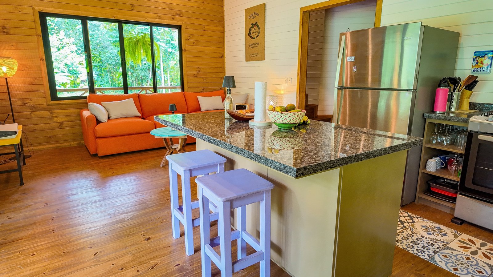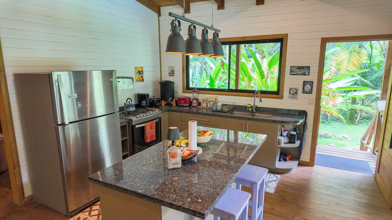 The fully equipped kitchen with a breakfast bar looks onto the greenery just outside the window. This central high-ceiling space is shared with the living / chill out area.