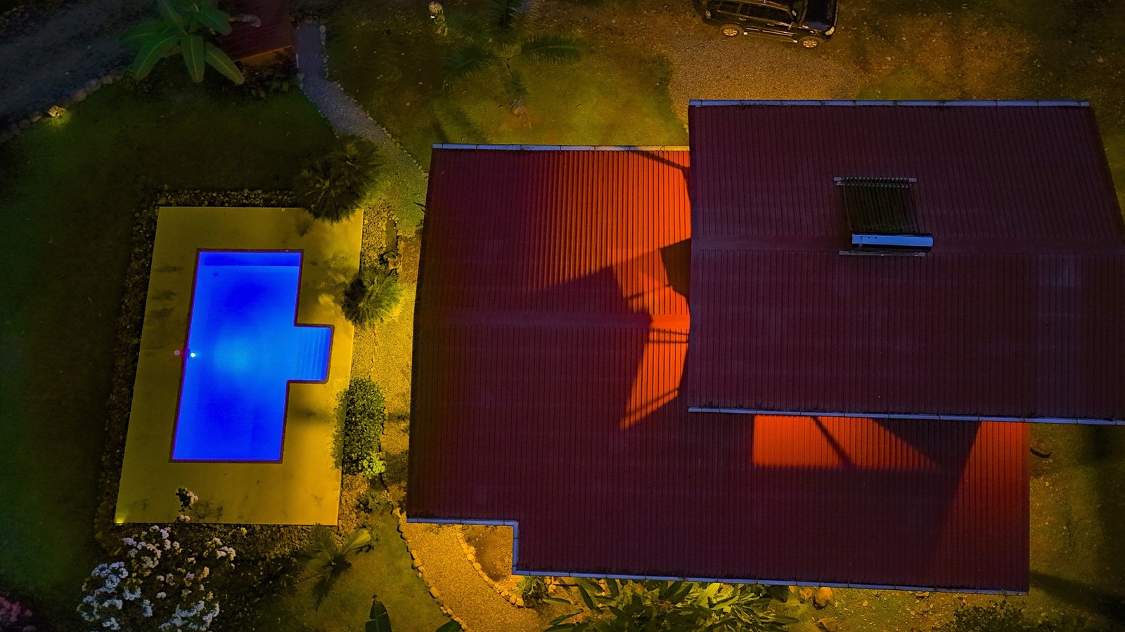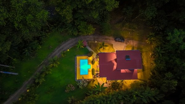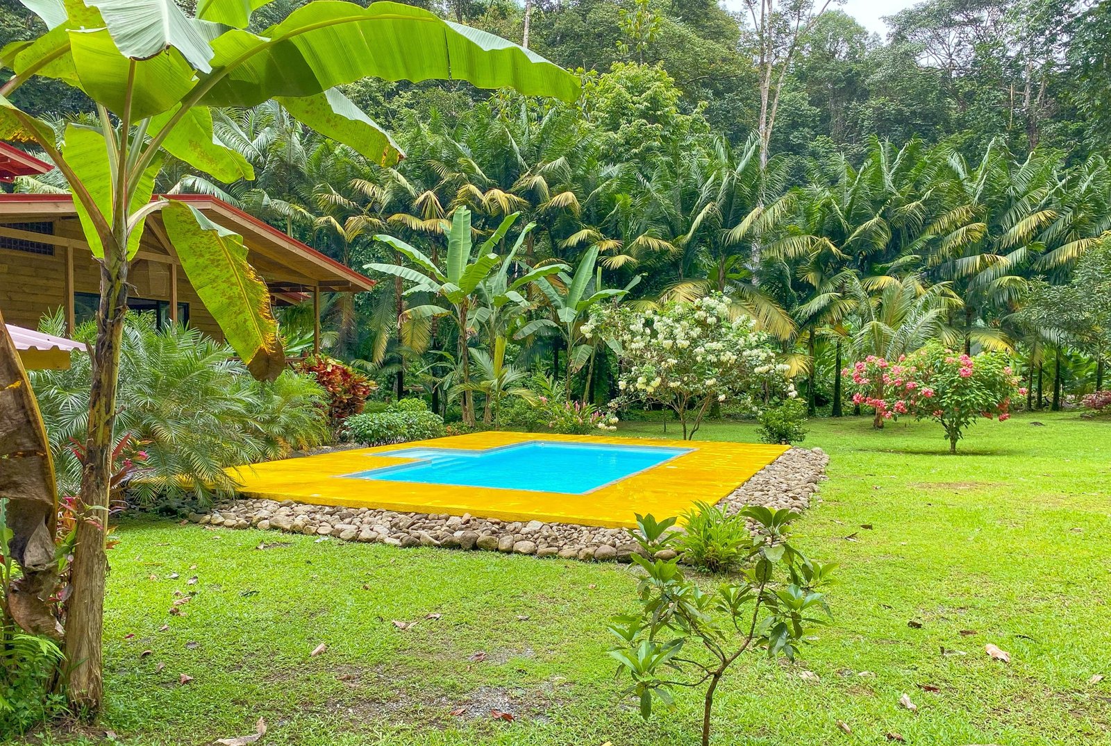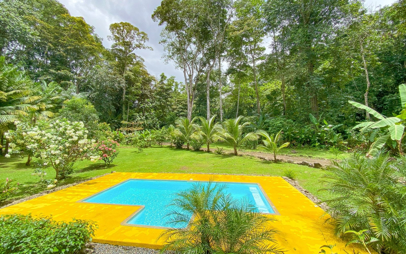 Just steps from the patio, a beautiful blue swimming pool with a yellow deck invites for a tropical dip. Poolside, your views are of the beautiful home, manicured lawns, orchards, lush landscaped grounds and tropical jungles. You are surrounded by brilliant tropical shrubs, palms and soaring rainforests that are teeming with monkeys, macaws, toucans, sloths, brilliant blue morpho butterflies and many other jungle critters.