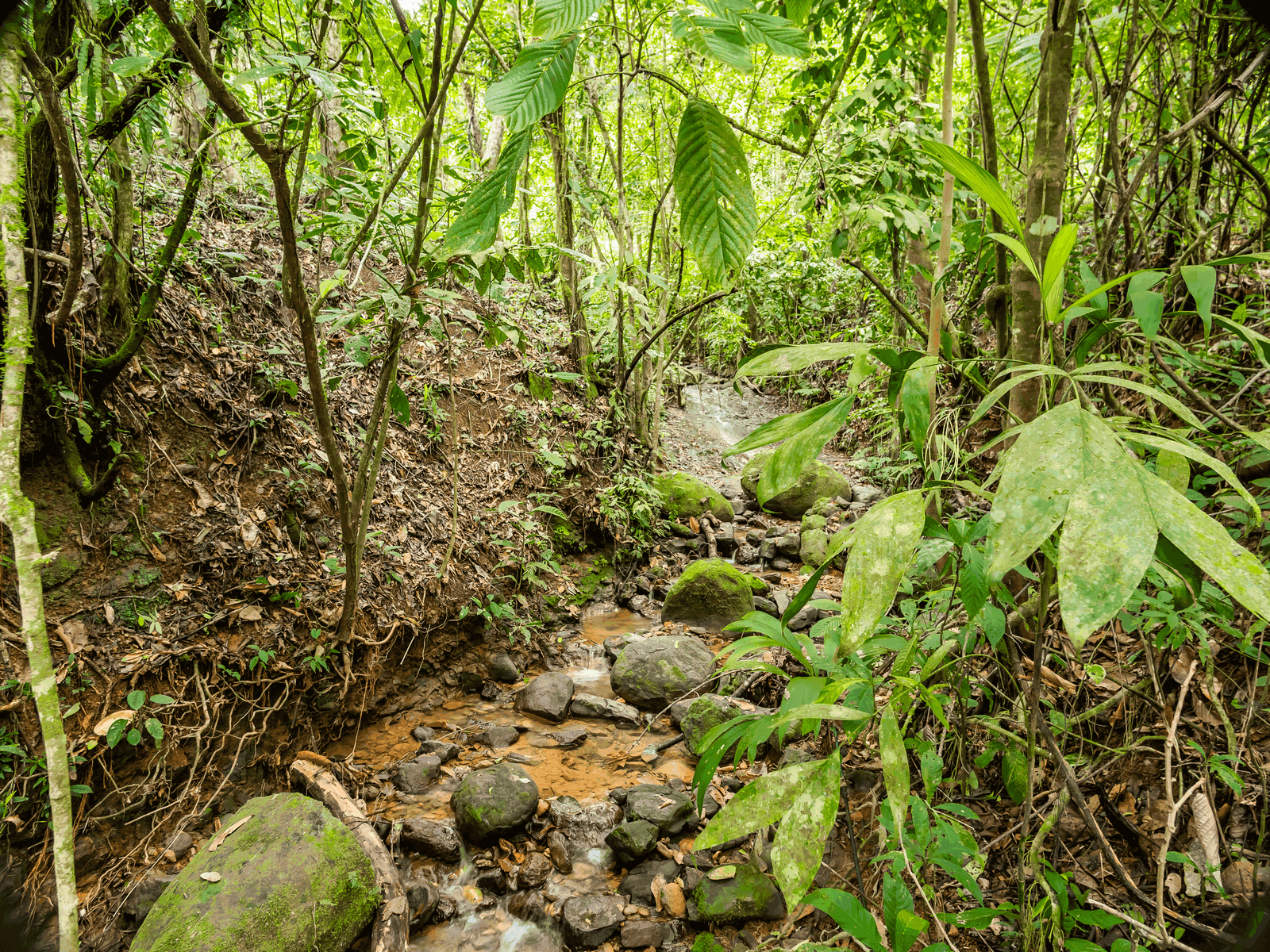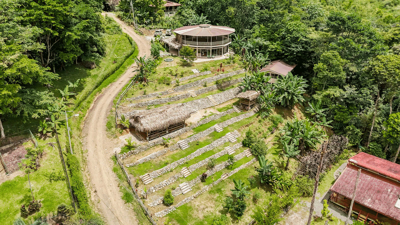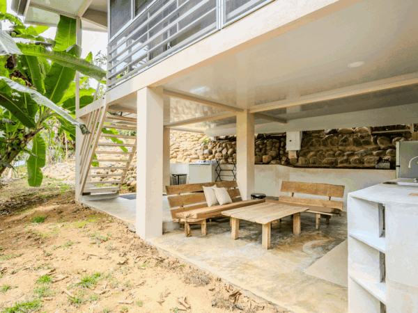 The multilevel edible garden is bursting with bananas, coconuts, papayas, mangos, passionfruit, water apples, yuca, sweet potatoes, katuk, bele, sacha inchi, and so much more. Stone paths and stairs wind through the landscape, creating a peaceful and enchanting experience as you explore.