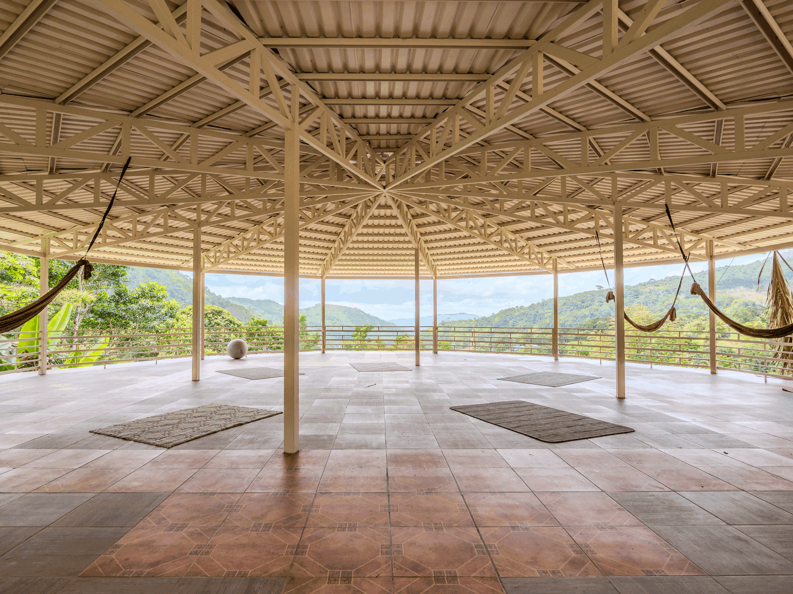 • The upper level (150m²) is a covered, open-air space ideal for yoga, meditation, music, art, or group gatherings—directly accessible from the private parking area.