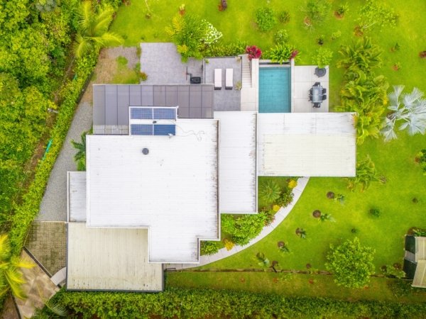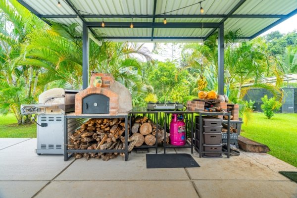 The covered patio with a wood-fired pizza oven and secondary kitchen beckons fun-filled dinners and celebrations under the rainforest canopy. Take a refreshing swim in the infinity pool while savoring sweeping views of the mountains, grassy lawns and fruit trees below. Watch little ones explore safely and freely in this extraordinary fully fenced natural playground.