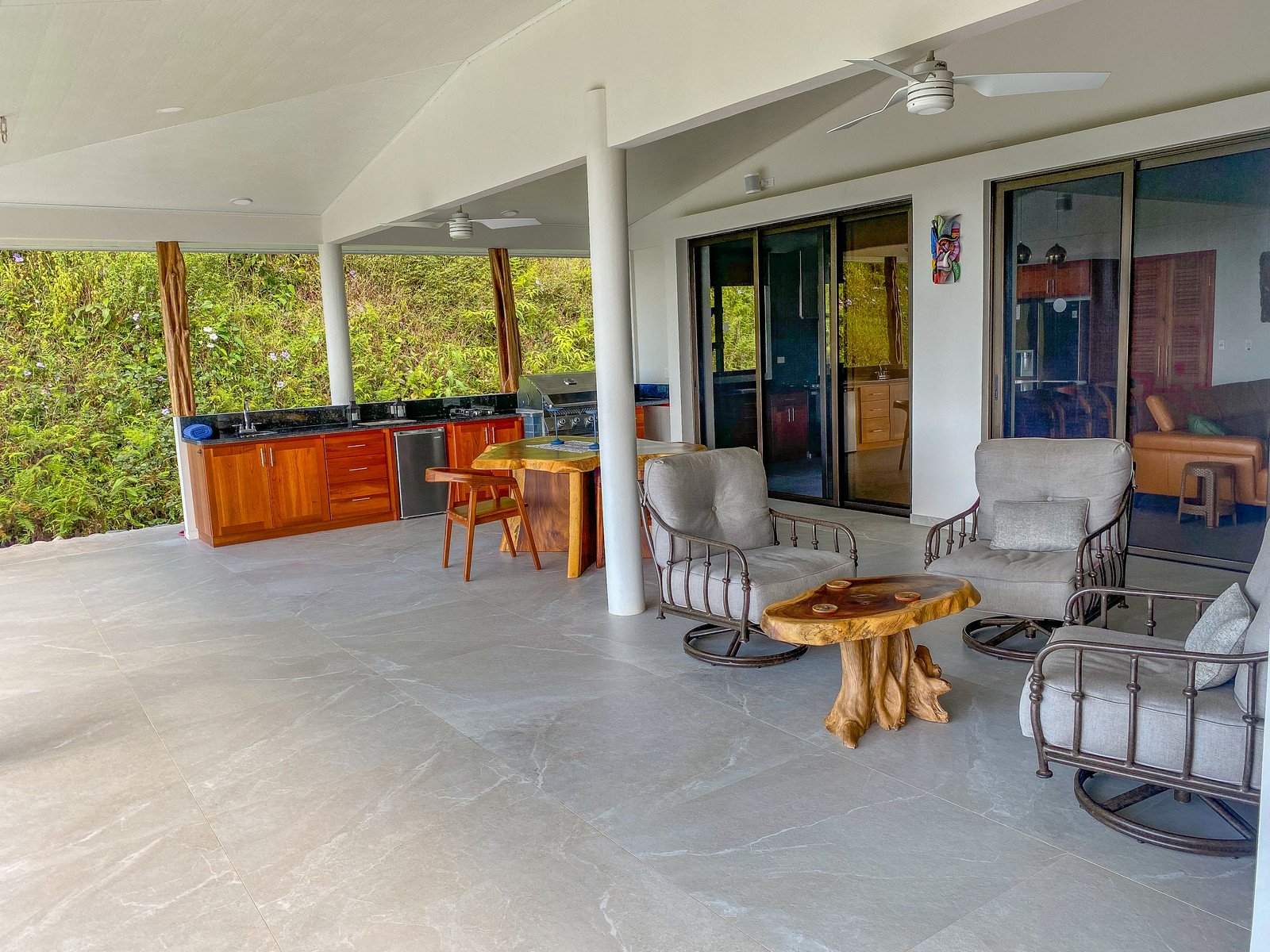The focal area of the home is the front patio – a vast, airy, covered space which faces directly towards the ocean vistas. And with plentiful lighting and fans, the patio can be enjoyed rain or shine, day or night. But to call this a patio is a vast understatement – with a full kitchen (sink, bar fridge, gas stove, BBQ and amazing counter & cabinet space) and a work-of-art solid lumber dining table, this area is bigger than most guest homes! A beautiful coffee table and additional seating are also offered.