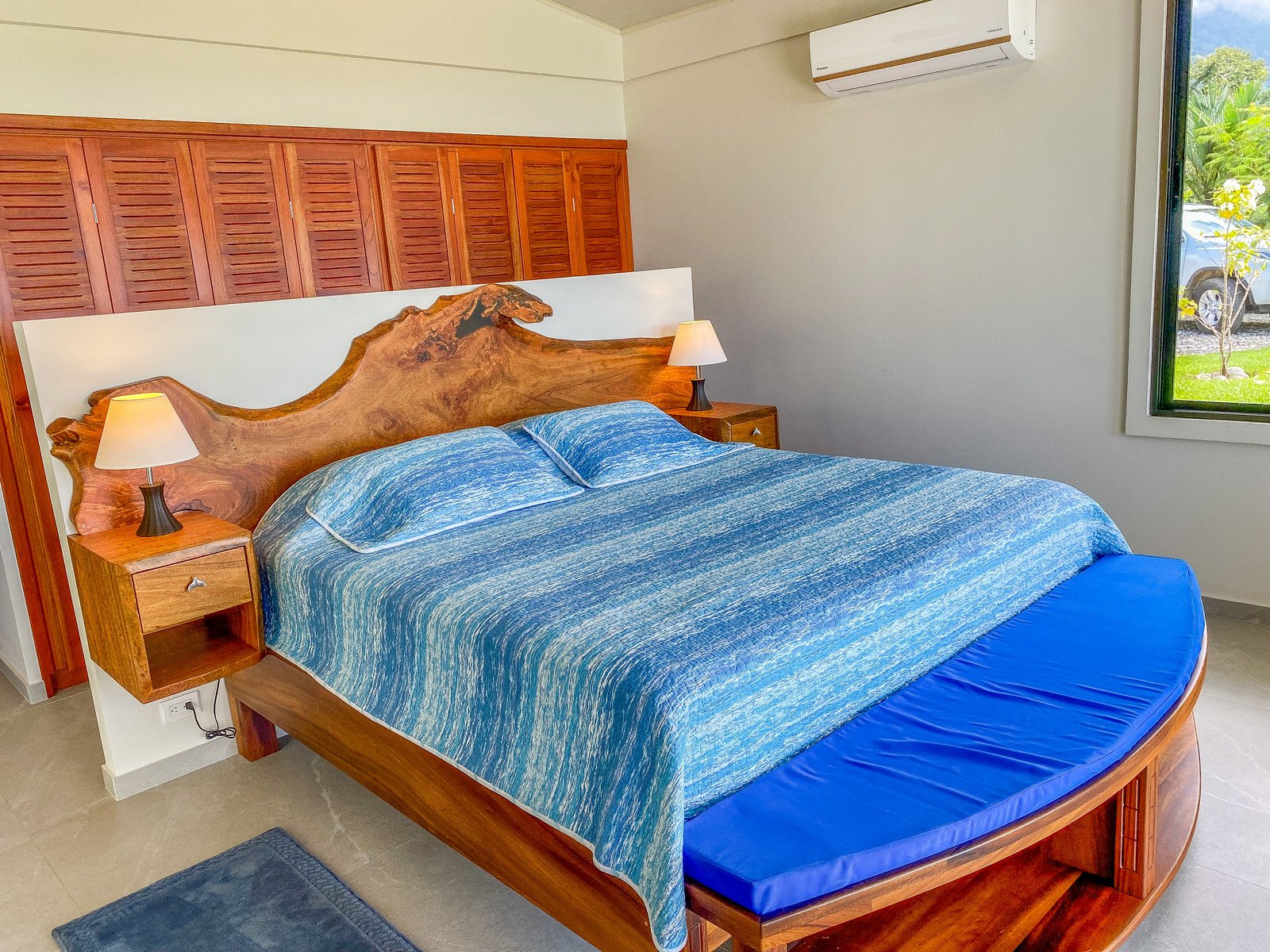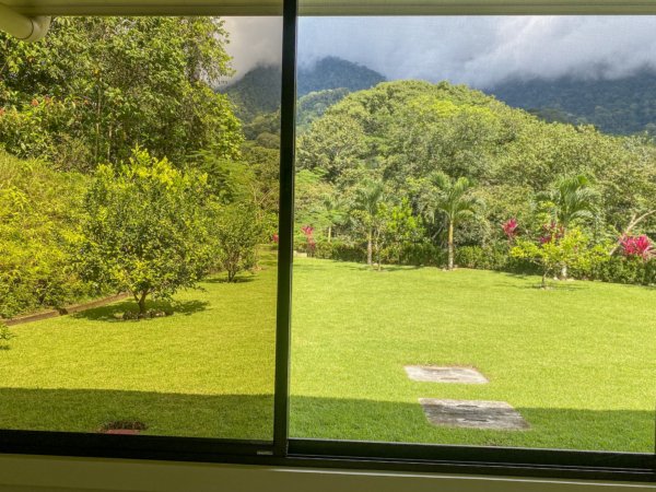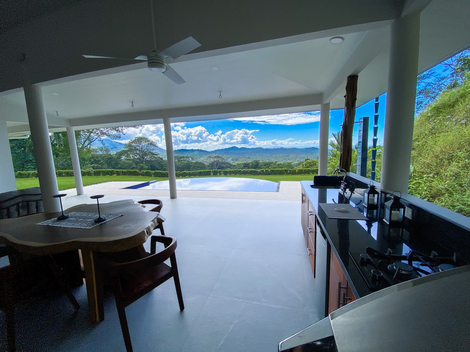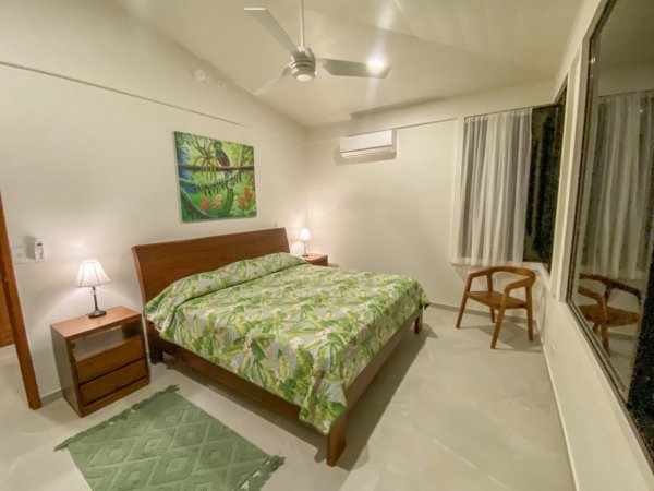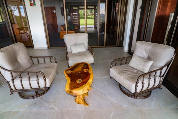 Also looking onto the ocean is the master bedroom – it benefits from a direct patio access via a sliding patio door, huge storage spaces, and a vast marble-clad ensuite. The lumber bed is absolutely beautiful. The second bedroom also holds a picturesque patio door, but it opens into the expansive manicured-lawn backyard behind the house. The back patio is covered and holds seating & a coffee table. Here, the ocean vistas are replaced by equally breathtaking, towering coastal mountains and their majestic cloud forests and primary jungles – not to mention the seasonal waterfalls.