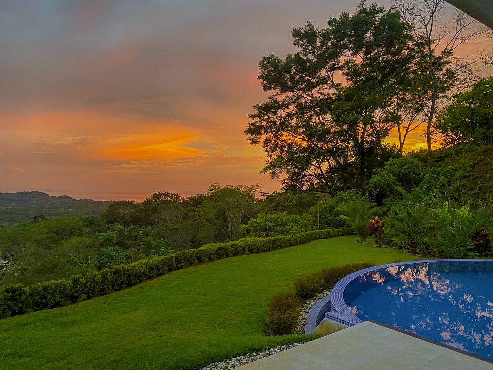 The star of the show are the Pacific Ocean vistas, framed by rolling hills and lowland tropical rainforests. A truly ‘Costa Rica’ view – and the sunsets are spectacular! In the distance, the wild of Osa Peninsula and Corcovado National Park hug the horizon. Behind the home, coastal mountains rise sharply to over 1,000 meters or 3,300 feet – they grace the home with refreshing & cooling breezes. In the green season, waterfalls hundreds of meters in height can be seen (and heard) descending down their nearly vertical slopes. The mountains and hills are covered by thick primary jungles and misty cloud forests – this is where Jaguars and Tapirs roam free.