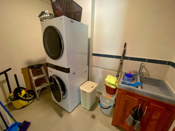The main living / dining / kitchen area anchors the home. A sprawling, plus-sized kitchen will cater to the biggest of gatherings, with a breakfast bar complimenting the outdoor dining table. The counter and cabinet space needs to be seen to be believed! A large living area with a comfy L-couch, TV and a stunning lumber cabinet stands to entertain. Two shared bathrooms, a large pantry with a freezer, a storage nook and a fully equipped laundry room with a sink complete this amazing offer. The house is fully air-conditioned and decorated with vibrant tropical art & thoughtful classy accessories.