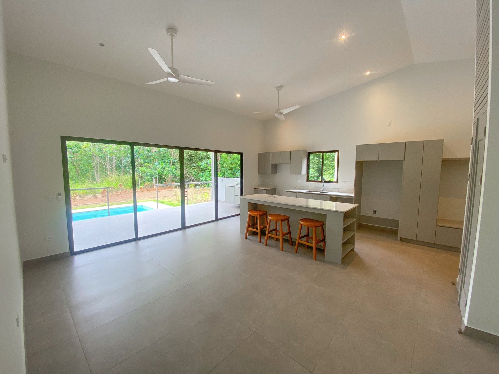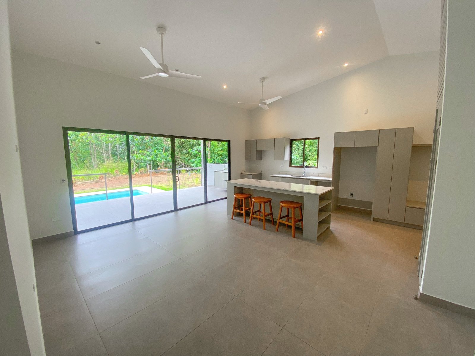The driveway leads straight into the carport with direct indoor access to the home – guaranteeing you will stay dry & happy while bringing in the groceries. The central kitchen / dining / living area offers high ceilings, spectacular jungle views and a breakfast bar. Storage & cabinet space is absolutely massive, more than enough to cater for the largest of pantries. Direct access to the backyard patio & swimming pool is provided via huge panoramic sliding doors – and the view behind this glass wall is green, lush & tropical.