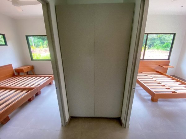 A large, corner master bedroom offers plentiful glazing, rainforest views, and direct access to the backyard patio area. Shelving and storage space does not disappoint. Two more bedrooms are equally well equipped, with one also offering external patio access.