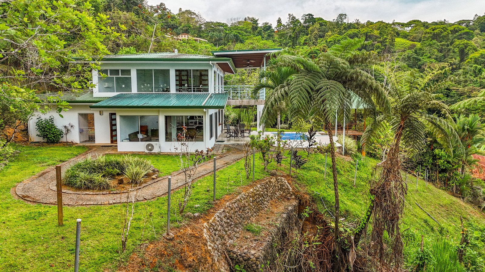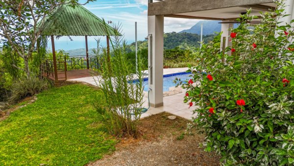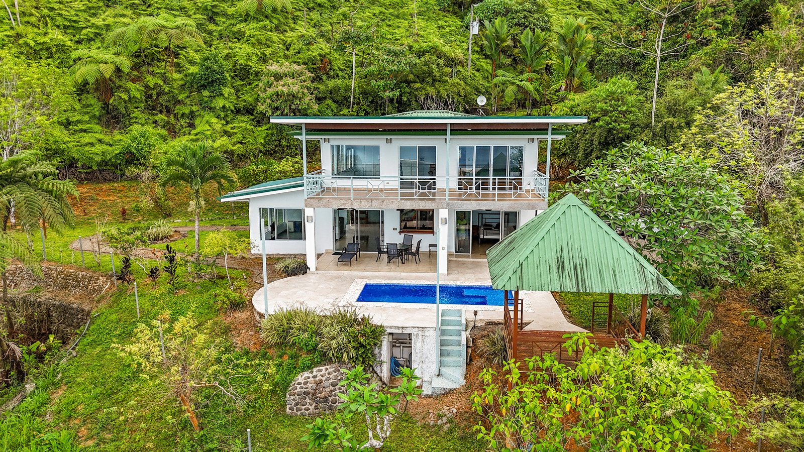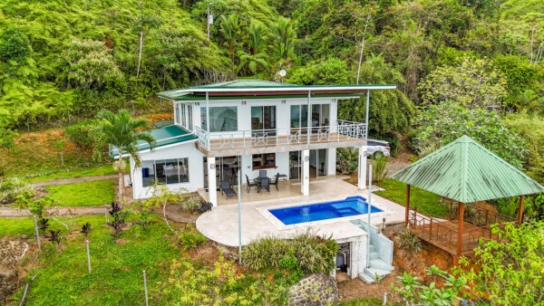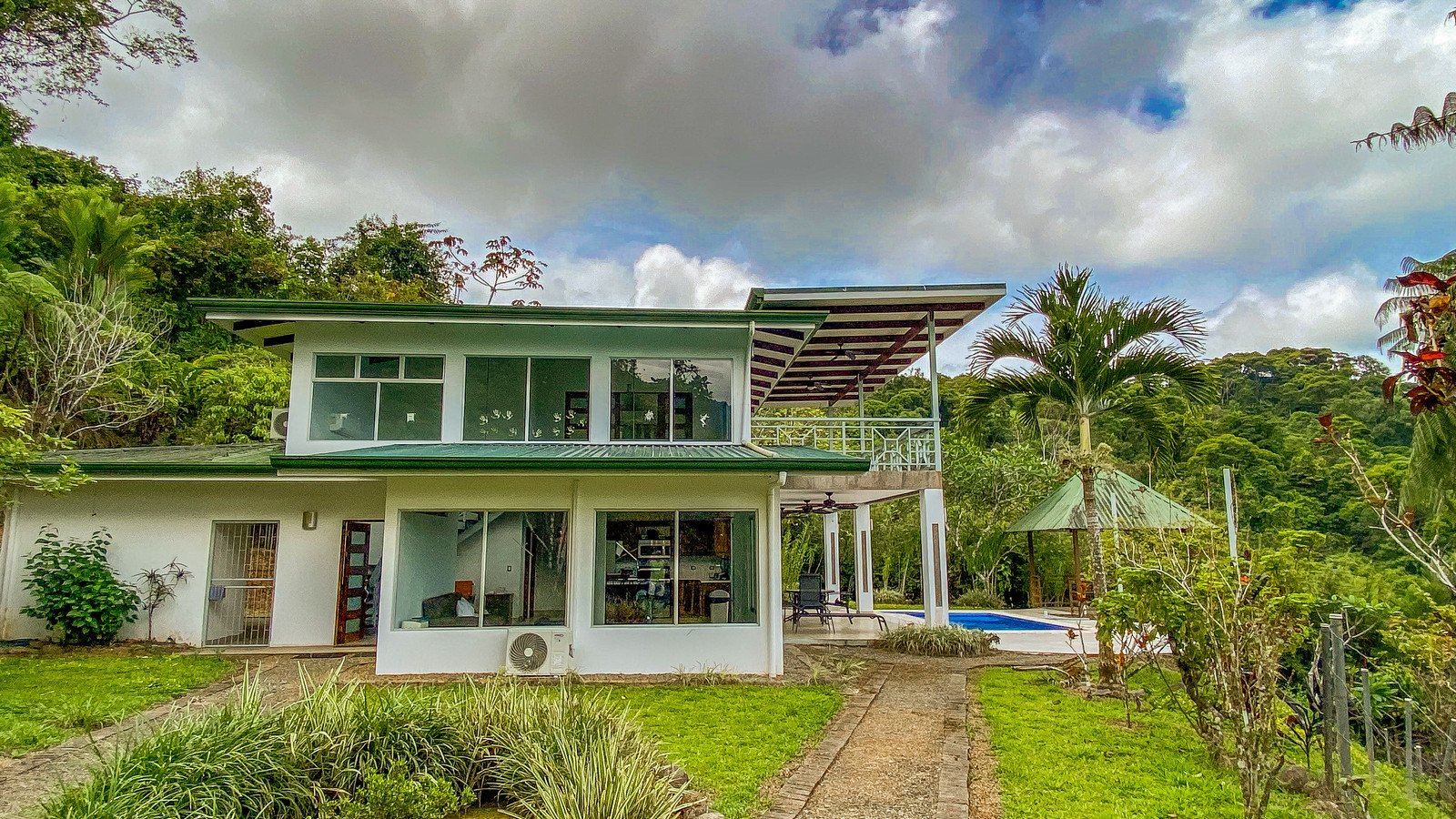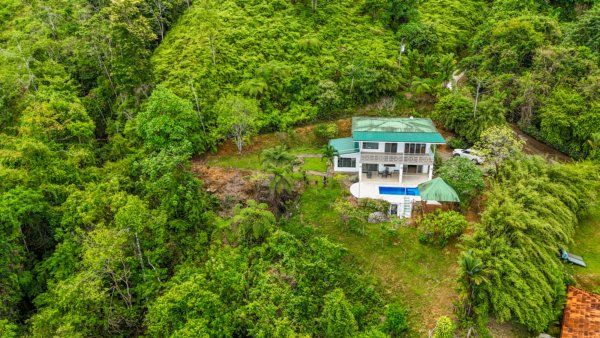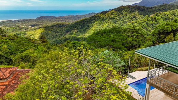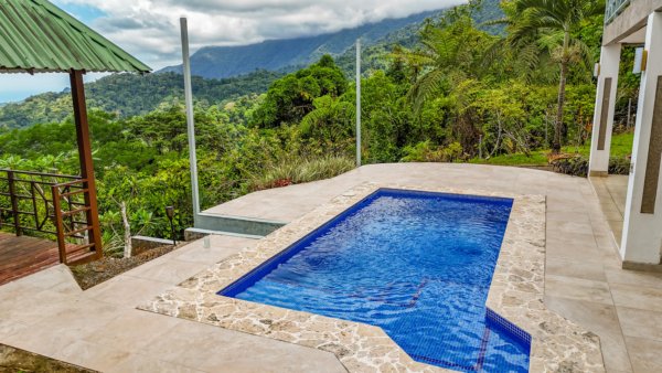 This beautiful 11,129 m2 or 2.75-acre property for sale near Ojochal rests 520 meters or 1710 feet above lush hills, rainforests and Pacific shores giving unforgettable mountain, jungle and both white and blue-water ocean sunset views. The elevation also blesses the grounds with cooler temperatures and refreshing breezes. Privacy is assured and the friendly expat neighbours will soon become your friends. Access is via a prepared and recently upgraded public road which then goes on to San Isidro (an important road which will always be kept in good shape). A prepared concrete driveway ascends to the covered carport and additional parking area behind the home. A swimming pool, gazebo and lush tropical grounds complete this jungle immersed offer.