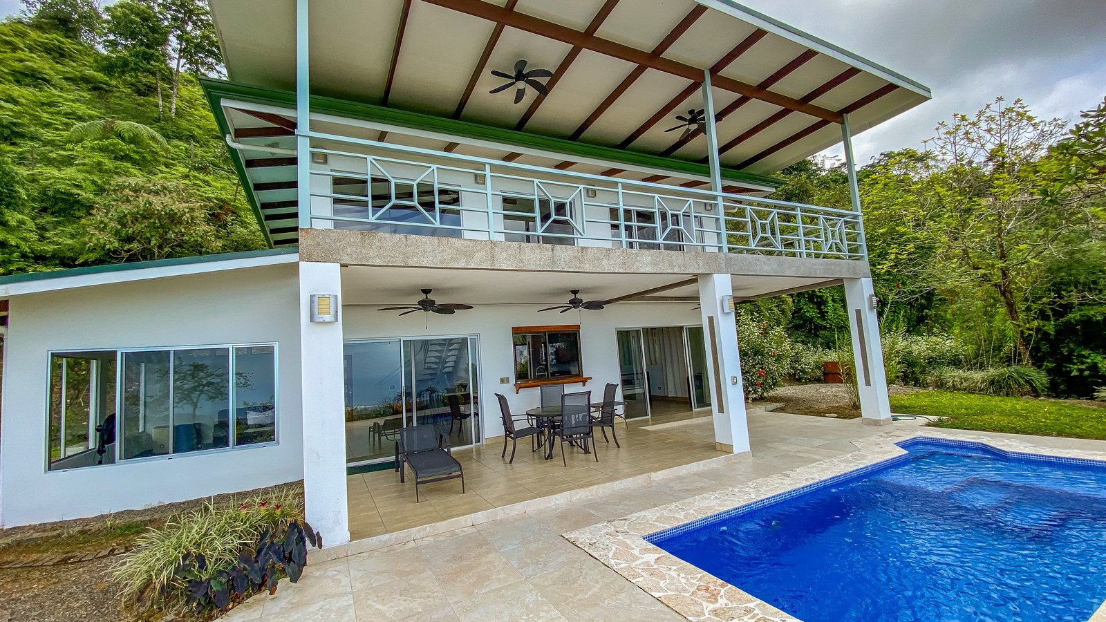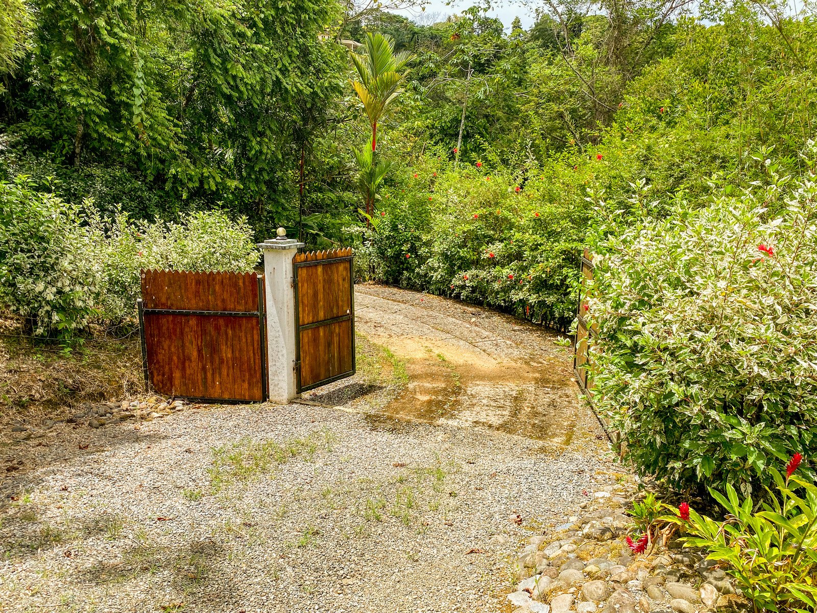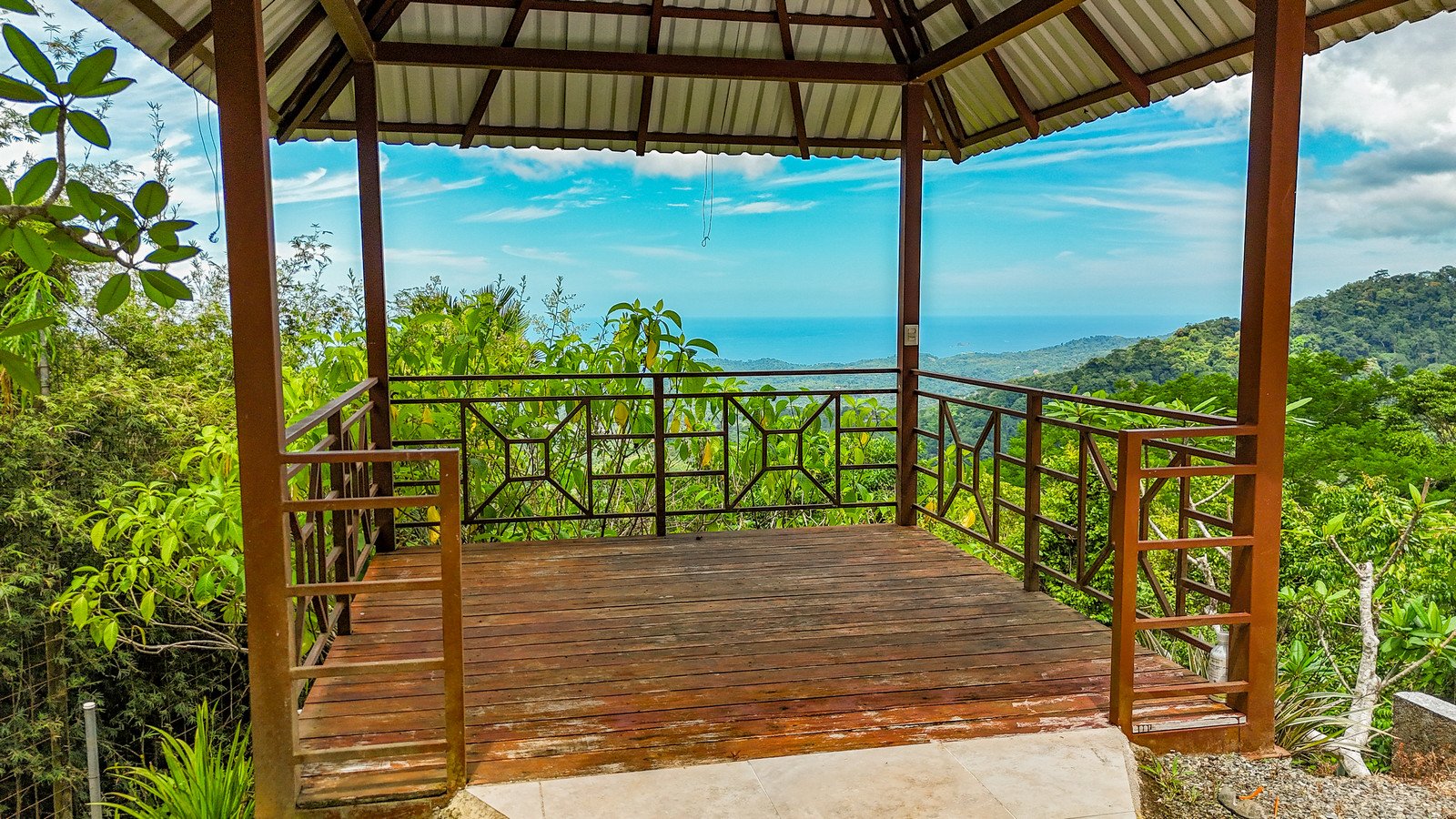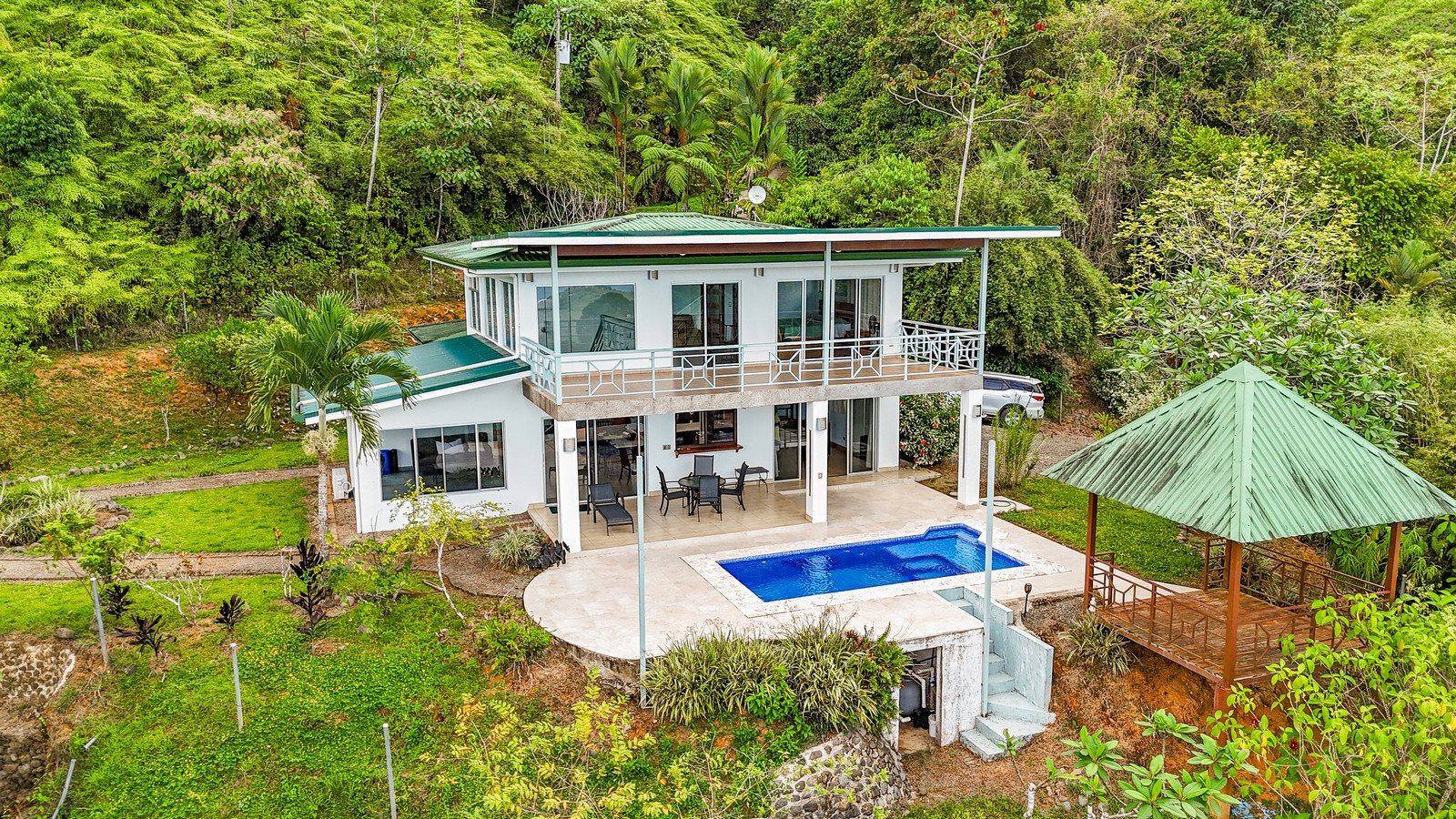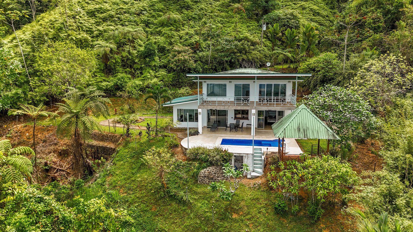This beautiful 11,129 m2 or 2.75-acre property for sale near Ojochal rests 520 meters or 1710 feet above lush hills, rainforests and Pacific shores giving unforgettable mountain, jungle and both white and blue-water ocean sunset views. The elevation also blesses the grounds with cooler temperatures and refreshing breezes. Privacy is assured and the friendly expat neighbours will soon become your friends. Access is via a prepared and recently upgraded public road which then goes on to San Isidro (an important road which will always be kept in good shape). A prepared concrete driveway ascends to the covered carport and additional parking area behind the home. A swimming pool, gazebo and lush tropical grounds complete this jungle immersed offer.