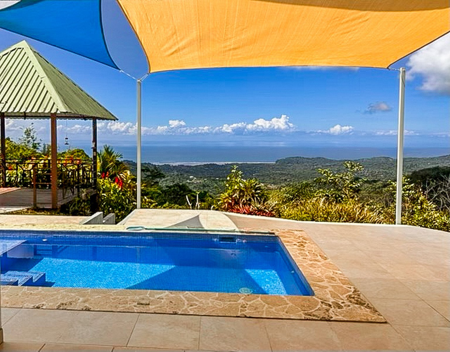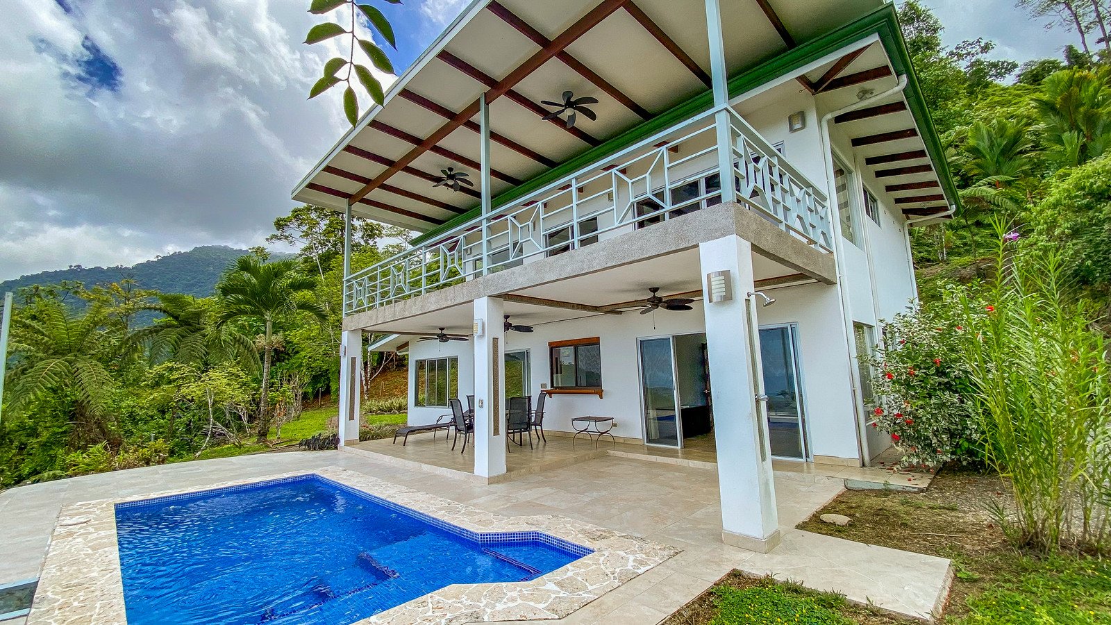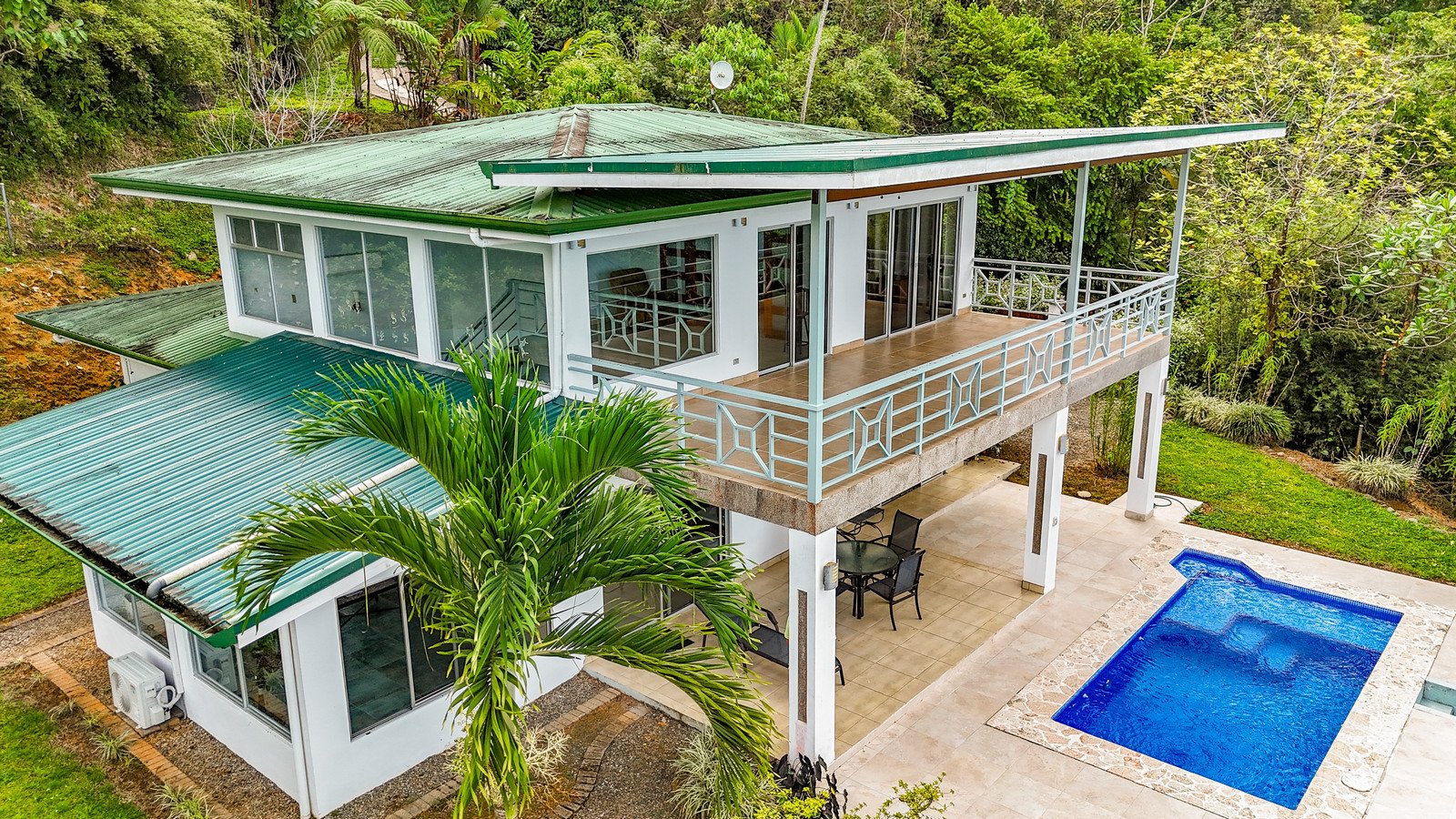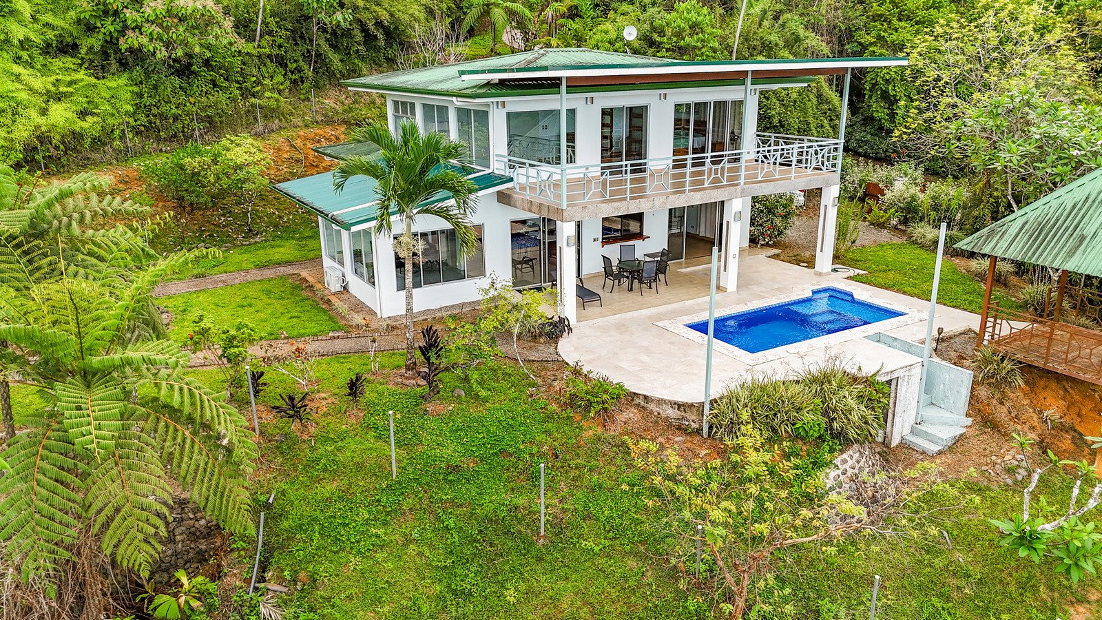 This beautiful 11,129 m2 or 2.75-acre property for sale near Ojochal rests 520 meters or 1710 feet above lush hills, rainforests and Pacific shores giving unforgettable mountain, jungle and both white and blue-water ocean sunset views. The elevation also blesses the grounds with cooler temperatures and refreshing breezes. Privacy is assured and the friendly expat neighbours will soon become your friends. Access is via a prepared and recently upgraded public road which then goes on to San Isidro (an important road which will always be kept in good shape). A prepared concrete driveway ascends to the covered carport and additional parking area behind the home. A swimming pool, gazebo and lush tropical grounds complete this jungle immersed offer.