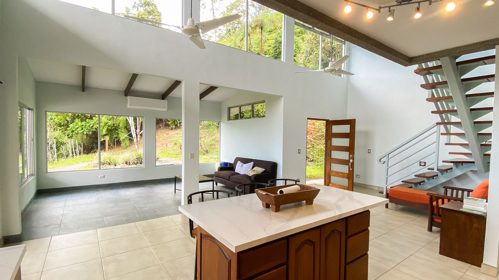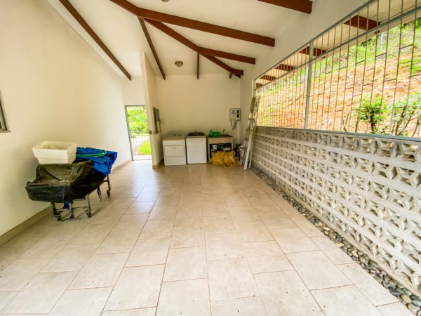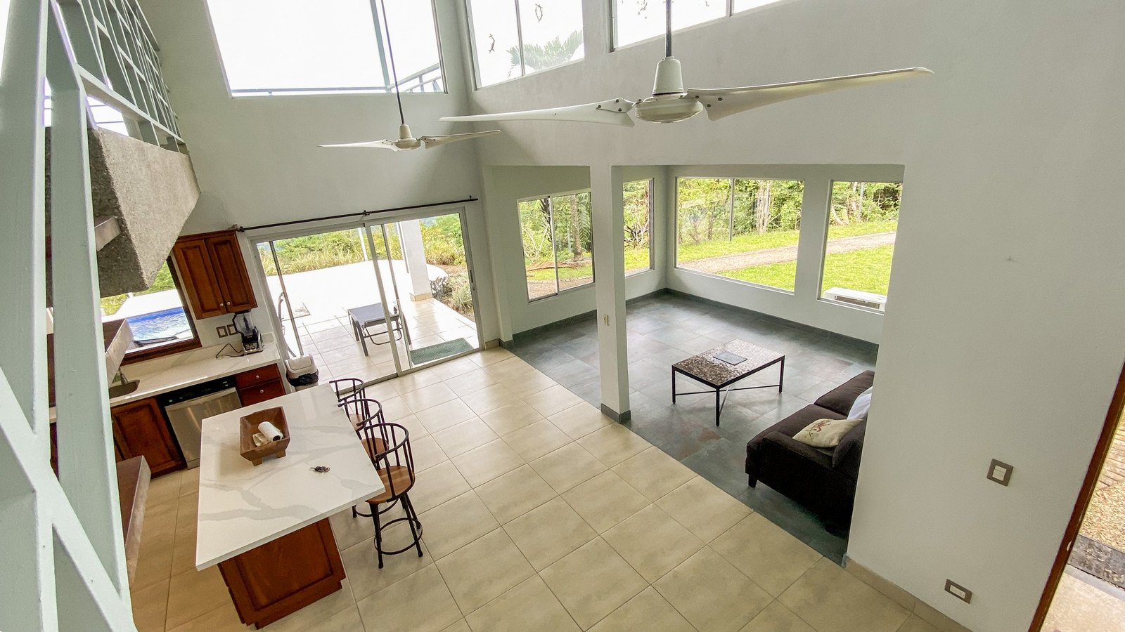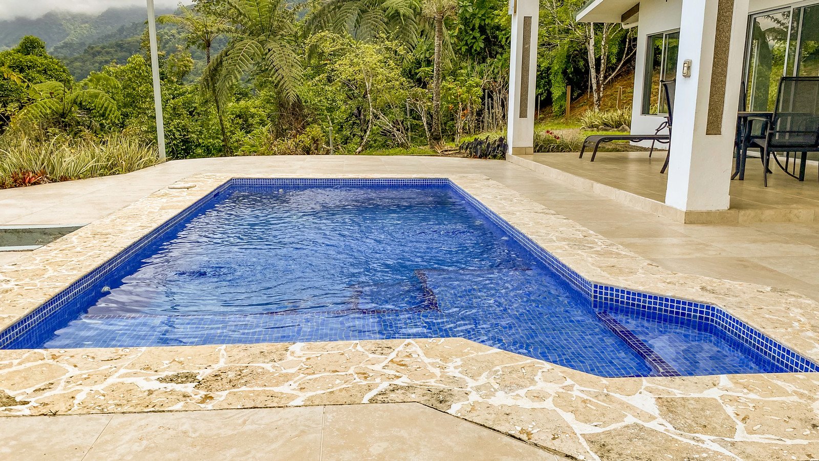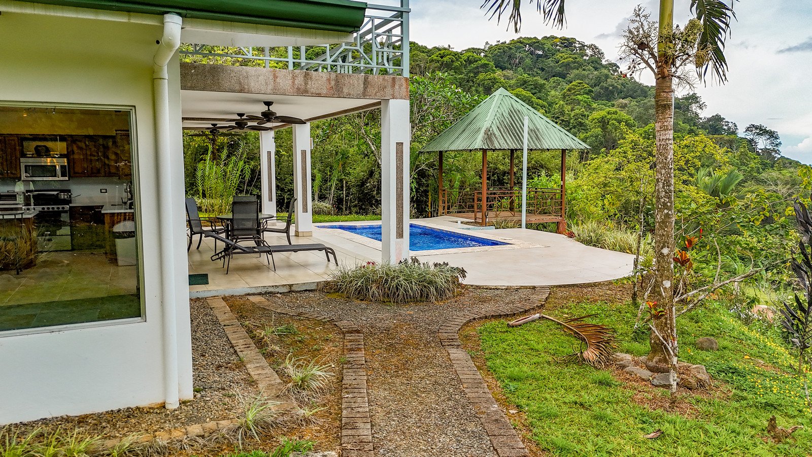 A refreshing, sunny pool fronts the downstairs patio. Surrounded by a stone deck, it offers plenty of space for lounging or suntanning. A sizeable gazebo sits on the far end of the pool – this is where you can relax every evening, a cold drink in hand, enjoying the jungle symphony while awaiting the spectacular crimson sunset. Areas of manicured lawns, tropical plantings, pathways and wild jungle growth surround the home. Most of the land is covered by a rainforest and borders a creek called Quebrada Lajas (roughly: Flat Stone Creek).