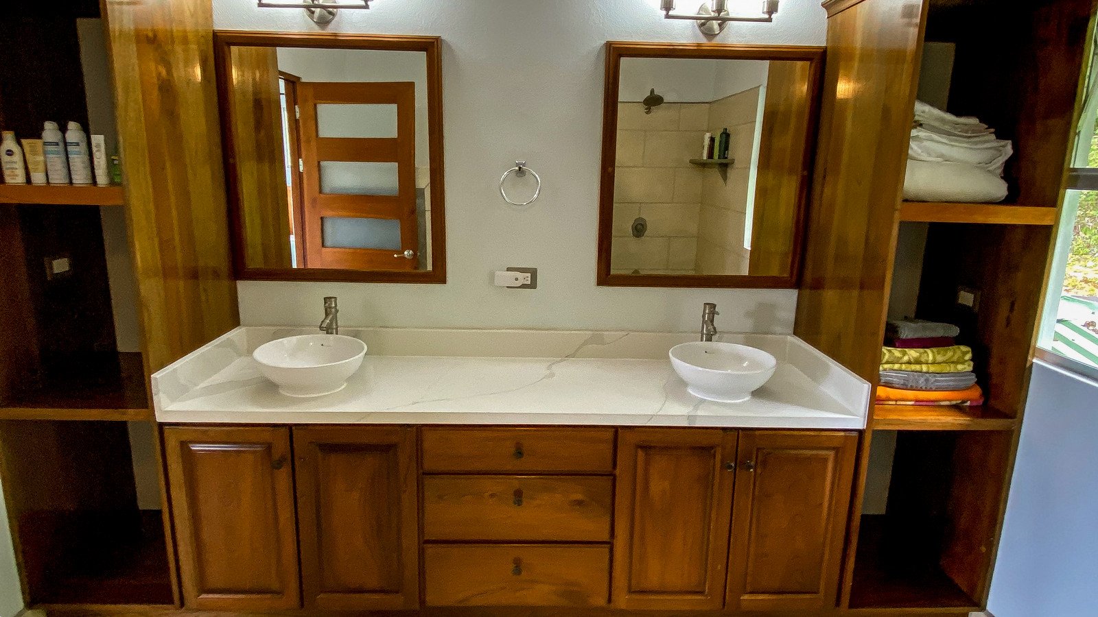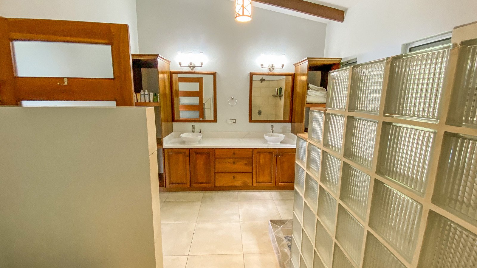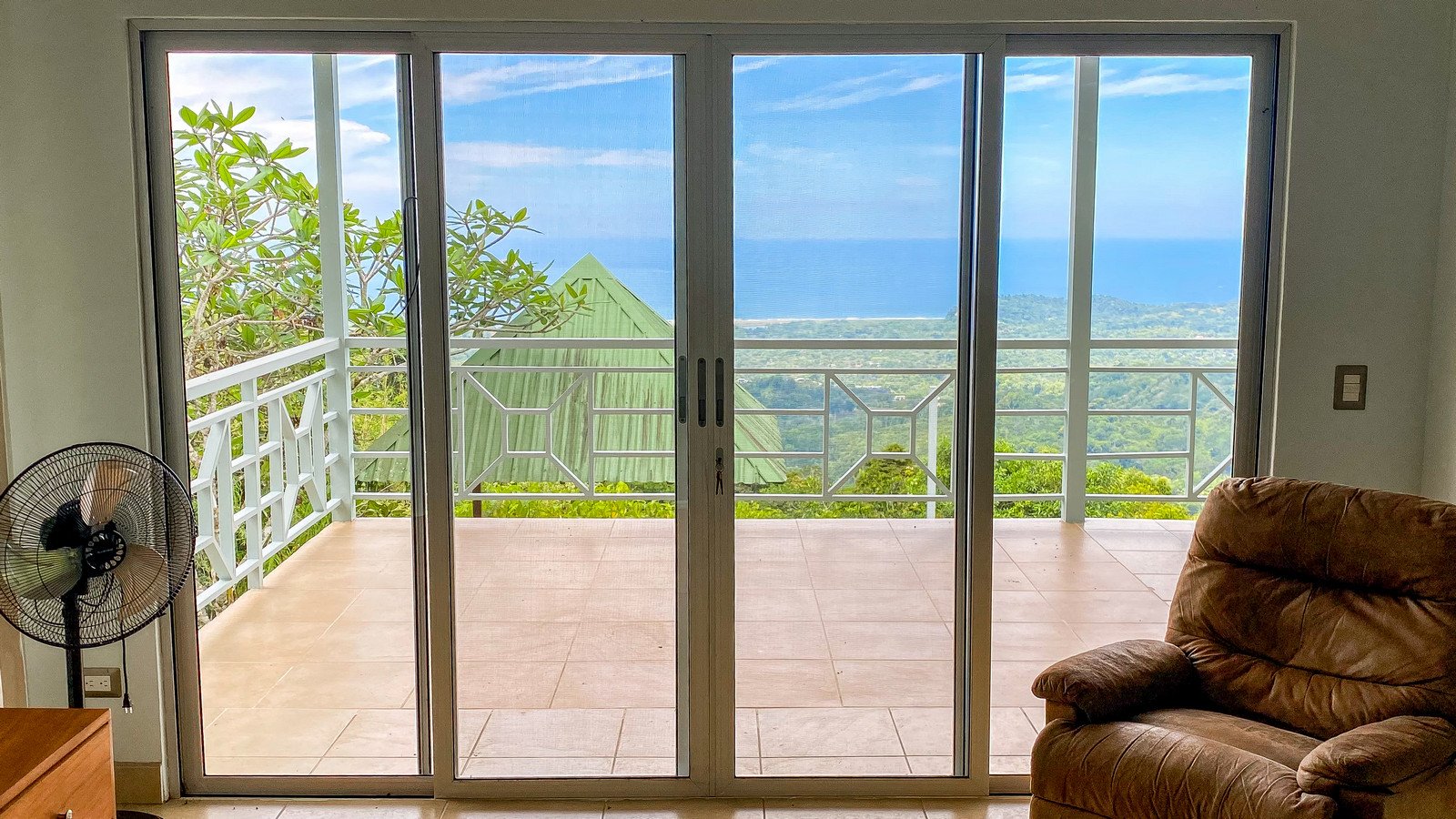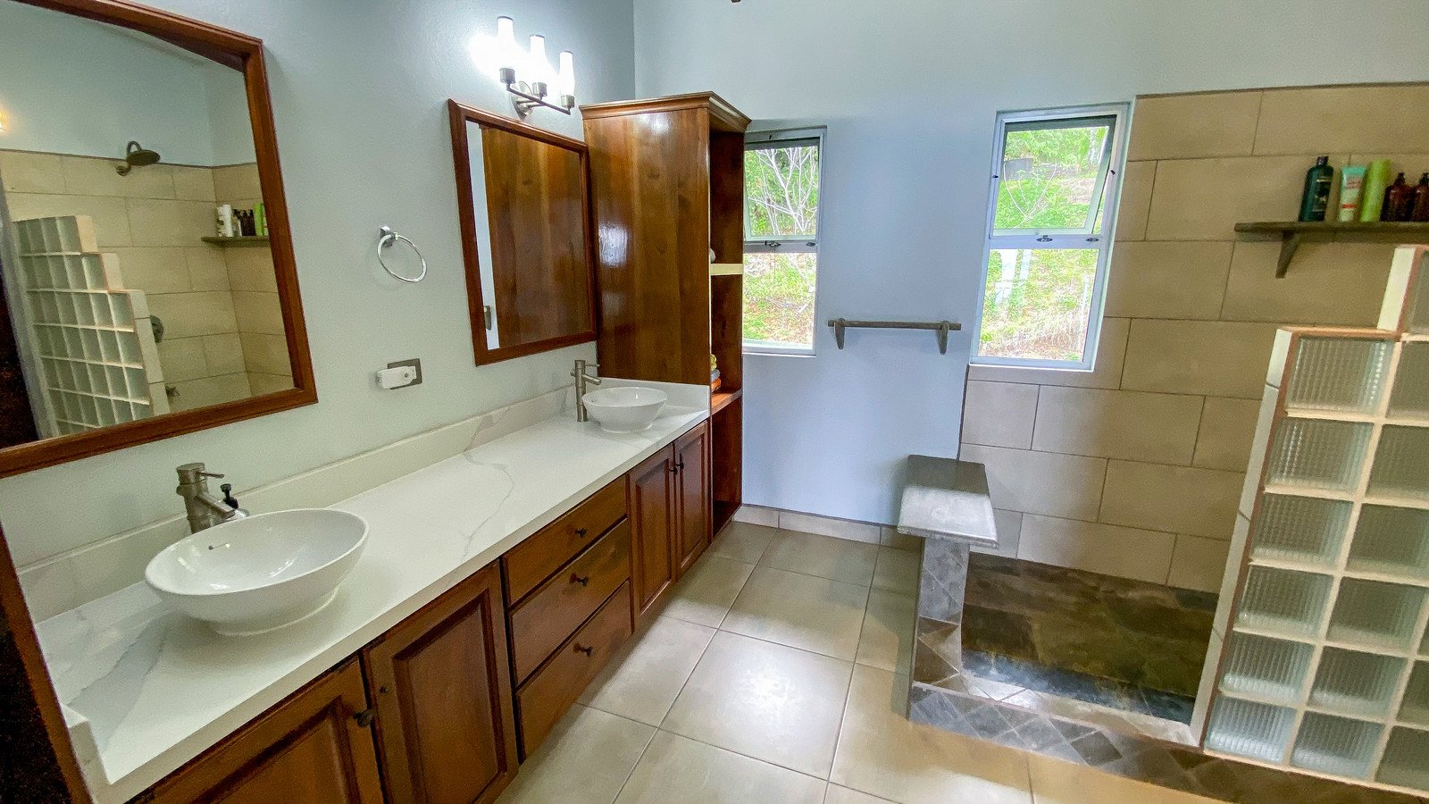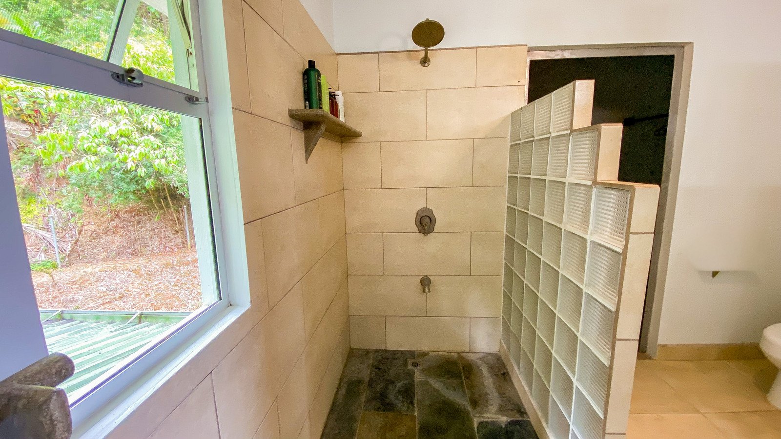 A refreshing, sunny pool fronts the downstairs patio. Surrounded by a stone deck, it offers plenty of space for lounging or suntanning. A sizeable gazebo sits on the far end of the pool – this is where you can relax every evening, a cold drink in hand, enjoying the jungle symphony while awaiting the spectacular crimson sunset. Areas of manicured lawns, tropical plantings, pathways and wild jungle growth surround the home. Most of the land is covered by a rainforest and borders a creek called Quebrada Lajas (roughly: Flat Stone Creek).