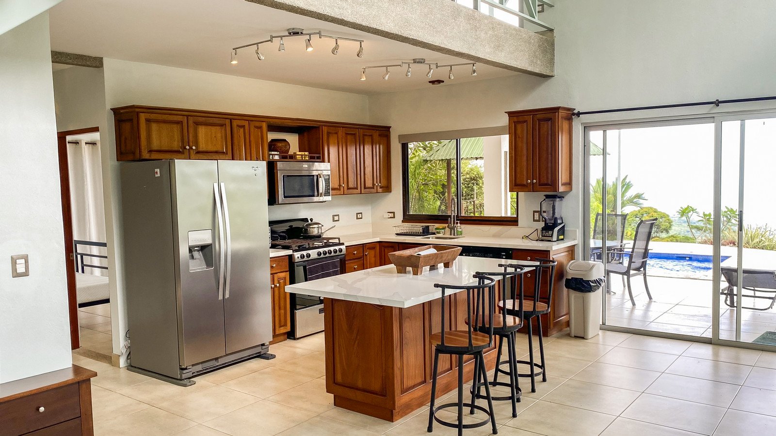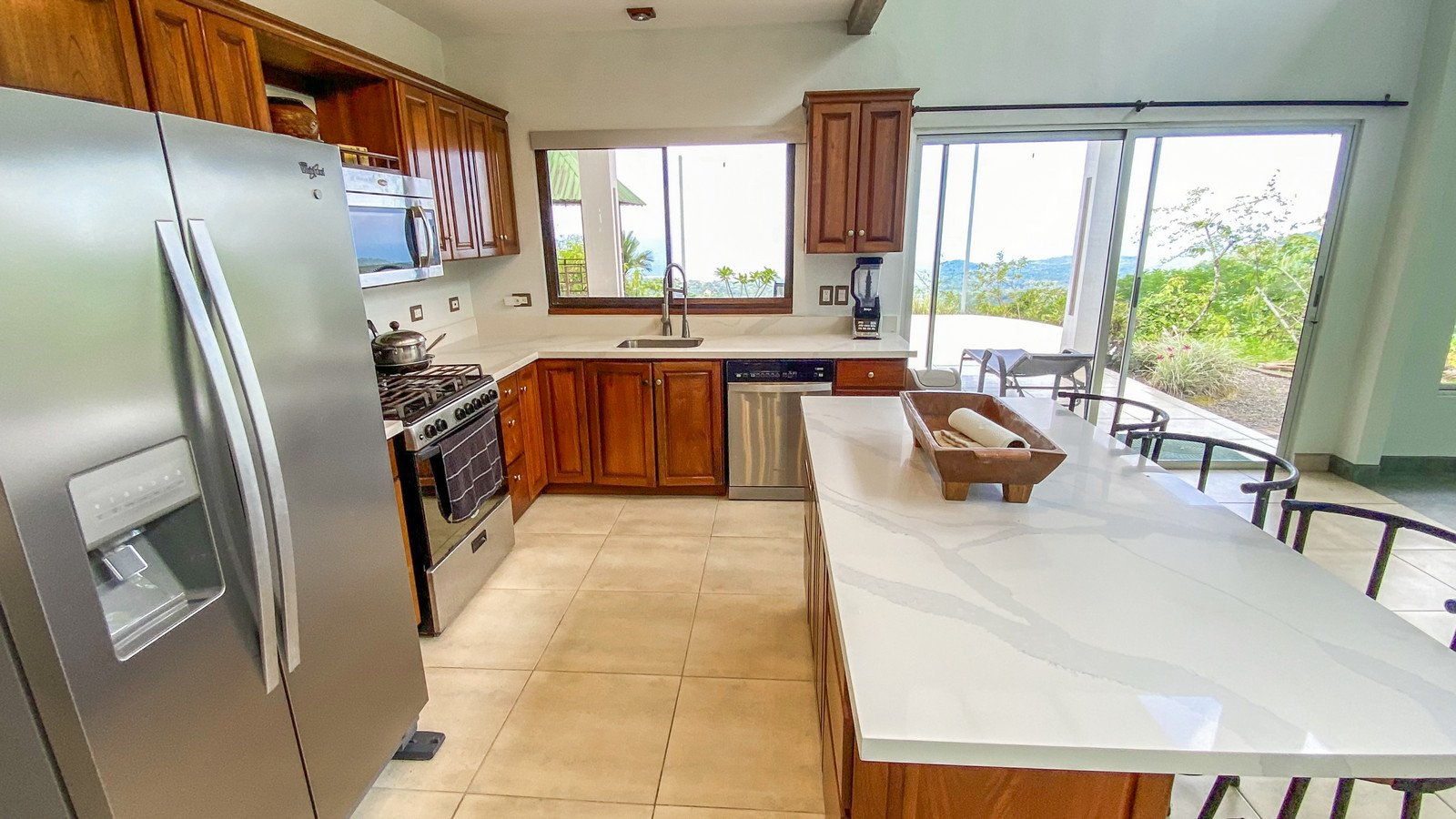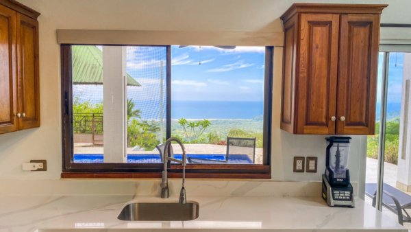 This home’s layout takes FULL advantage of the marvellous vistas that stretch before it. The two-level covered patio acts as a transition space between ‘inside’ and ‘outside’ – with the lower patio connecting to the deck and sunny swimming pool and the upper one towering above the Pacific shorelines. These wonderful patios, served by ceiling fans and lighting, offer space for lounging, entertaining, working and BBQ-ing.