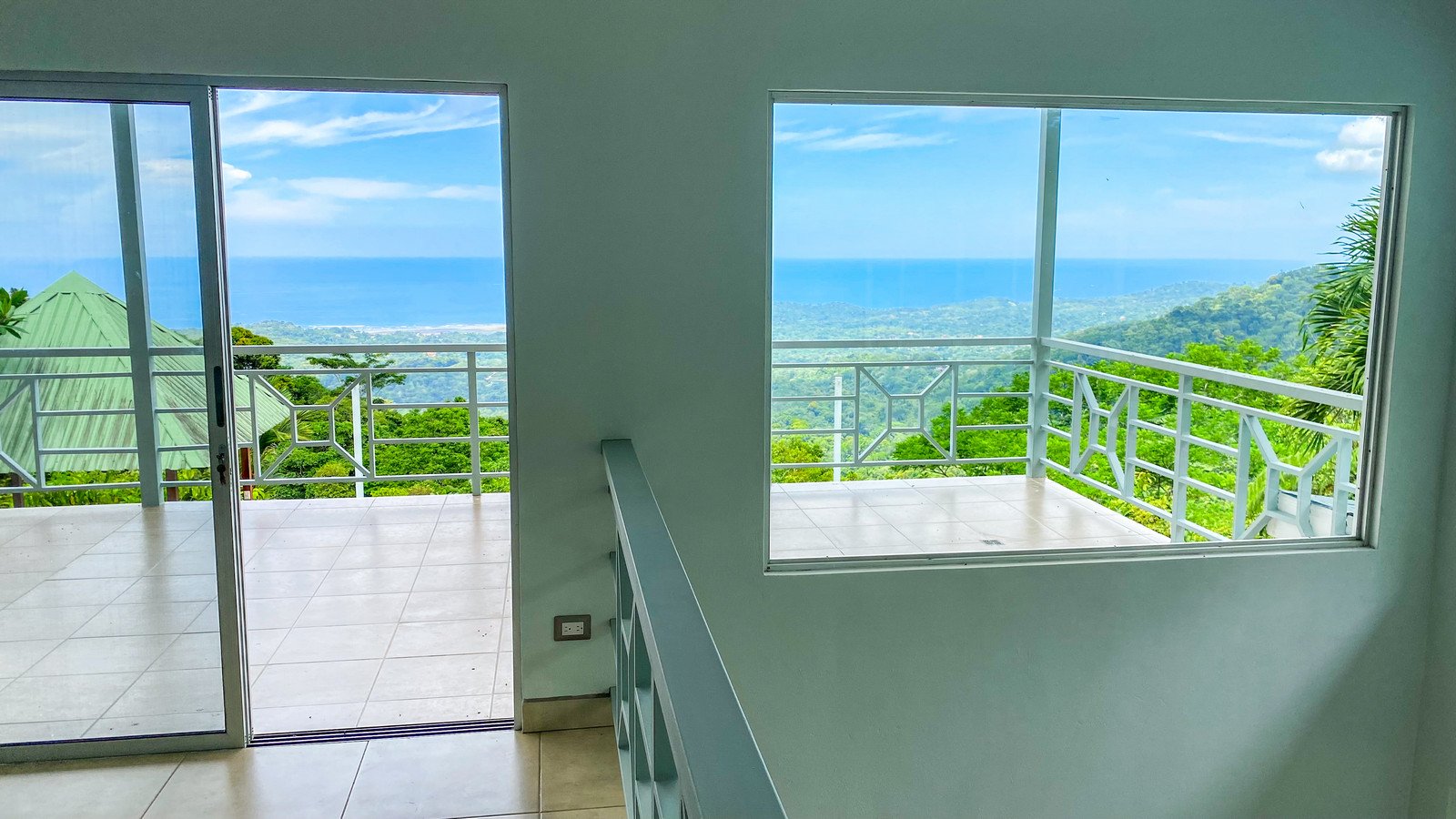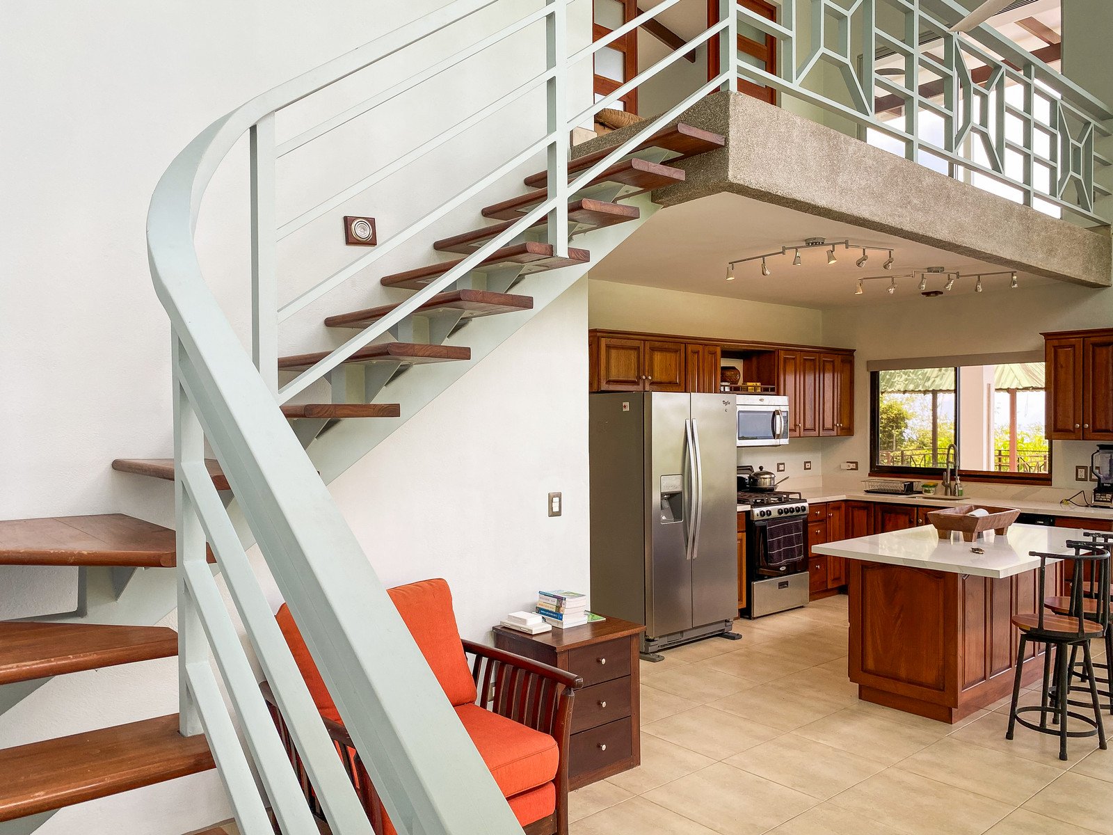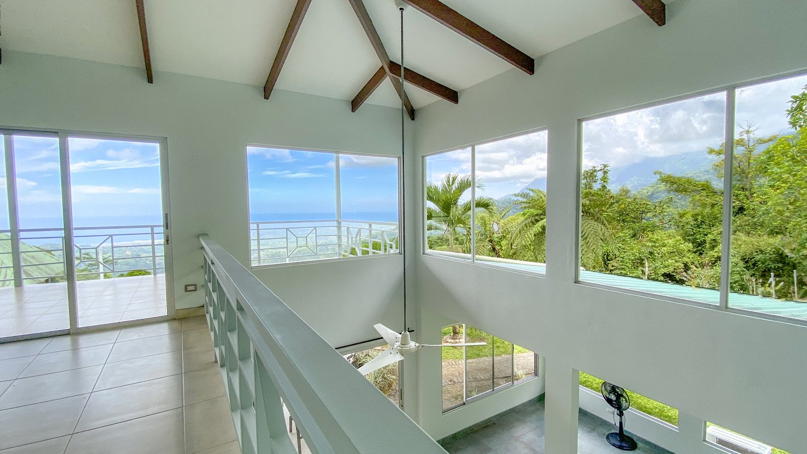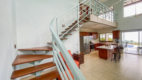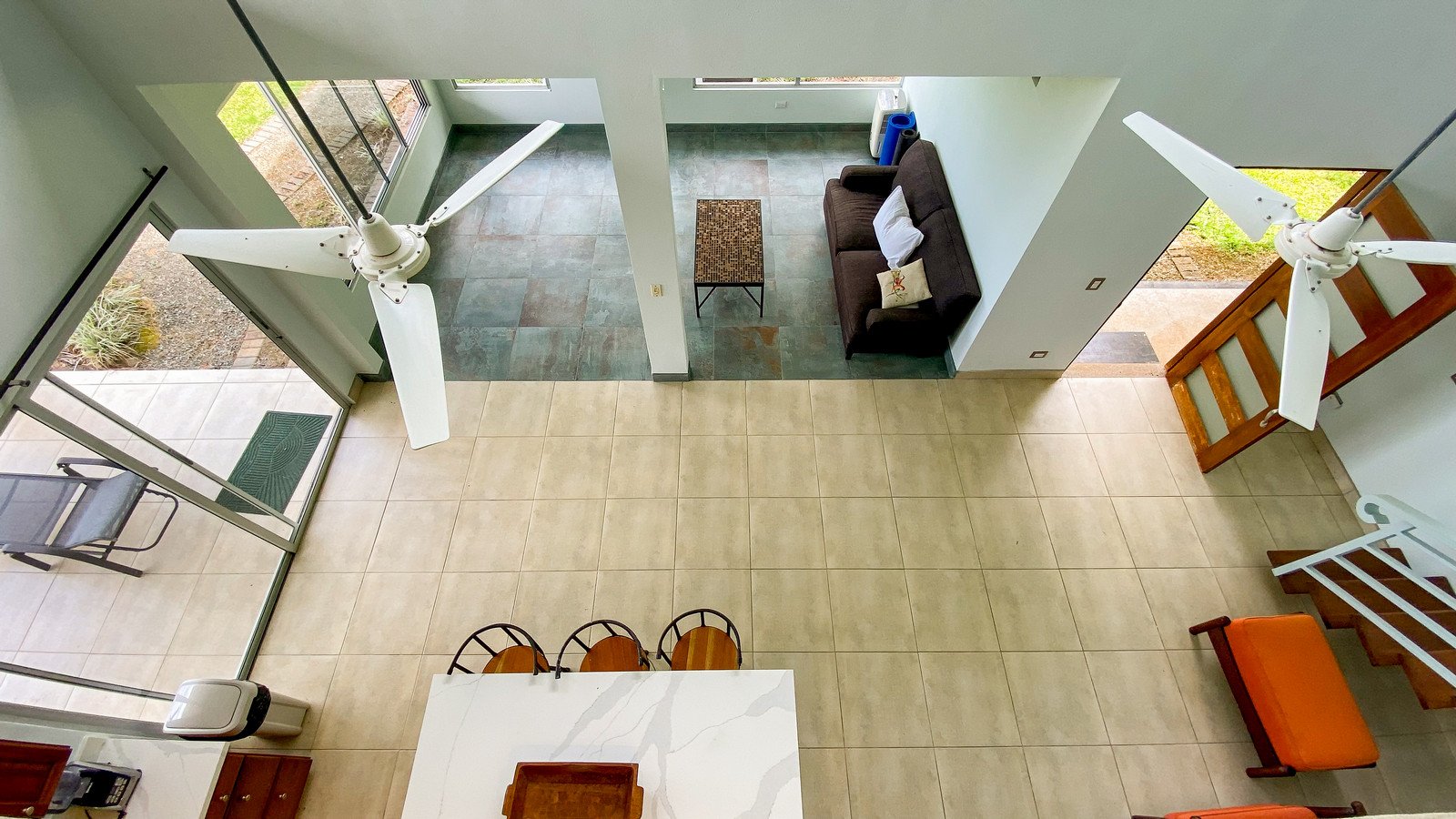 The home’s most striking feature is its lofty and soaring design with a large mezzanine opening both levels to light and spaciousness. The white walls, HUGE dominating windows and glazed sliding doors bring the glow & colours of the sky, jungles and ocean to every nook and cranny of the house. The lower levels holds a large fully equipped kitchen with a breakfast bar and adjacent space that can be used as a living or dining area. Two bedrooms are located on the ground floor with one offering sliding-door access to the patio.